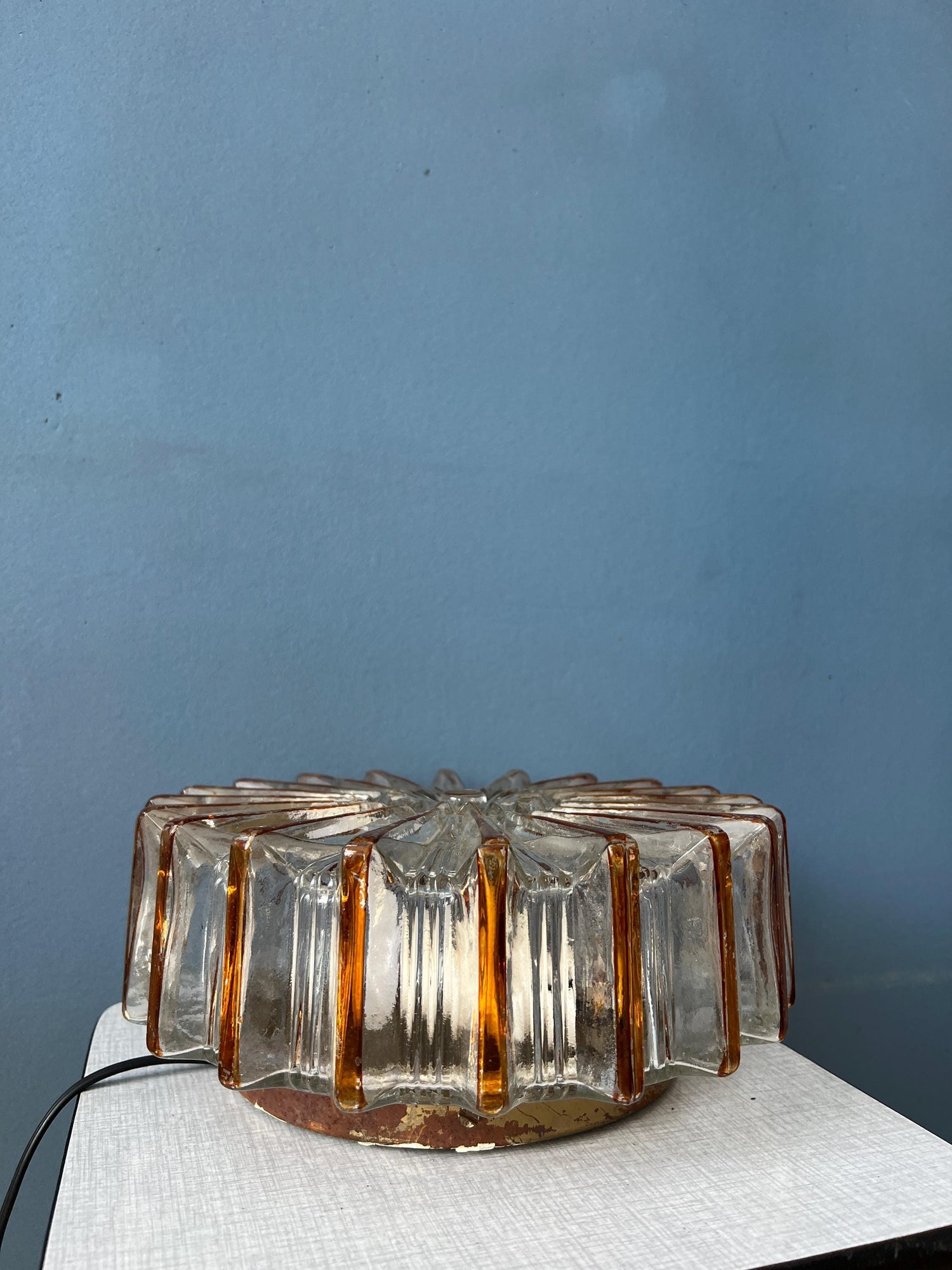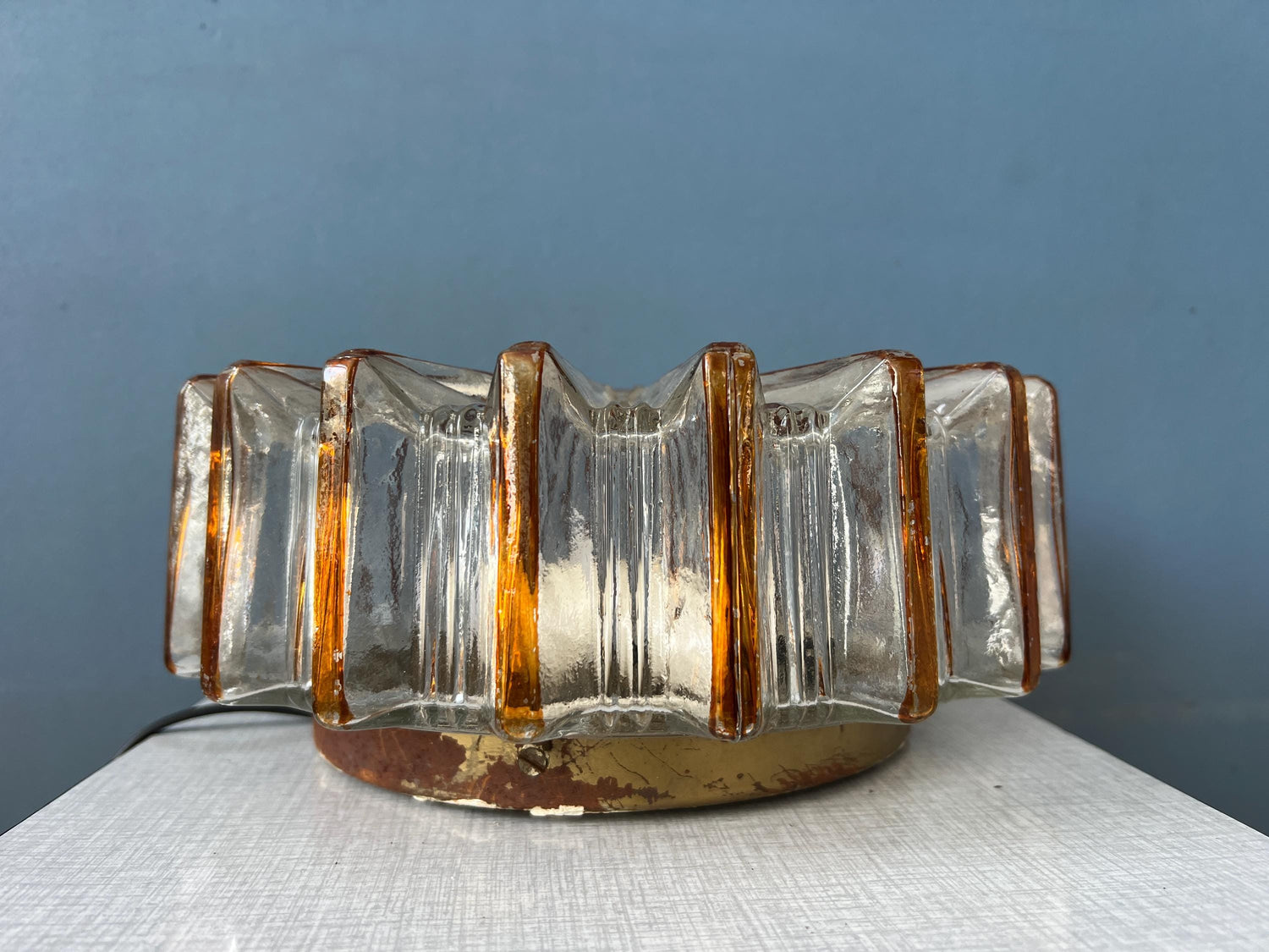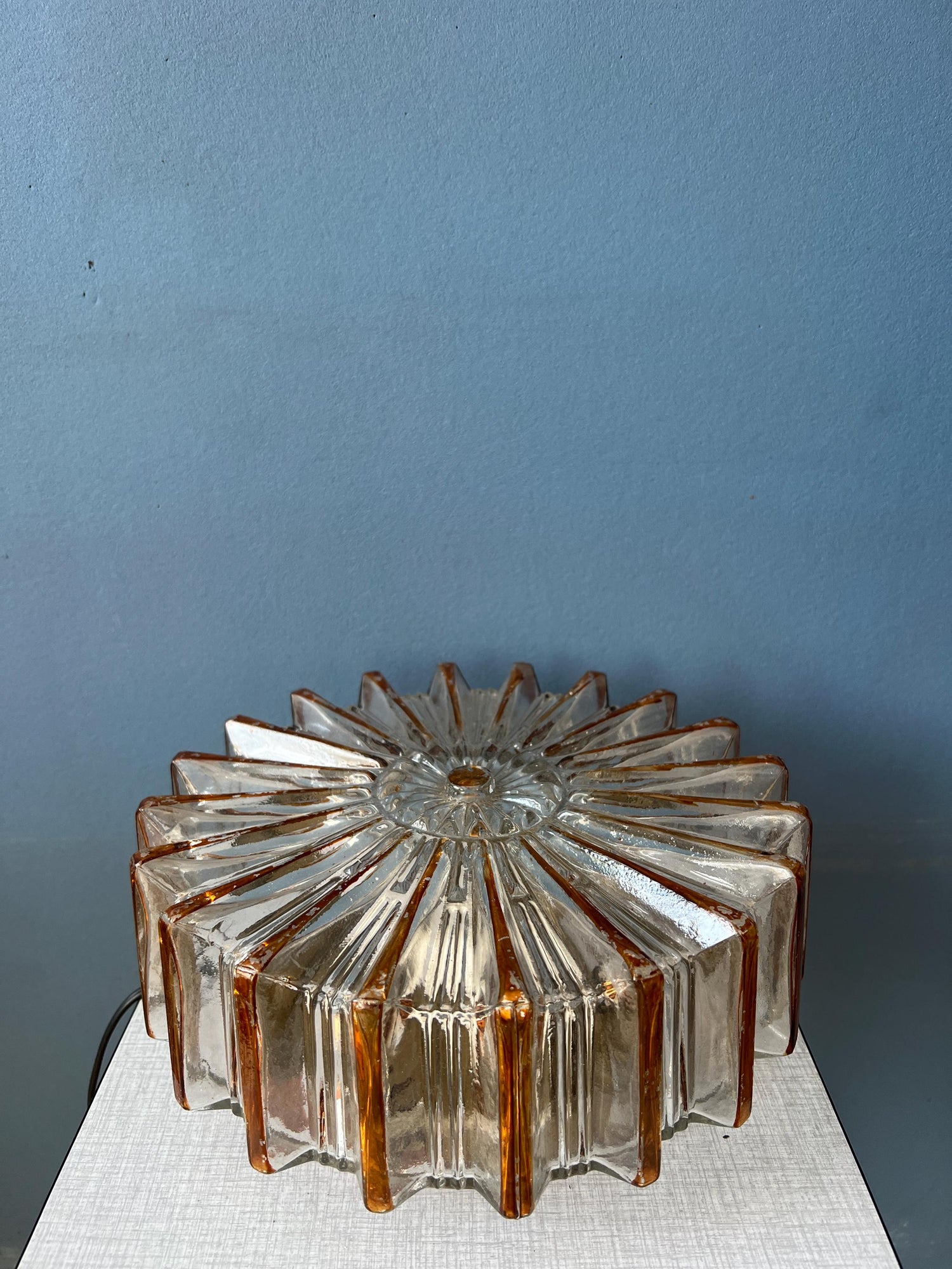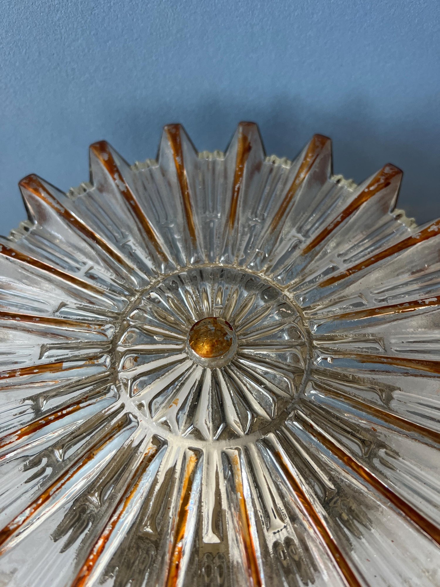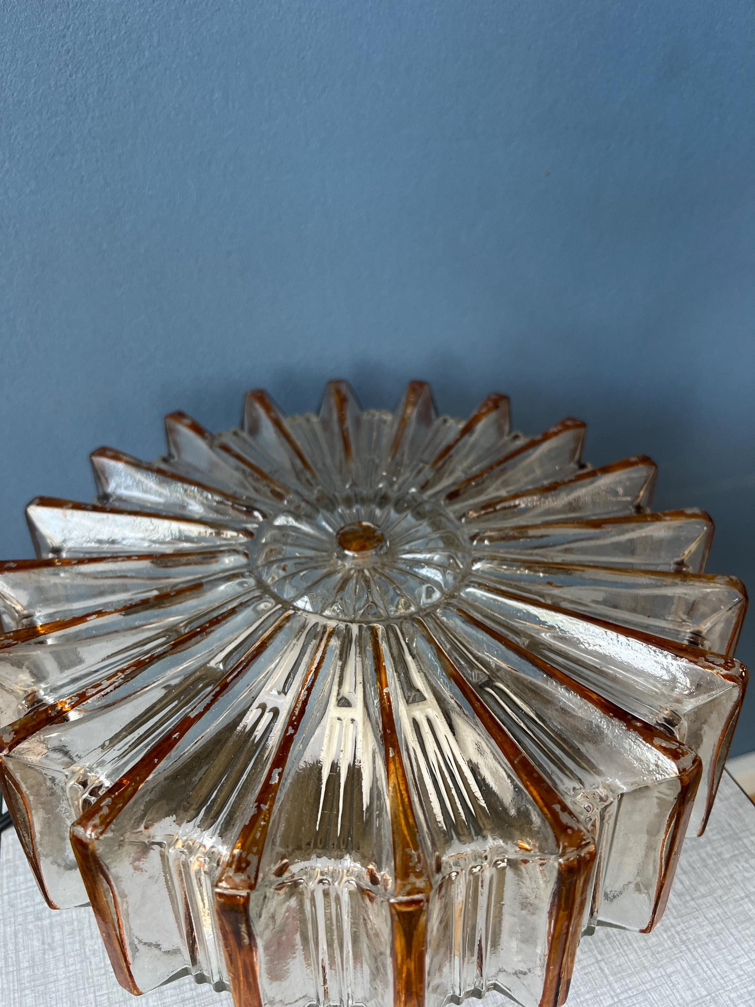 Round-shaped flush mount glass ceiling lamp by Herda. The piece is made out of thick glass and has a striped, terra-coloured pattern. The lamp requires 2 E26/27 lightbulbs and is currently hardwired.