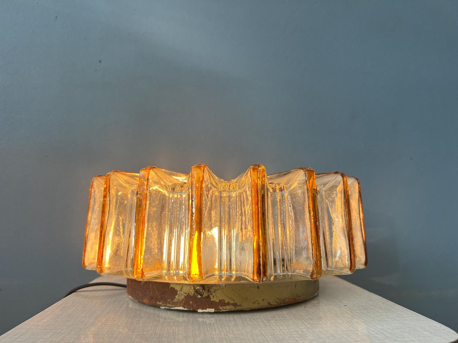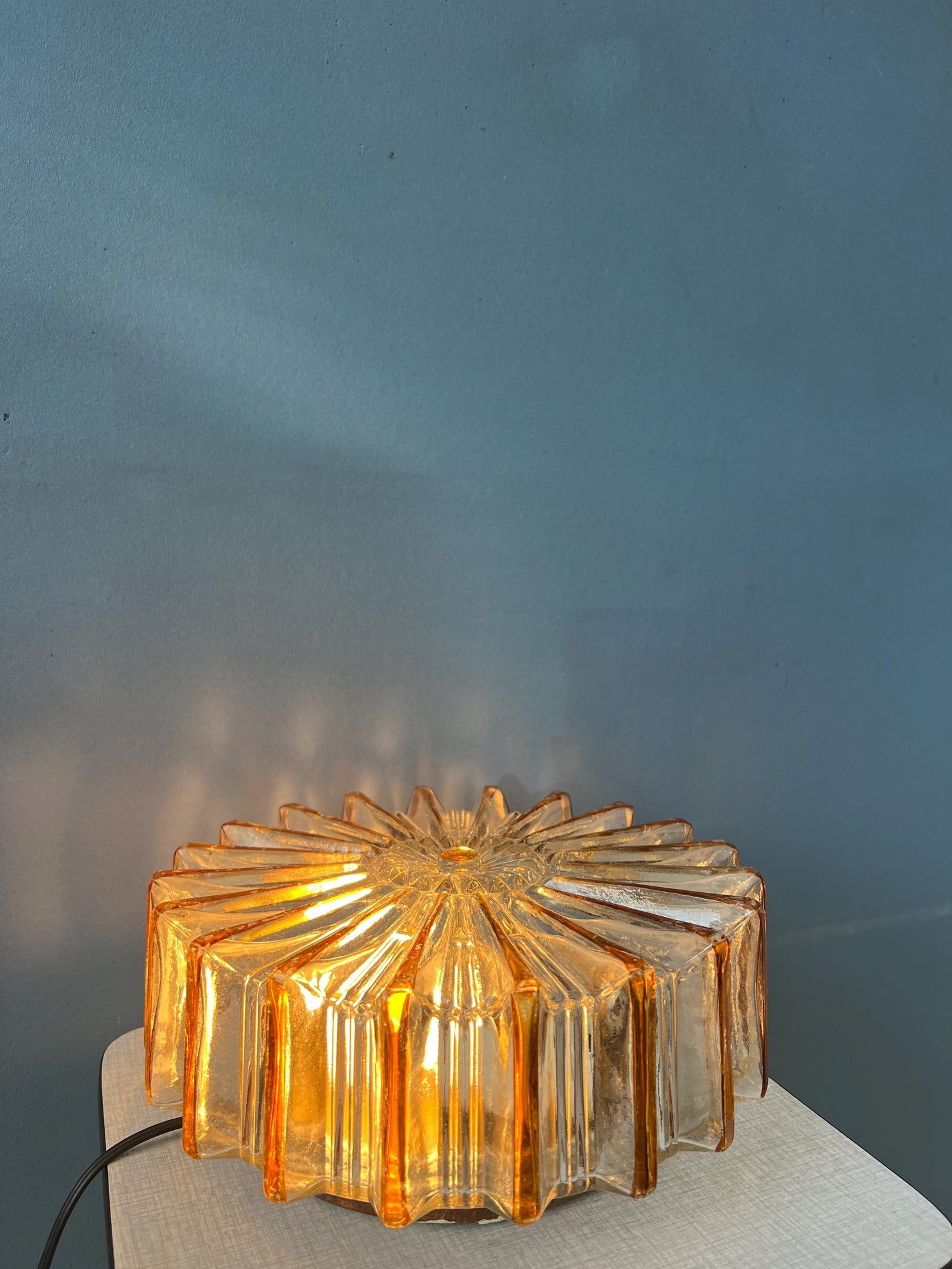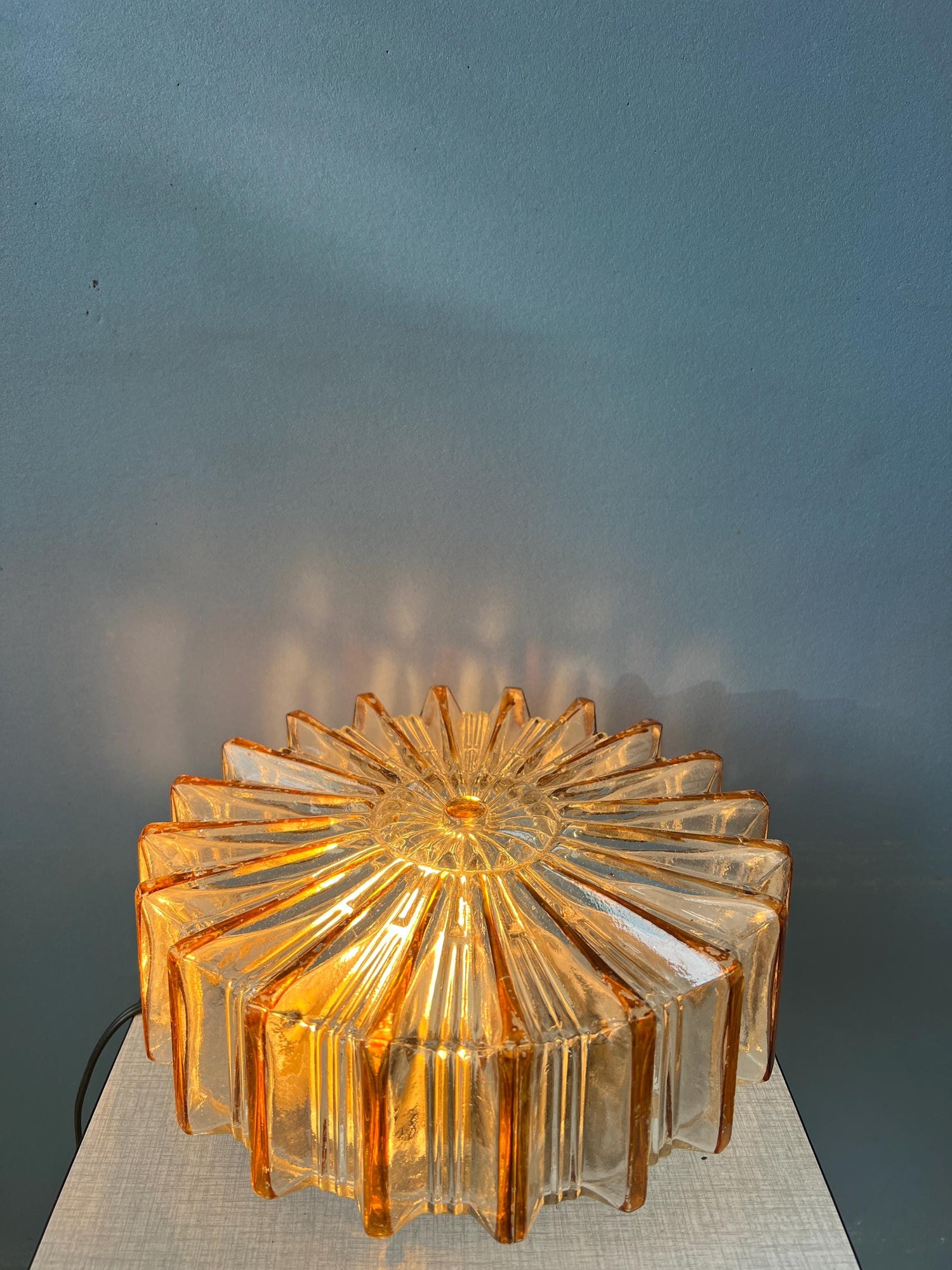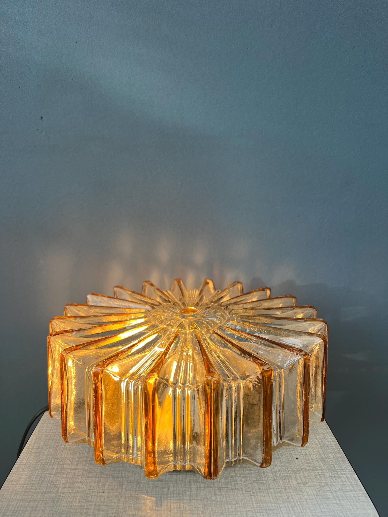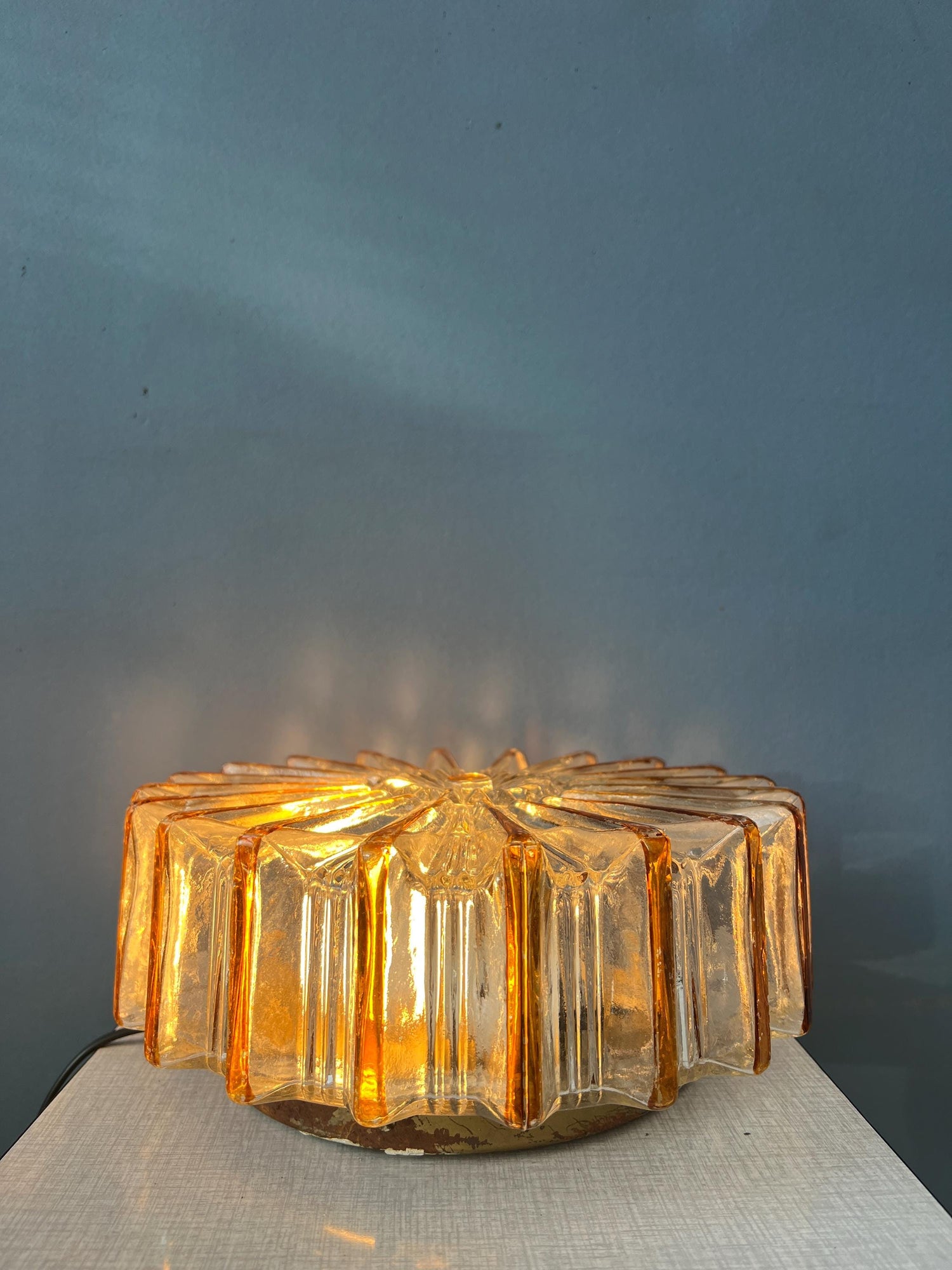Round-shaped flush mount glass ceiling lamp by Herda. The piece is made out of thick glass and has a striped, terra-coloured pattern. The lamp requires 2 E26/27 lightbulbs and is currently hardwired.