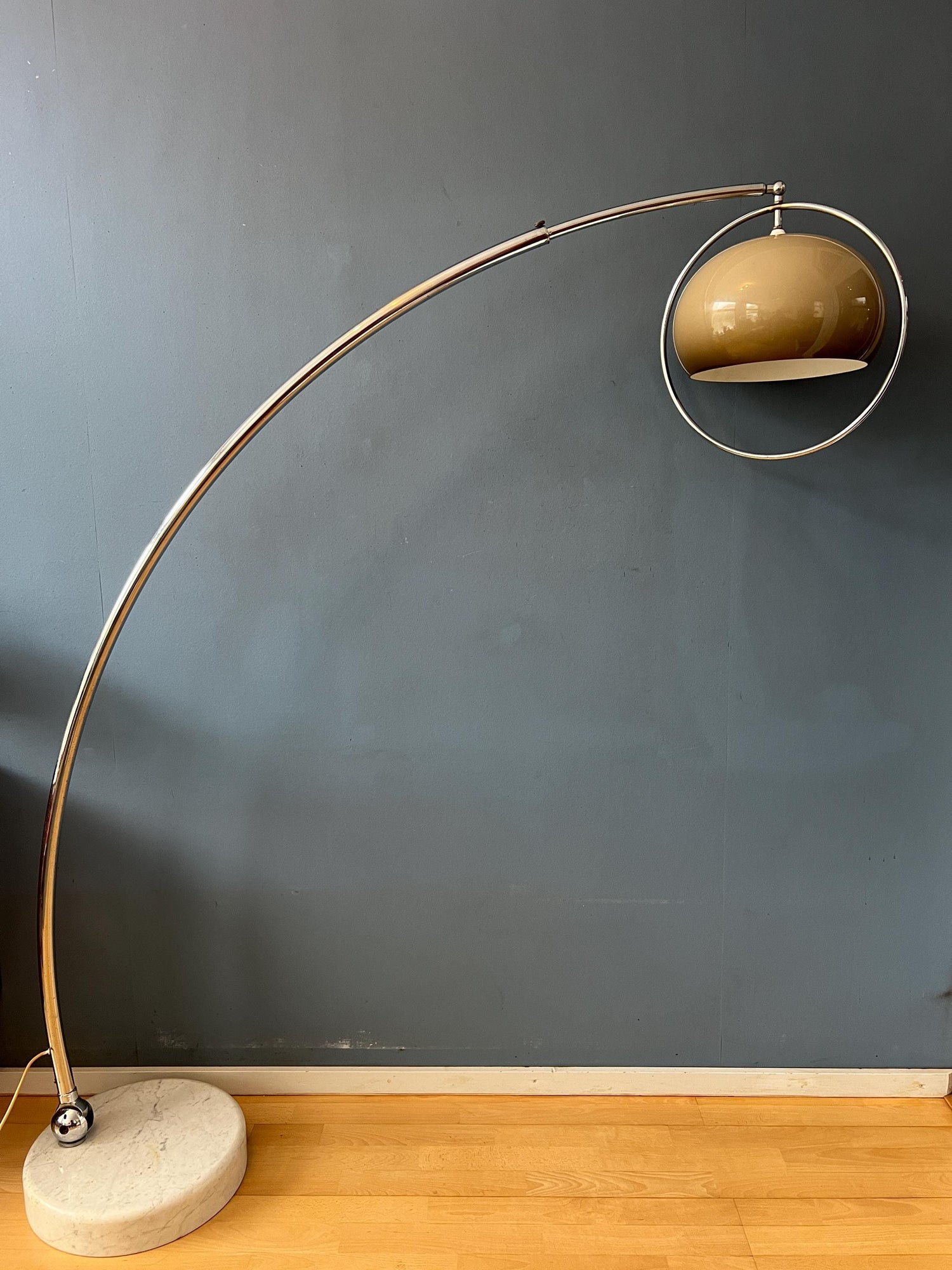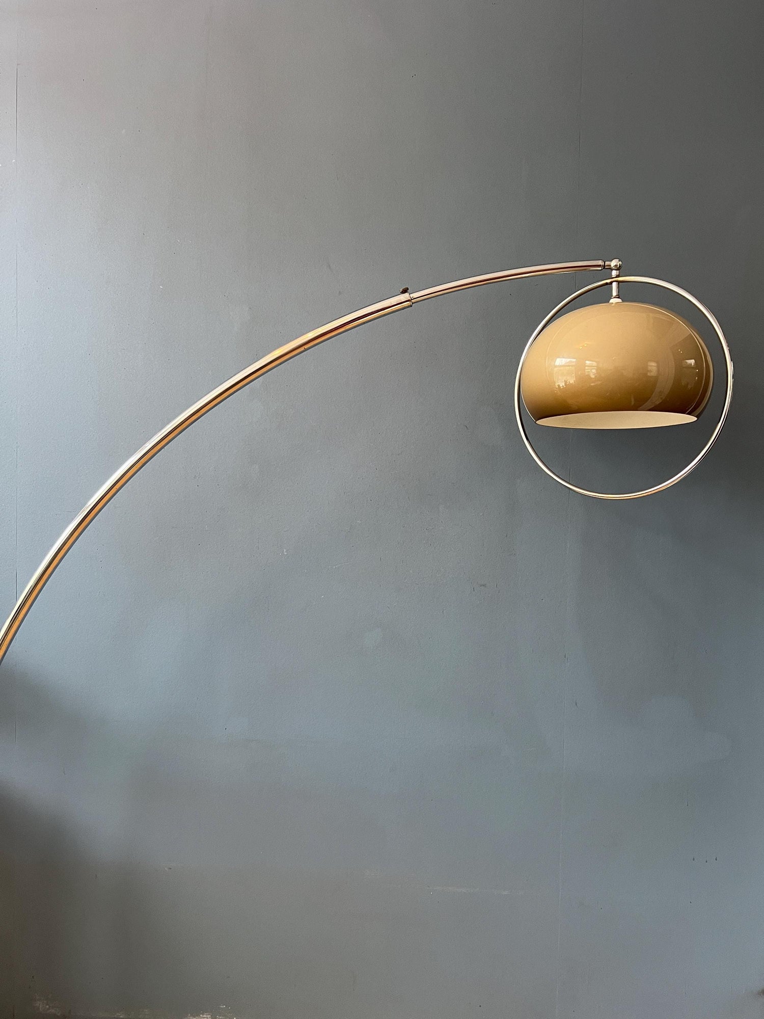 Very rare Italian space age arc floor lamp with beige shade attributed to Guzzini. The acrylic glass mushroom shade produces a delicate, warm glow. The lamp has a heavy marble base. The height/length of the lamp can be adjusted with its extendable arm. Also the angle of the arc itself can be completely be readjusted with the mechanism at the base. The lamp requires one E26/27 (standard) lightbulb and currently has an EU-plug (easily used outside EU with plug-converter).