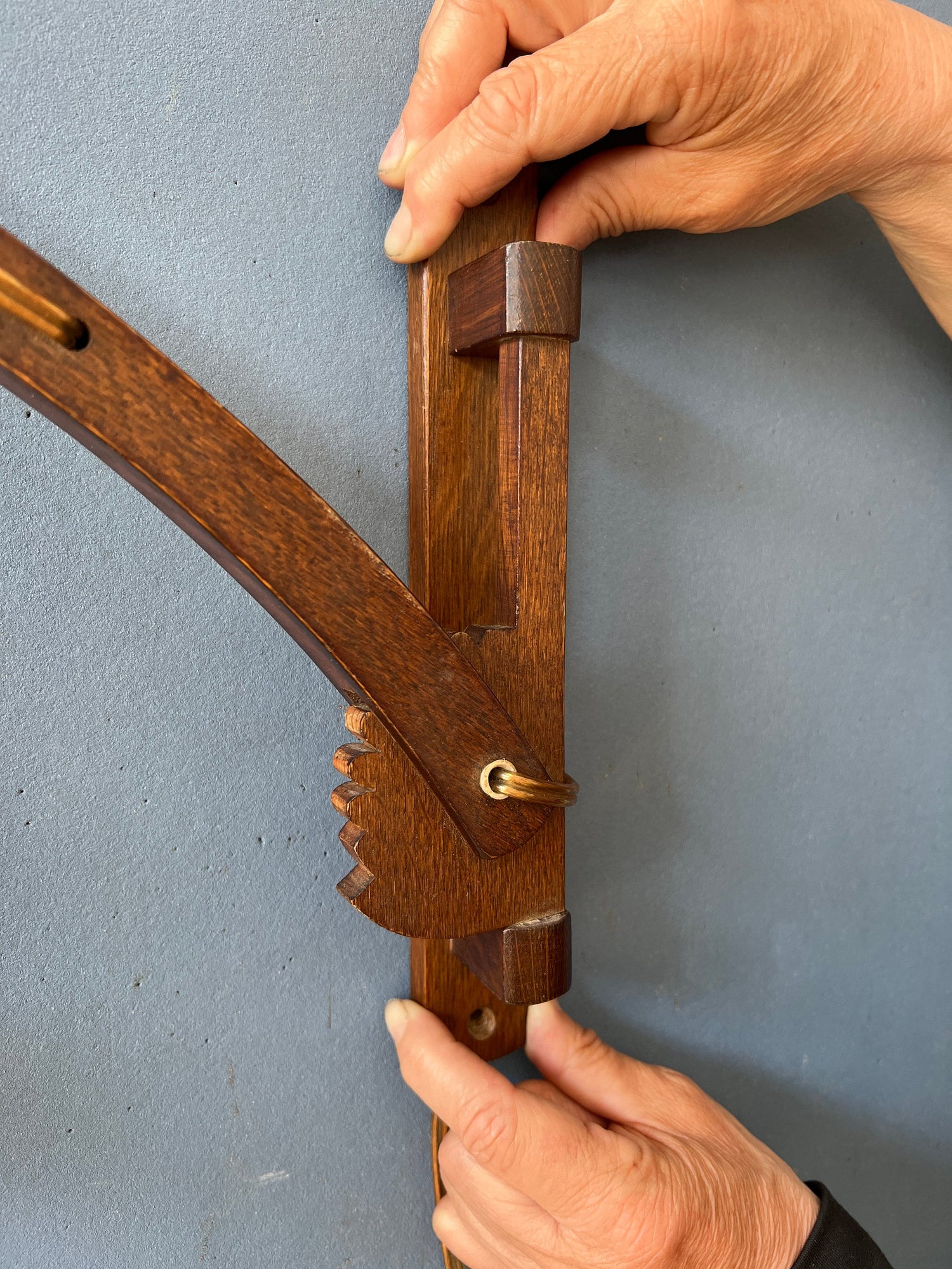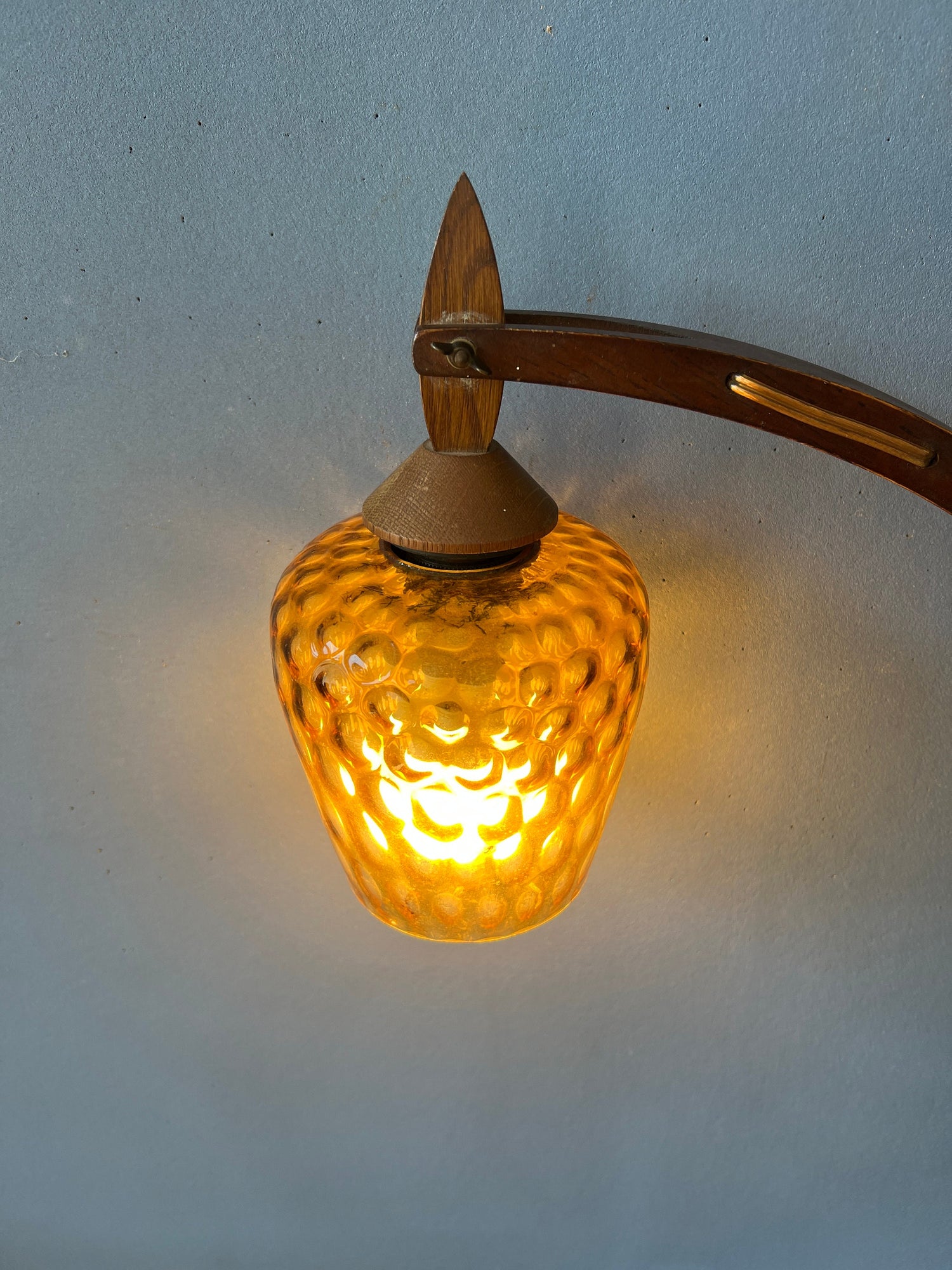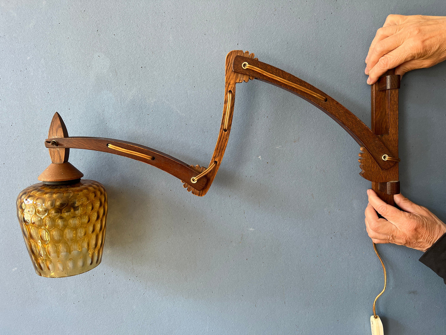 One of a kind mid century wall lamp with wooden frame and glass shade. The wooden arm can be extended by adjusting the small arms. It can stretch out all the way. The lamp requires an E27 (standard) lightbulb and currently has an EU-plug.