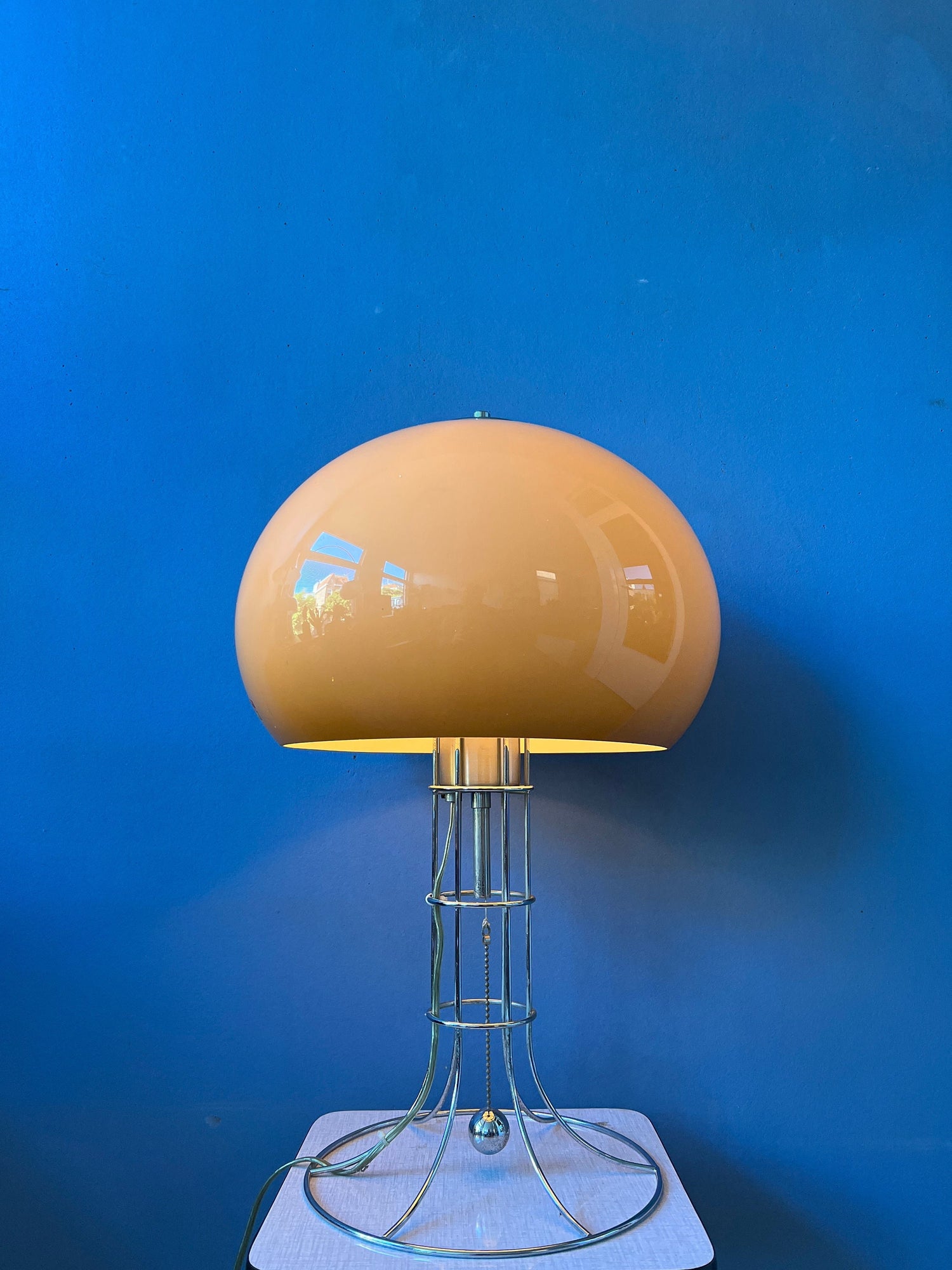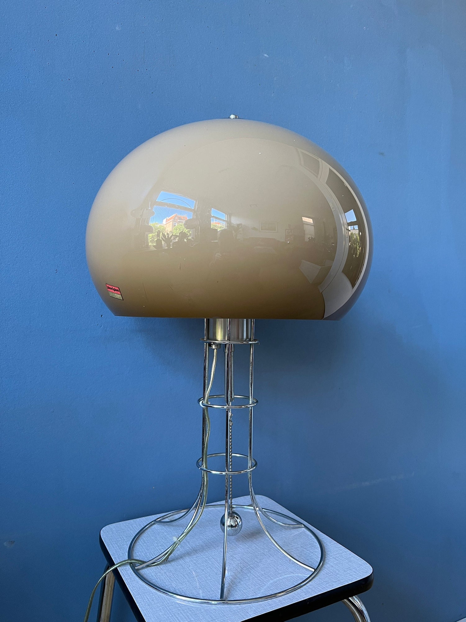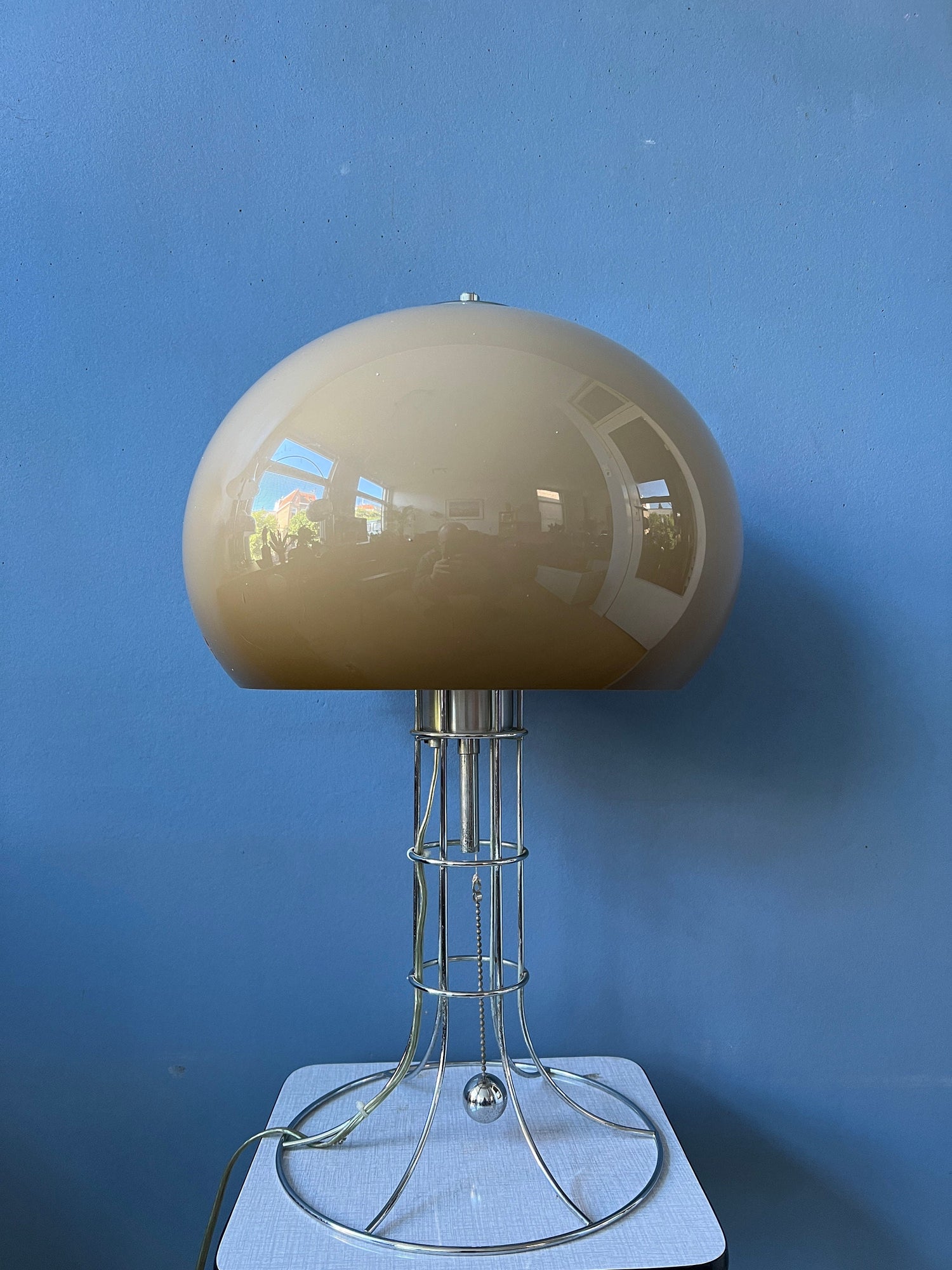 Herda's most famous, big mushroom table lamp. The lamp consists of a mocca-coloured mushroom shade and has a beautiful skeleton-like chrome frame. The lamp has a chrome cord in the middle of the base that allows you to switch the light on and off. The lamps requires one E27 (standard) lightbulb and currently has an EU-plug.