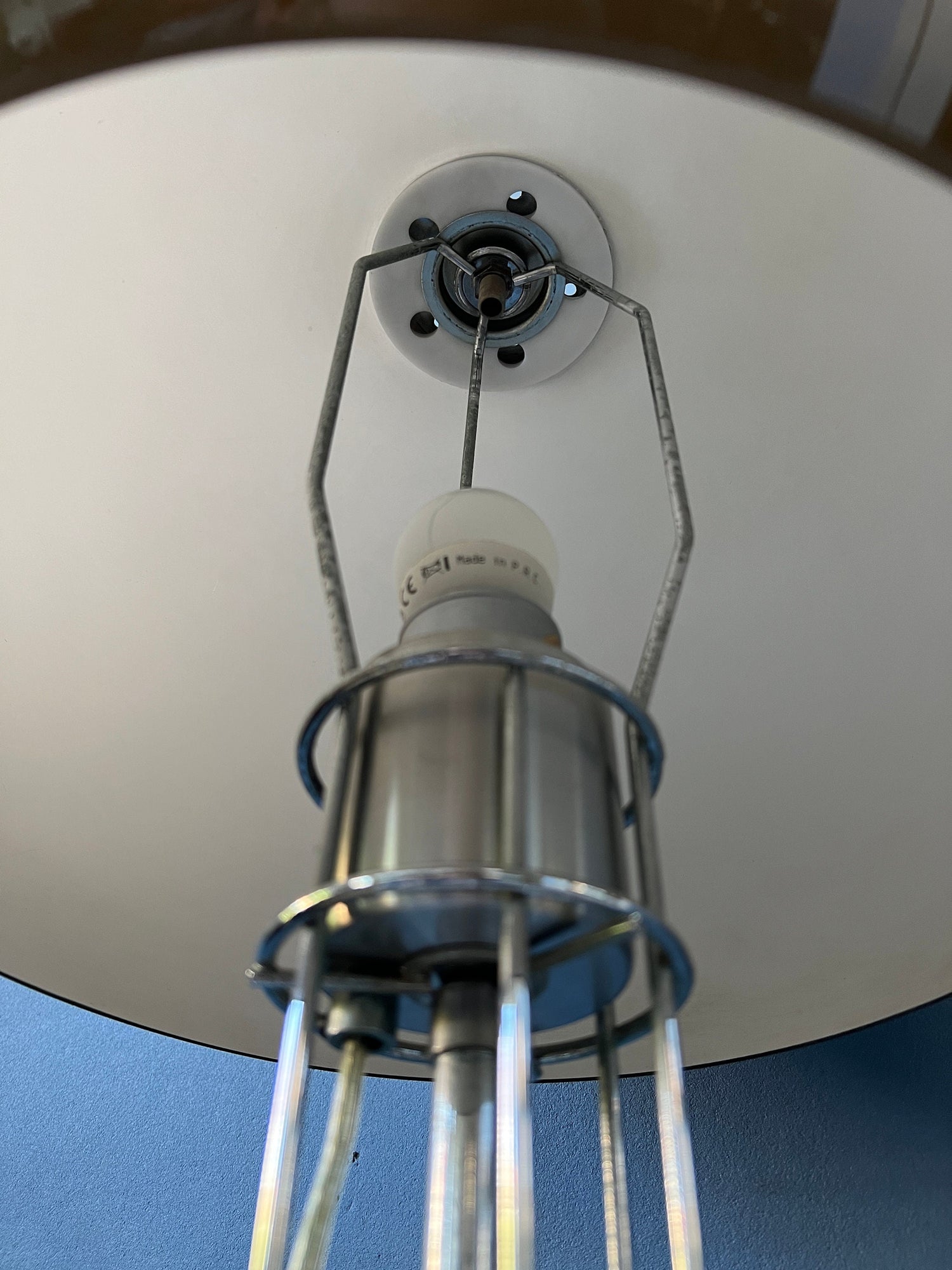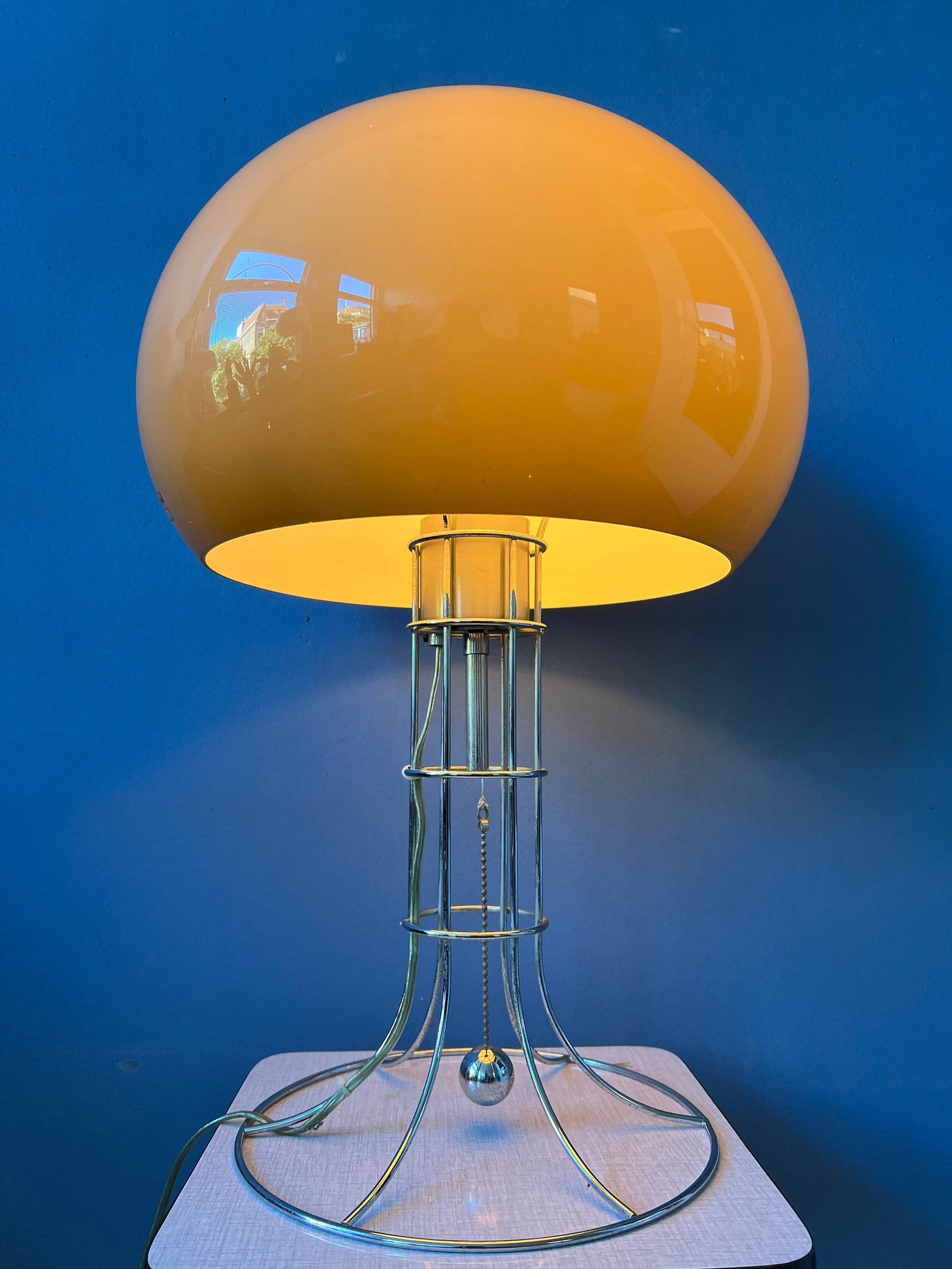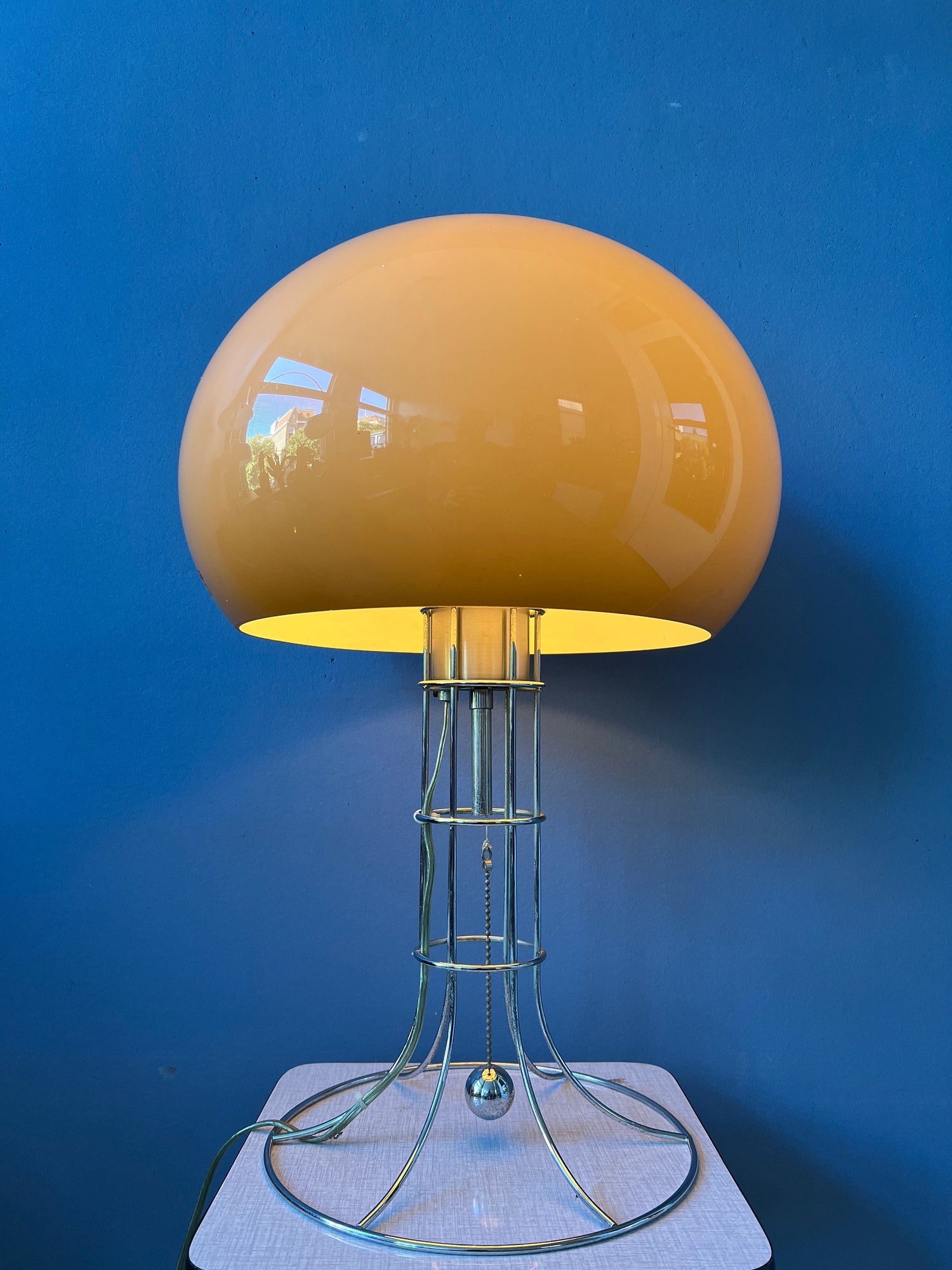 Herda's most famous, big mushroom table lamp. The lamp consists of a mocca-coloured mushroom shade and has a beautiful skeleton-like chrome frame. The lamp has a chrome cord in the middle of the base that allows you to switch the light on and off. The lamps requires one E27 (standard) lightbulb and currently has an EU-plug.