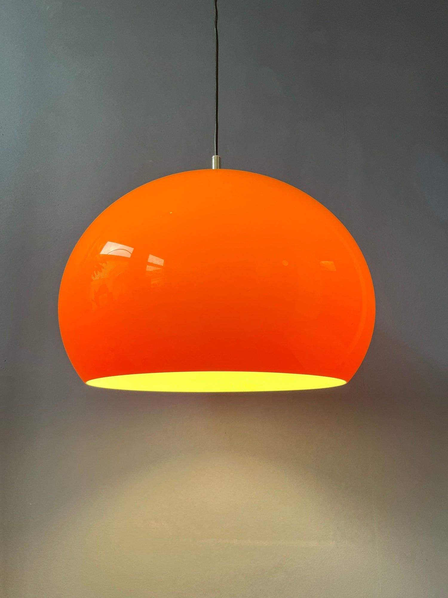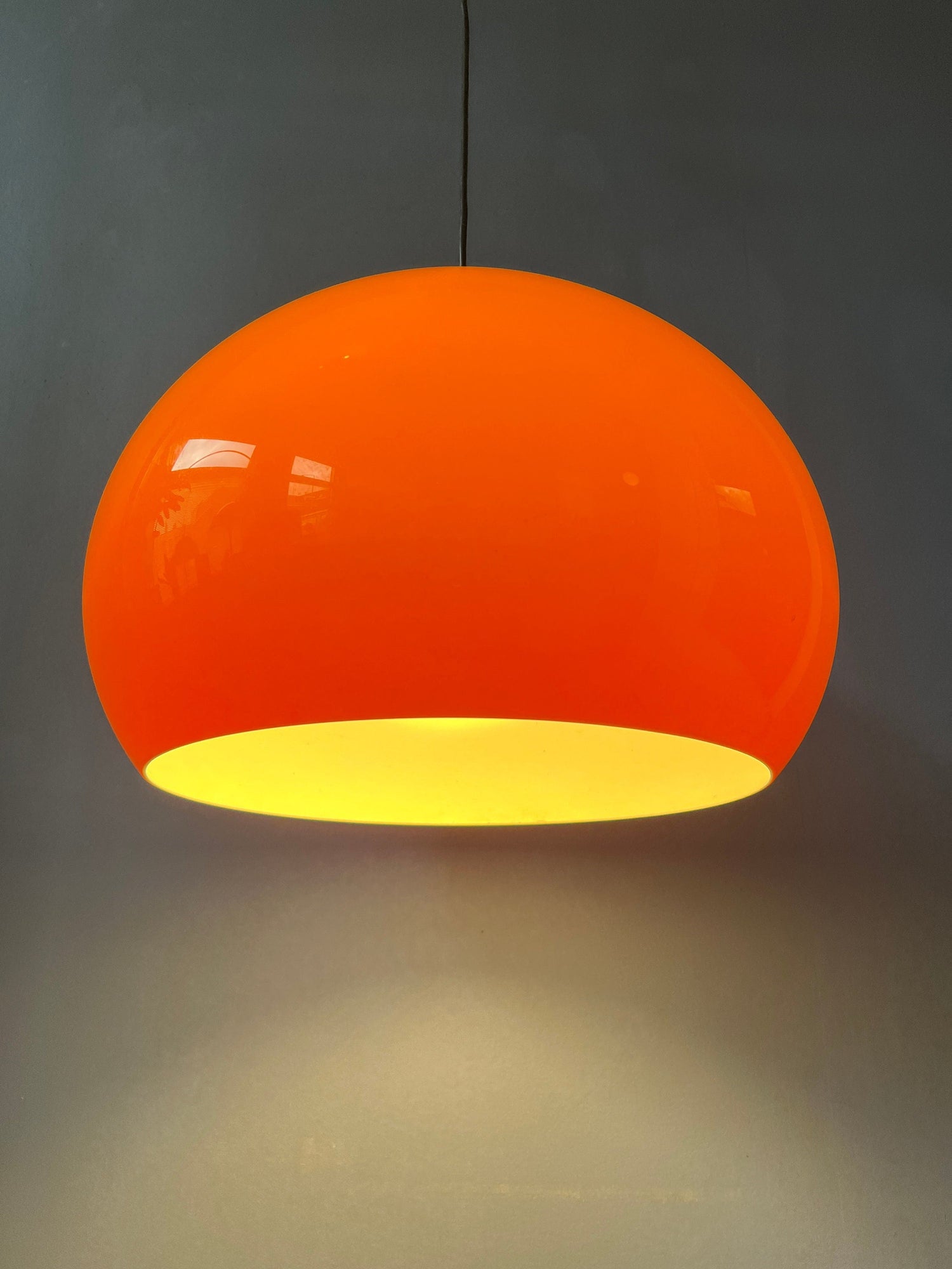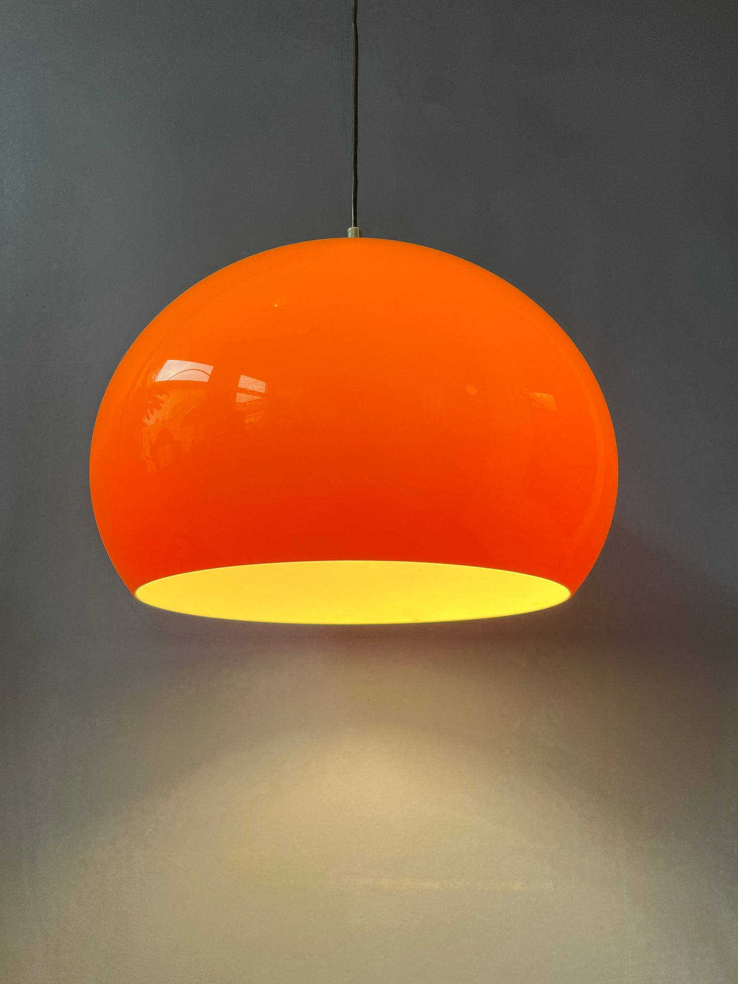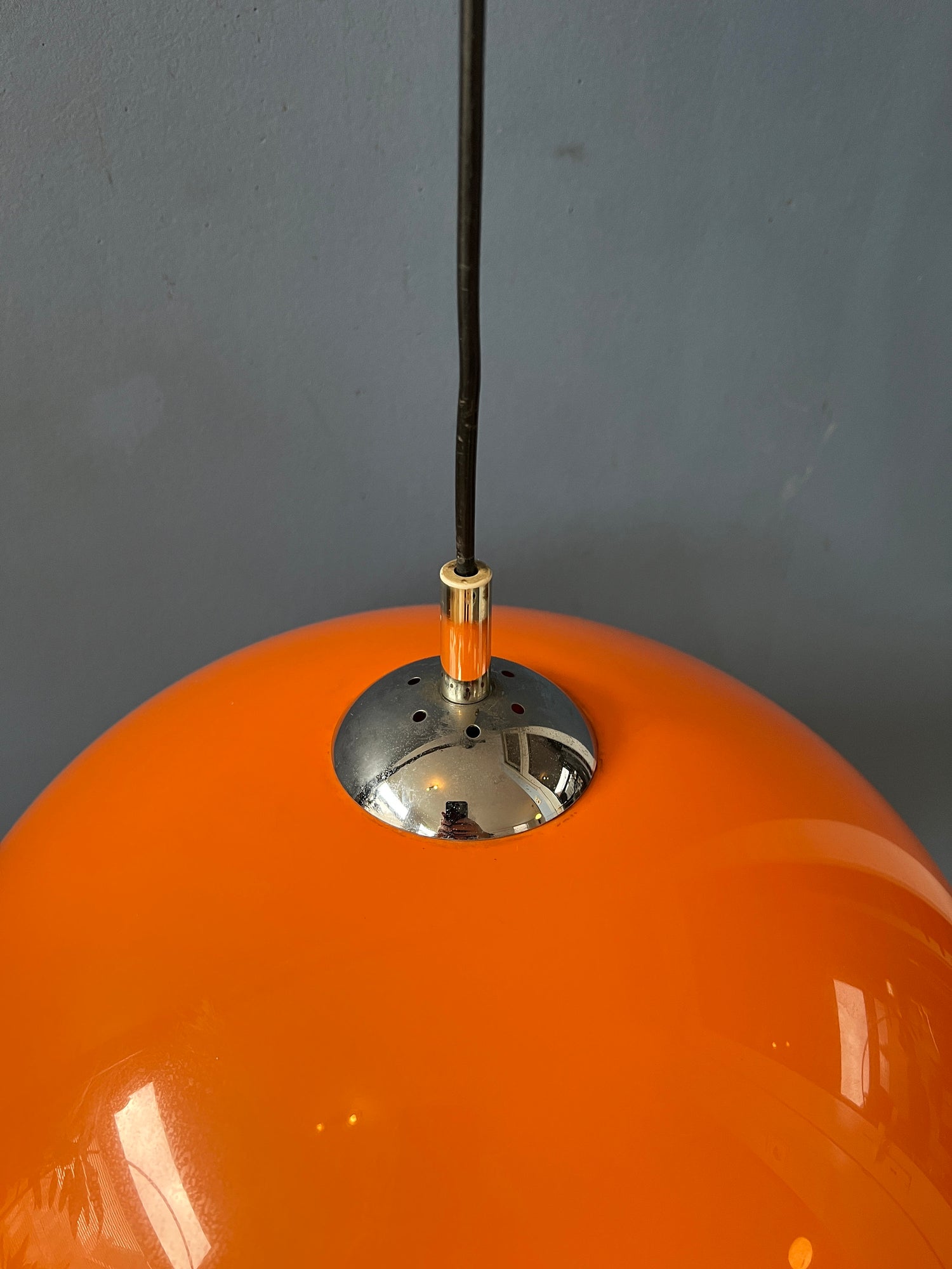 Orange space age mushroom pendant lamp. The mushroom shade is made out of acrylic glass and produces a warm, cosy light. The lamp requires one E27/26 (standard) lightbulb.