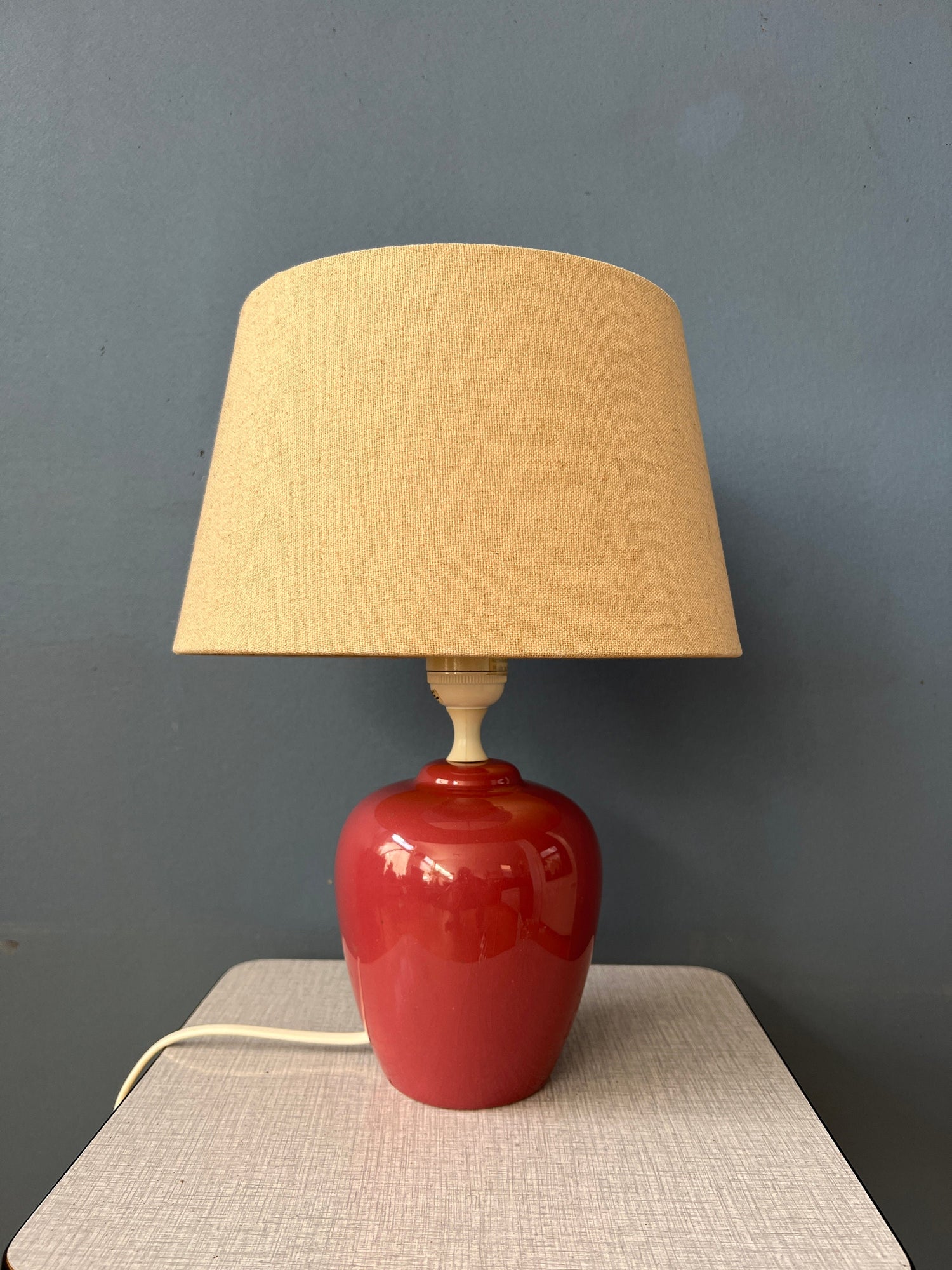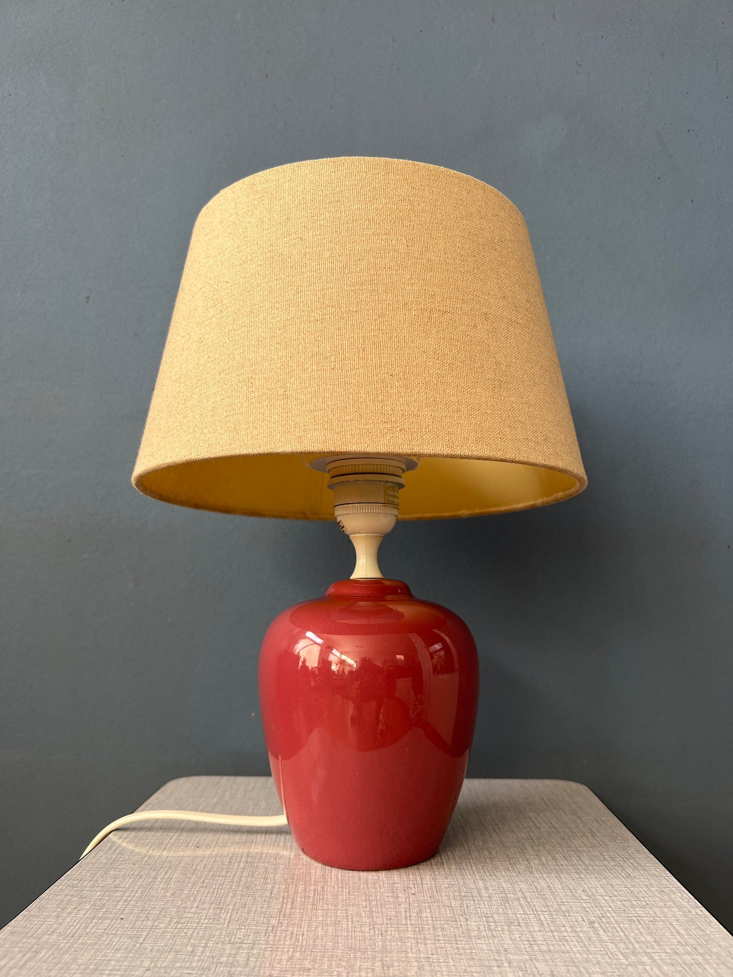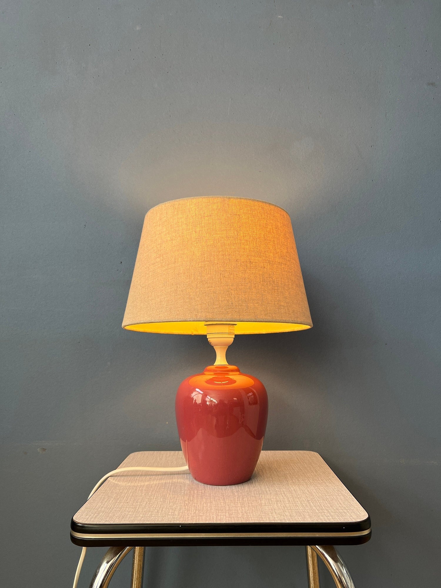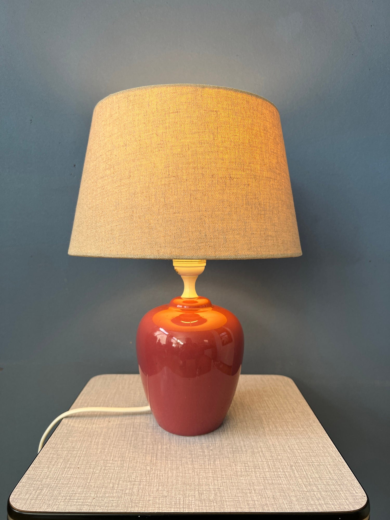 Eclectic ceramic table lamp with pink/purple terracota base and beige textile shade. The lamp requires one E27 lightbulb and currently has an EU-plug.