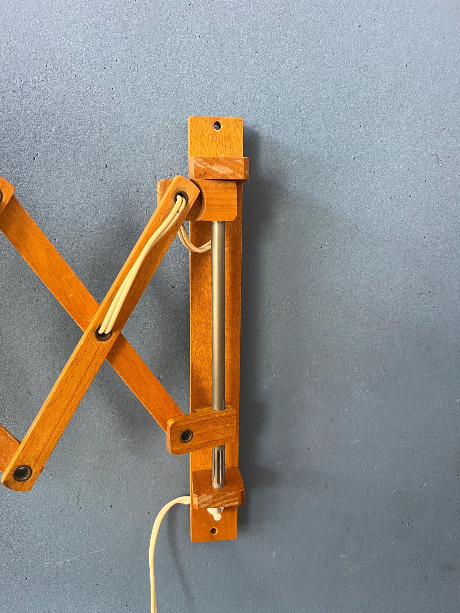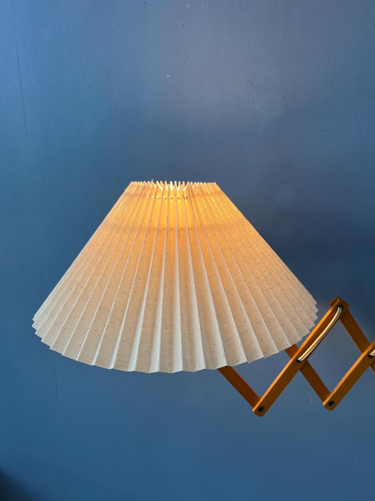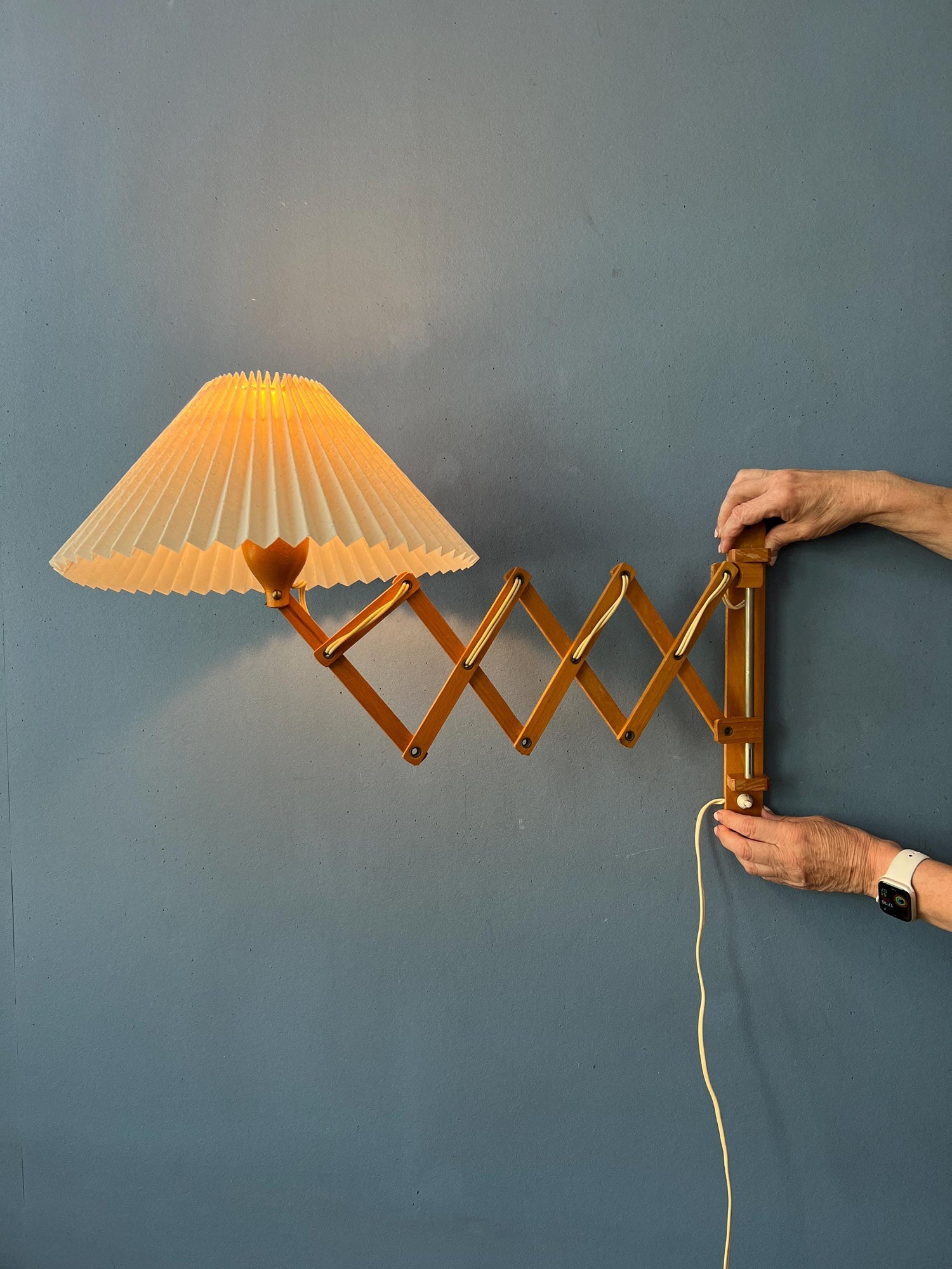 Danish style teak wood scissor lamp with wooden frame and newly added pleated shade. The scissor-mechanism allows you to extend the lamp from the wall. The angle of the shade itself can be adjusted too. The scissor arm can swivel left and right from the wall mount. The lamp requires an E27/26 (standard) lightbulb and currently has an EU-plug (usable outside EU with plug-converter).