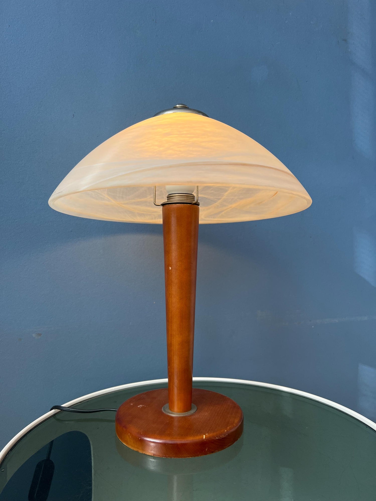 Post modern table lamp with big patterned glass shade and wooden base. The lamp requires one E27/26 lightbulb and currently has an EU-plug.