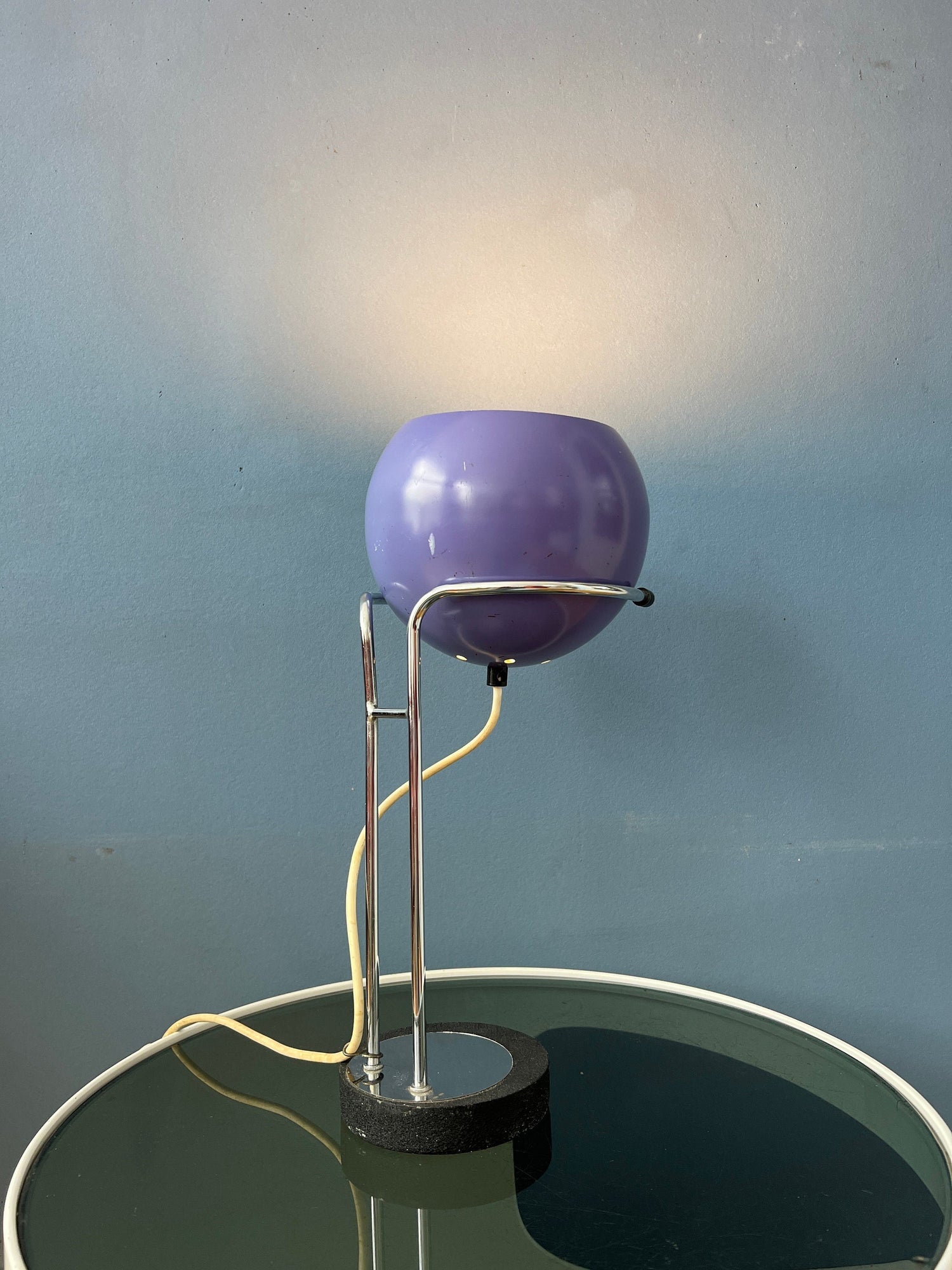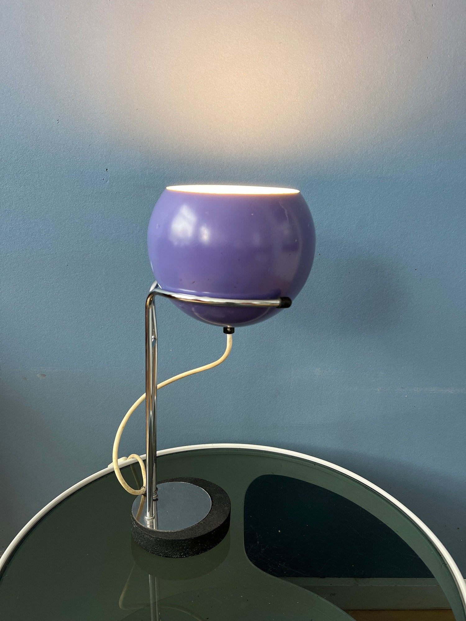 Rare purple space age eyeball desk lamp by the Dutch company Herda. The shade can be positioned in any way desirable (up, down, left, right). The lamp requires an E27 bulb and currently has an European plug (easily used with plug-converter in US and outside EU).