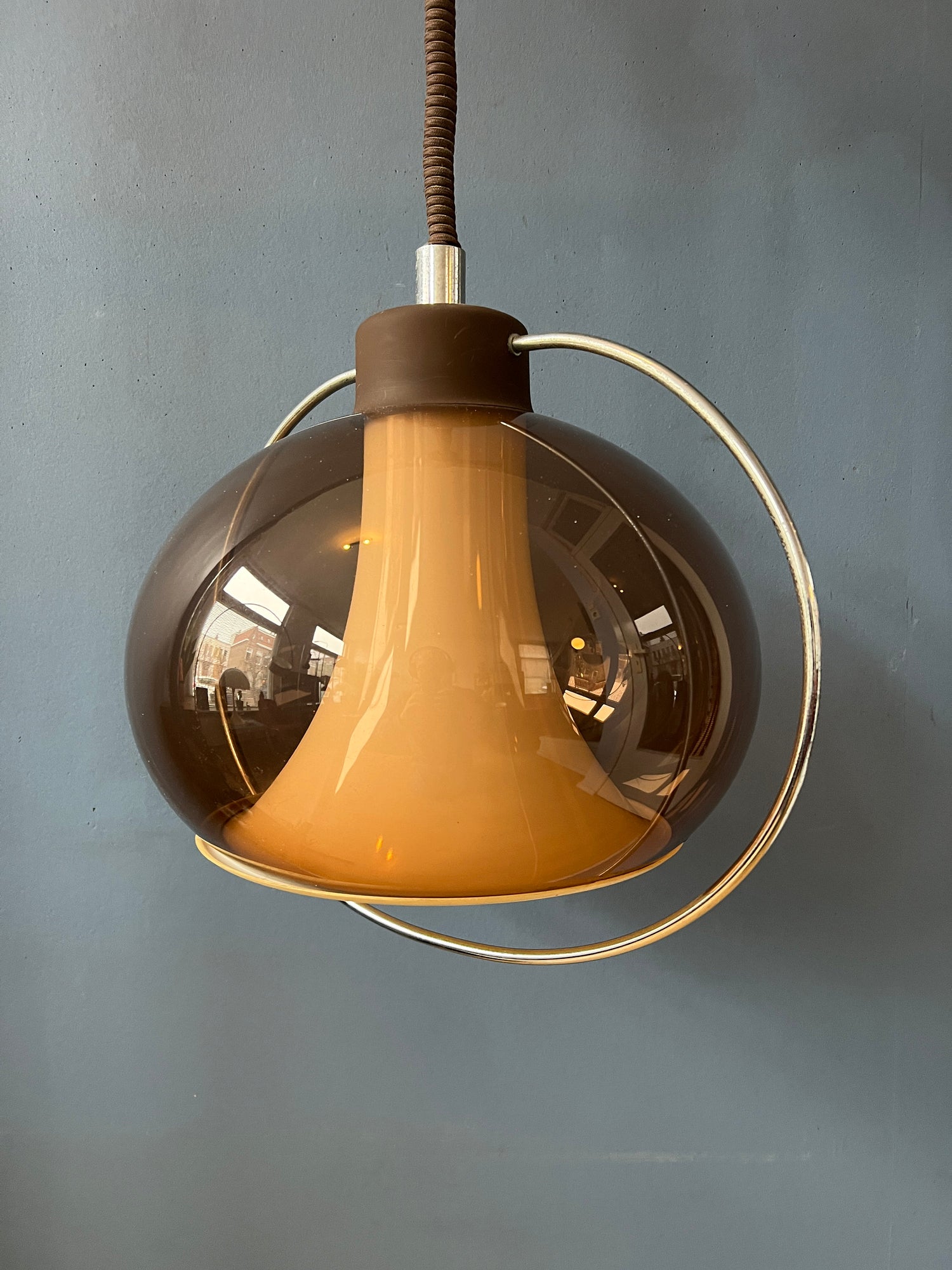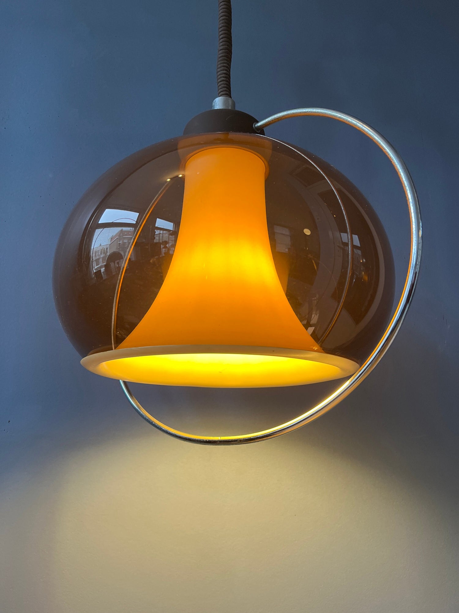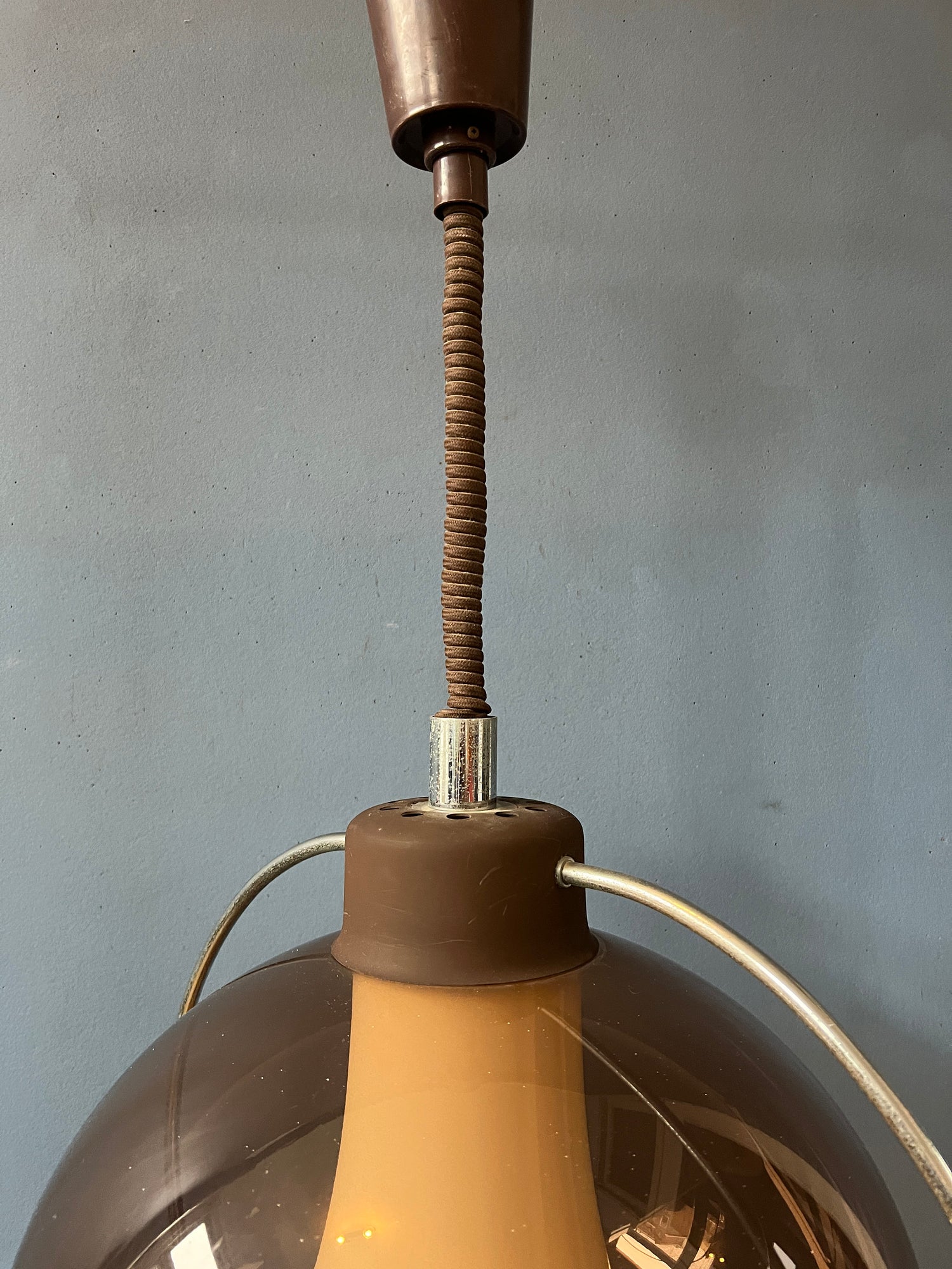 Very rare space age pendant lamp by Dijkstra with acrylic glass outer shade and aluminium inner shade. The outer shade is transparent and has a copper-like colour. The height of the lamp can be easily adjusted with the rise-and-fall mechanism. The lamp requires one E26/27 lightbulb.