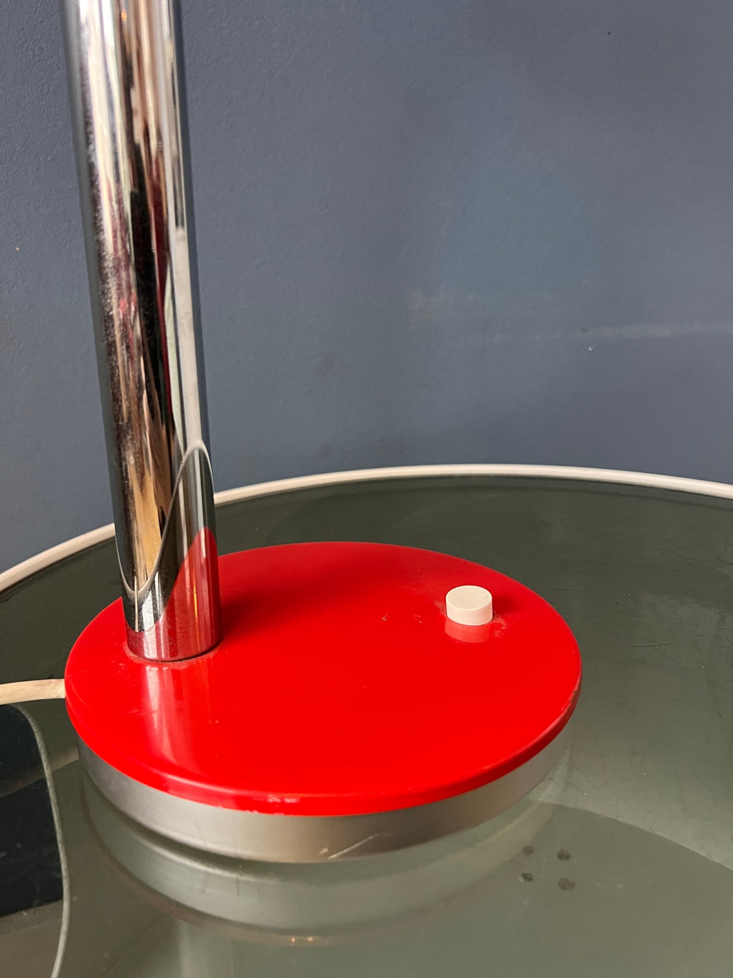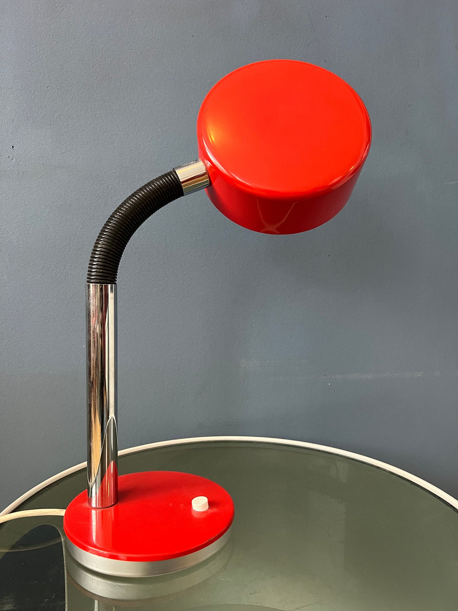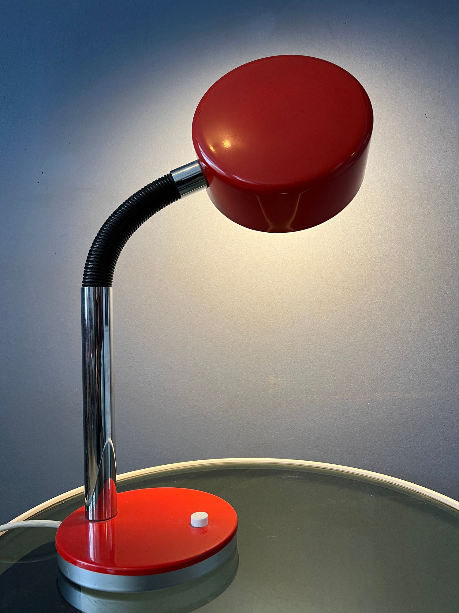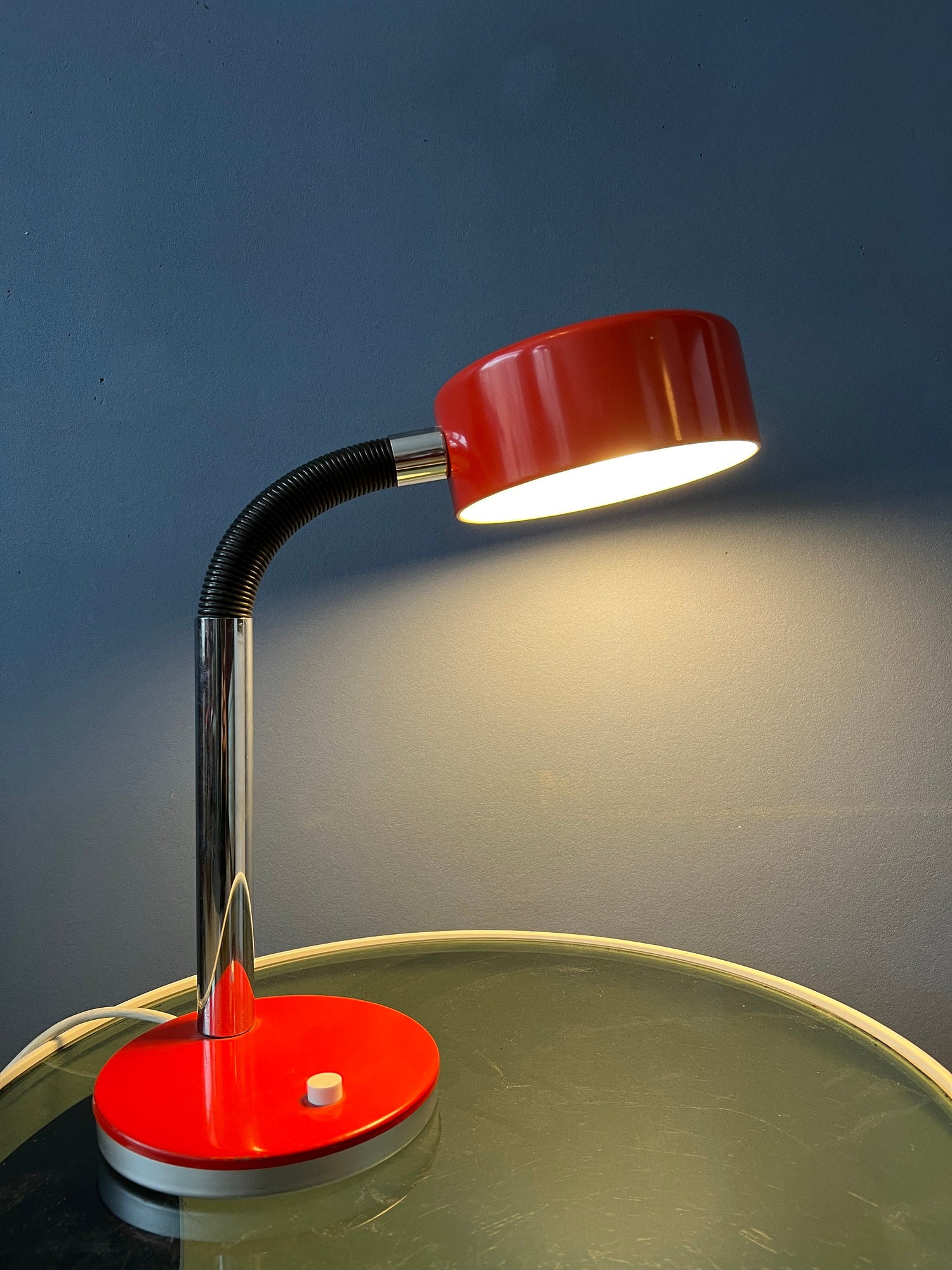 Big red Cosack space age table lamp with flexible arm. The arm and shade can be positioned in any way desirable, see pictures. Also the shade itself be repositioned. The lamp requires one E27/26 (standard) lightbulb and currently has an EU plug.
