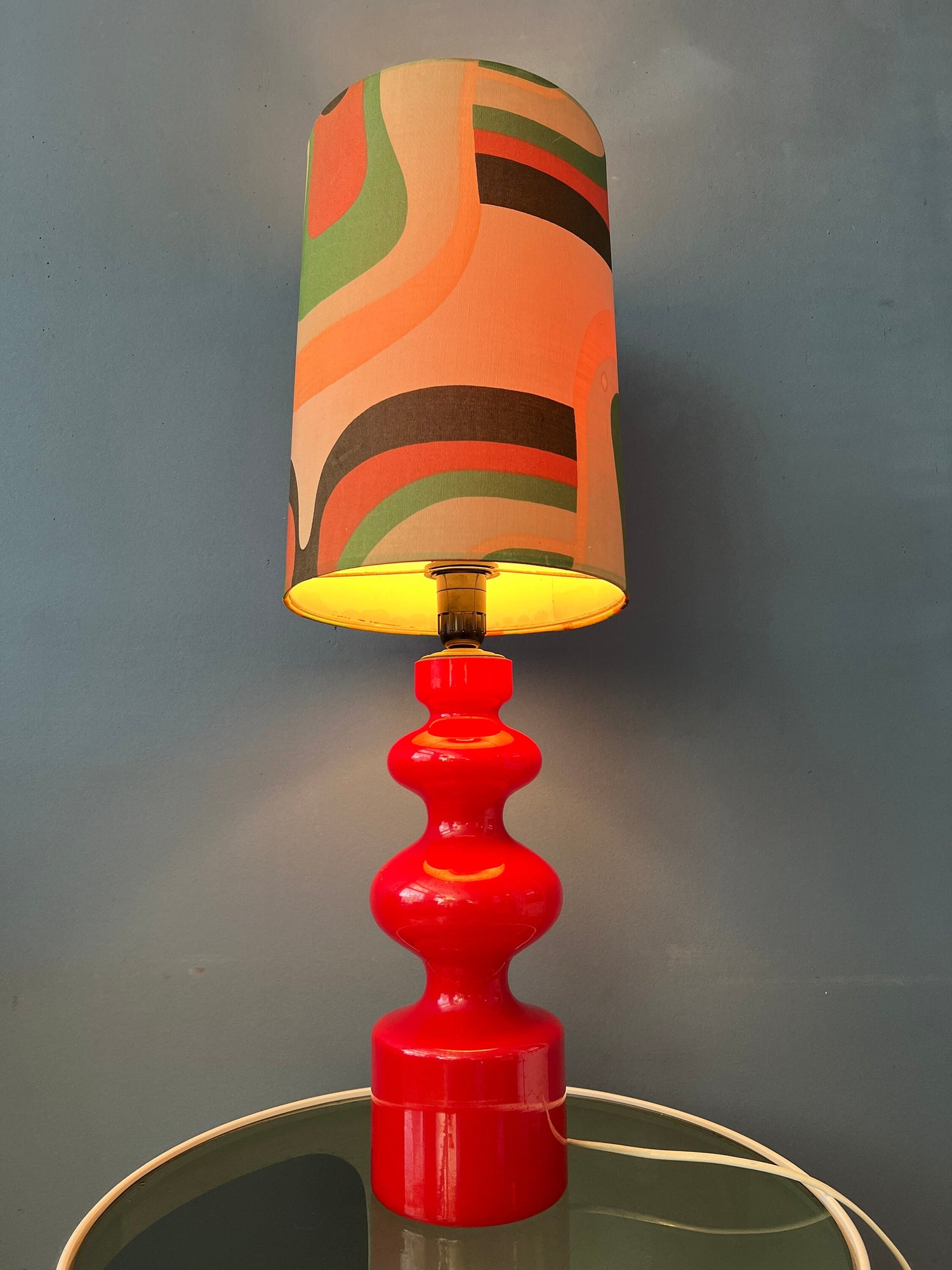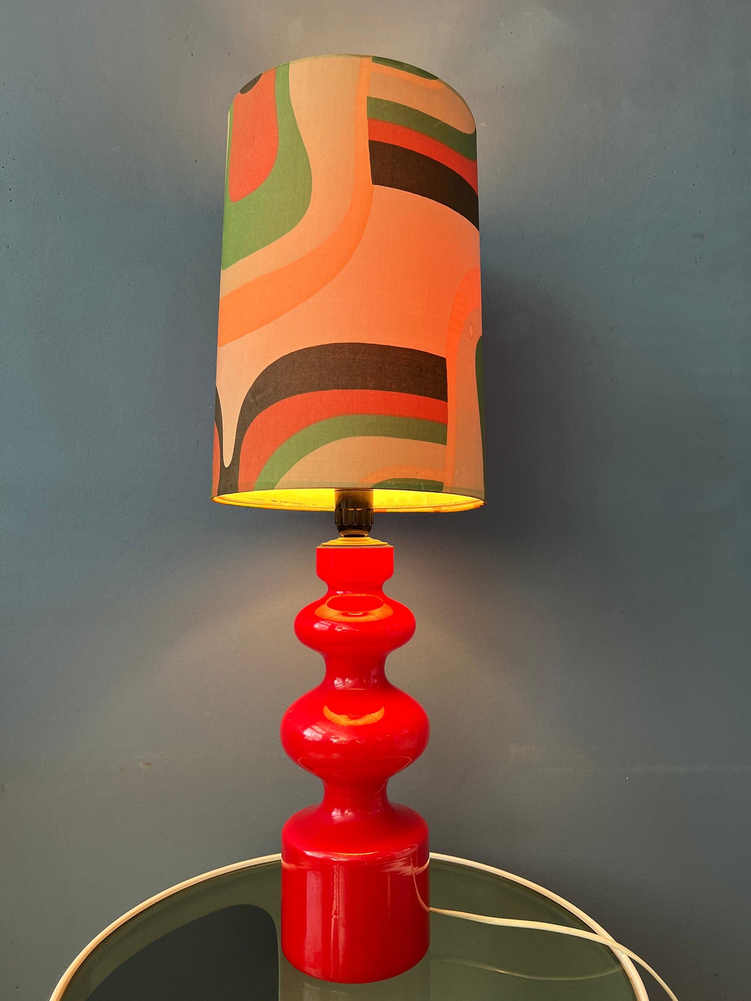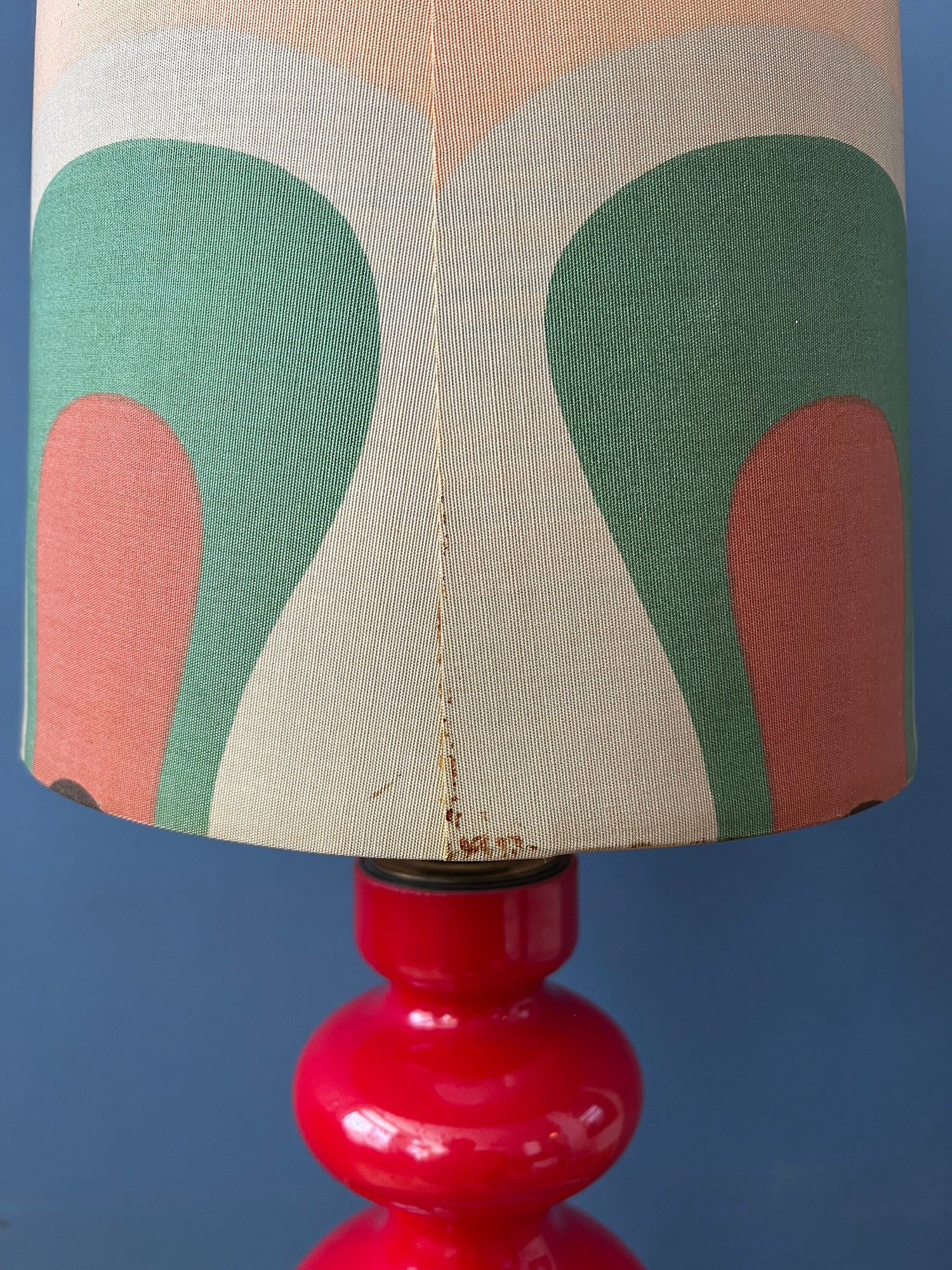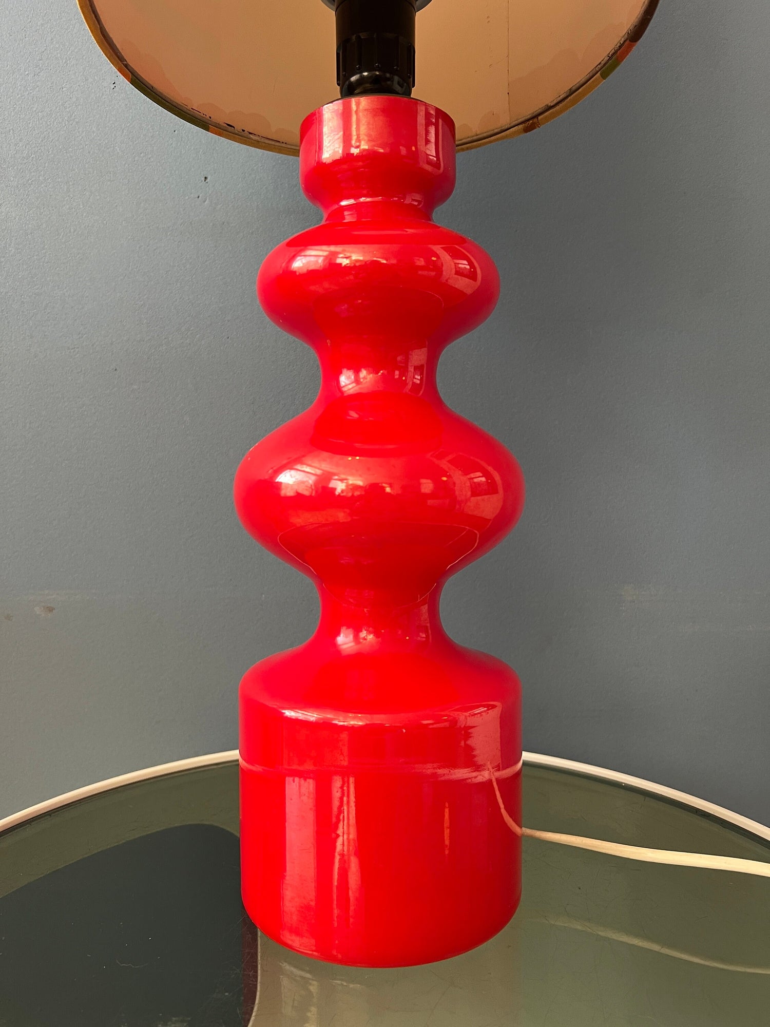 Red west germany space age table lamp with glass base and textile shade. The lamp requires one E27/26 lightbulb and currently has an EU-plug.