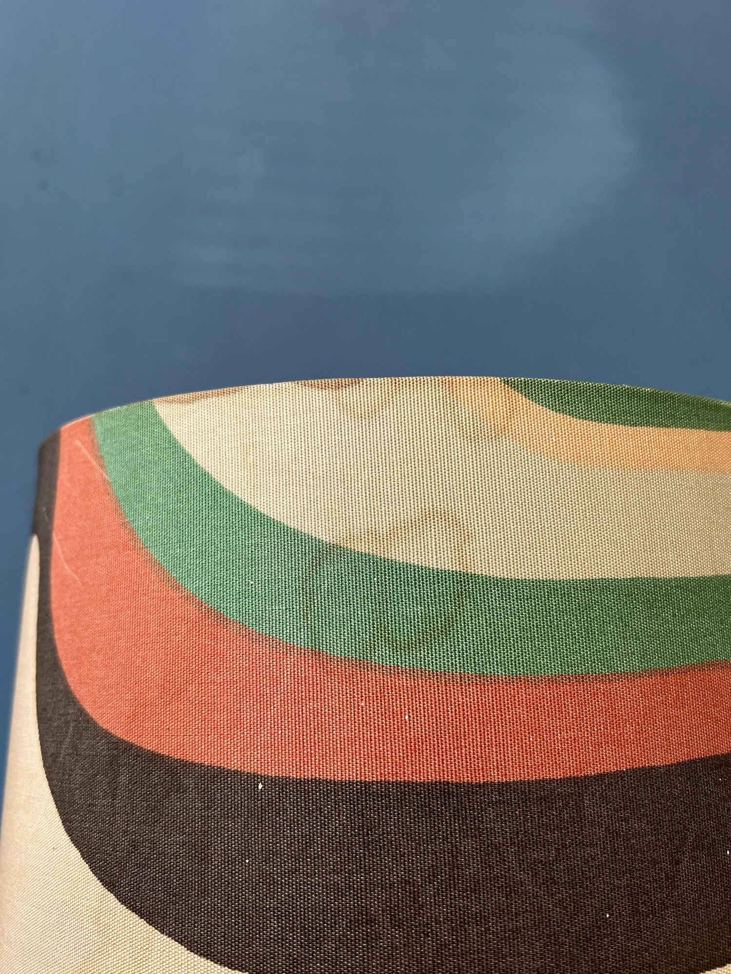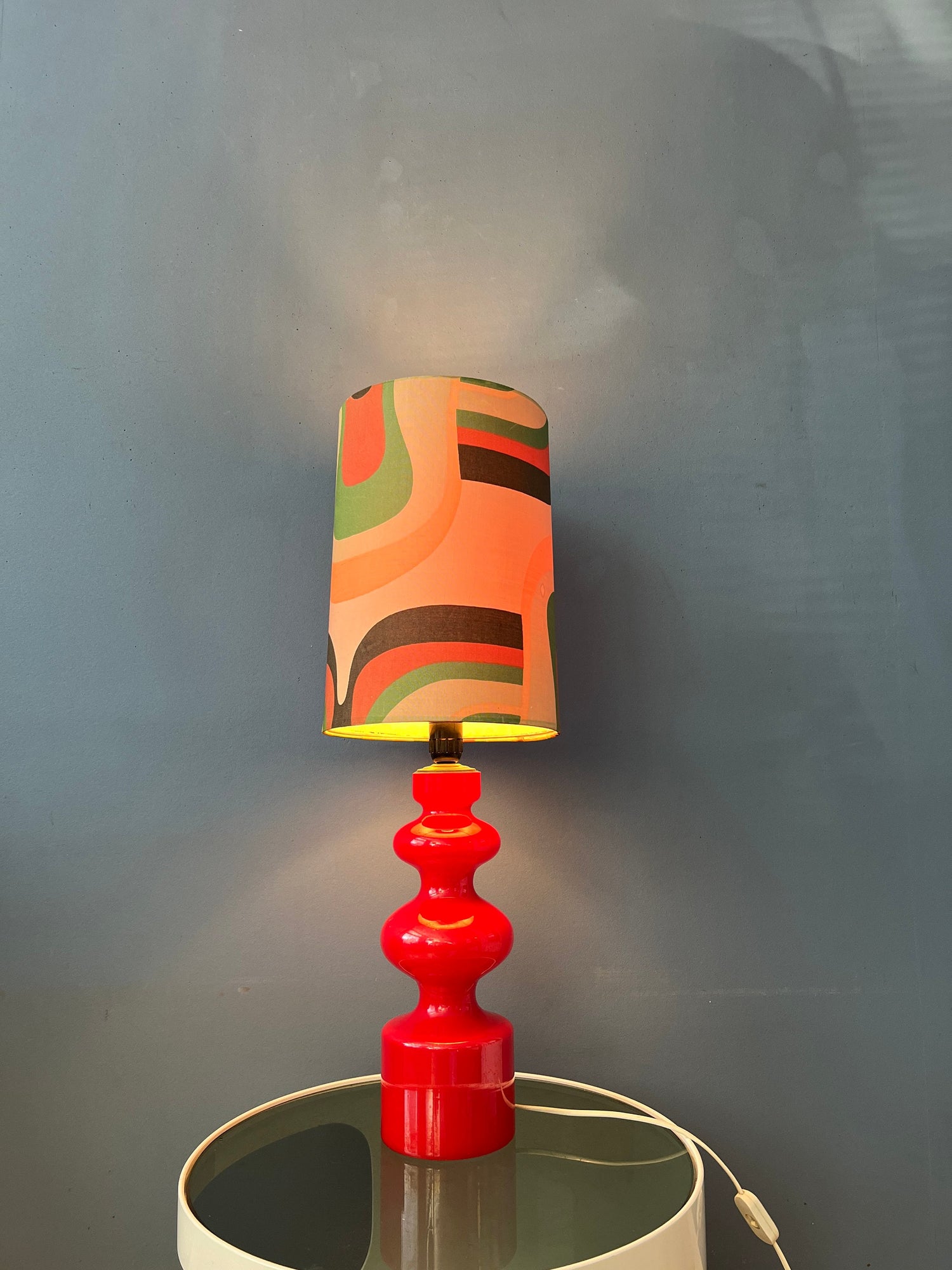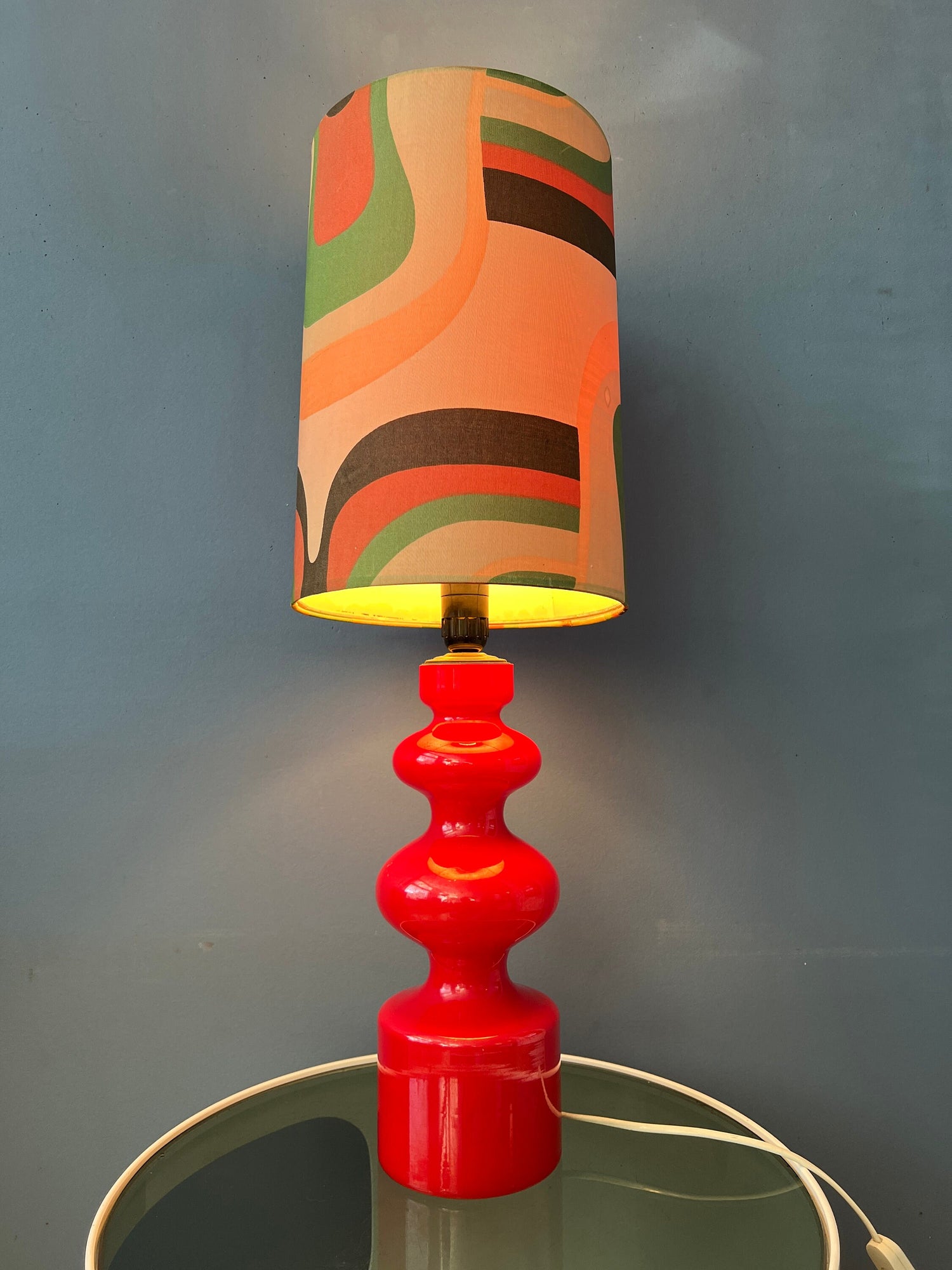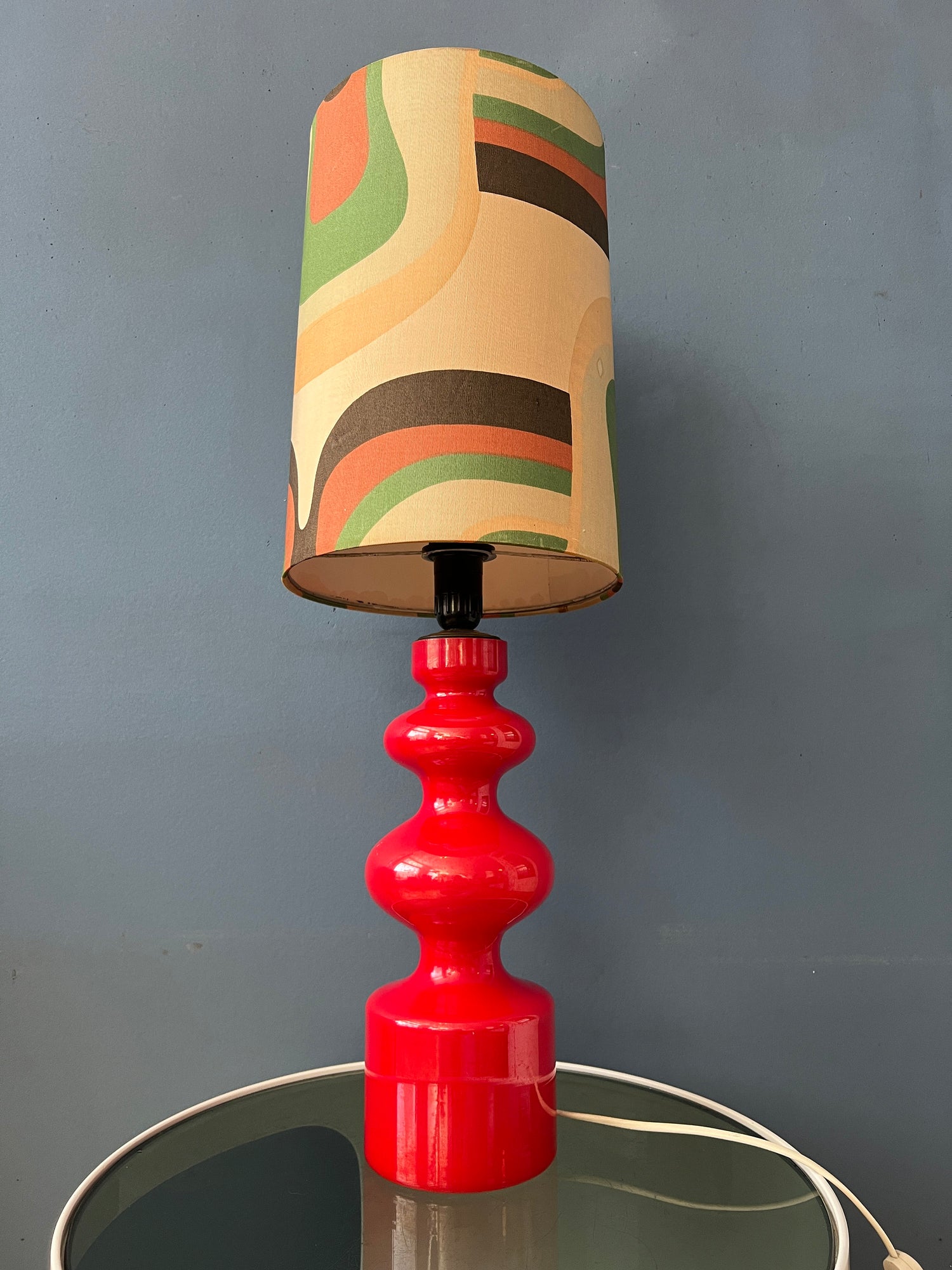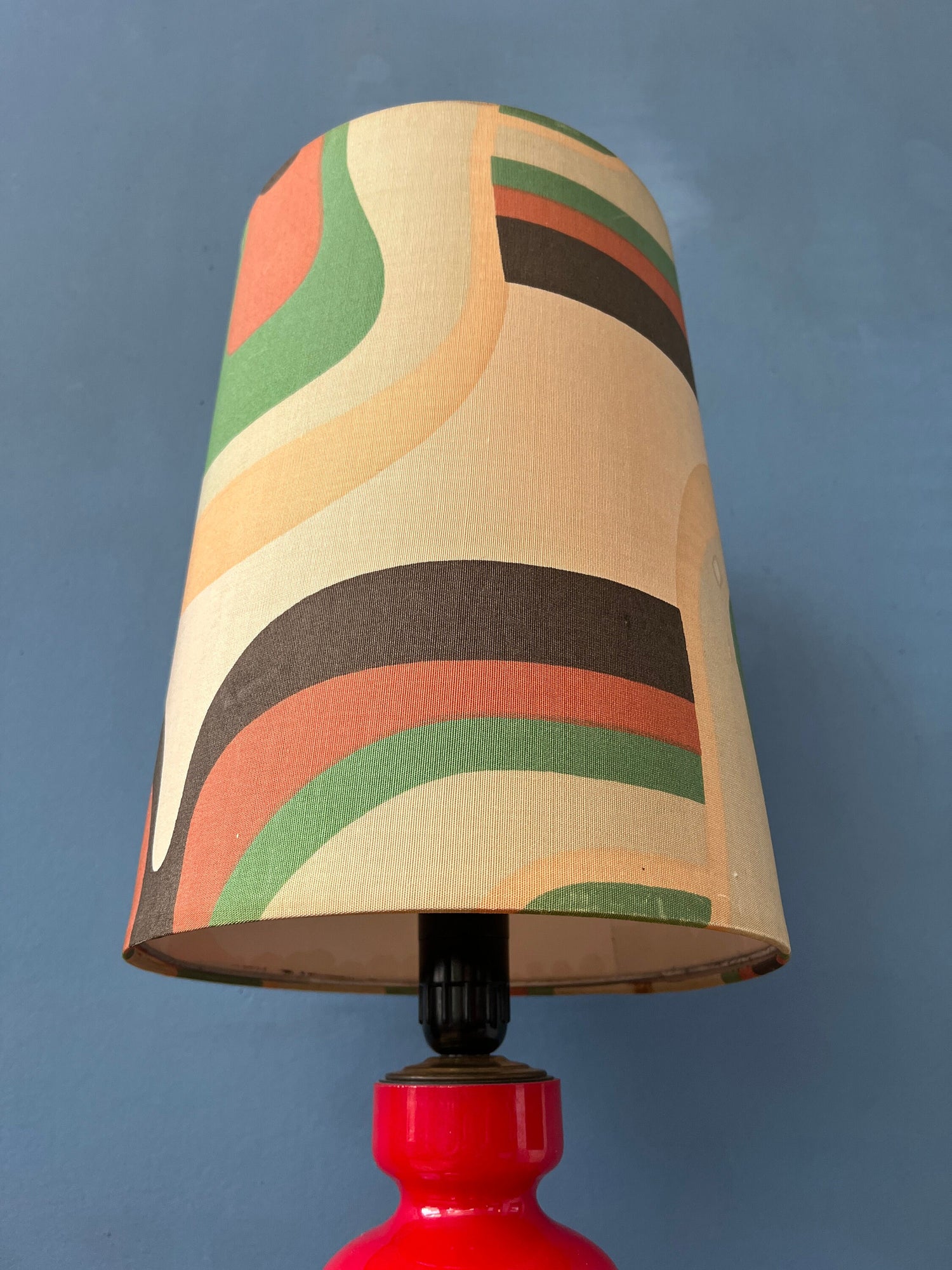 Red west germany space age table lamp with glass base and textile shade. The lamp requires one E27/26 lightbulb and currently has an EU-plug.