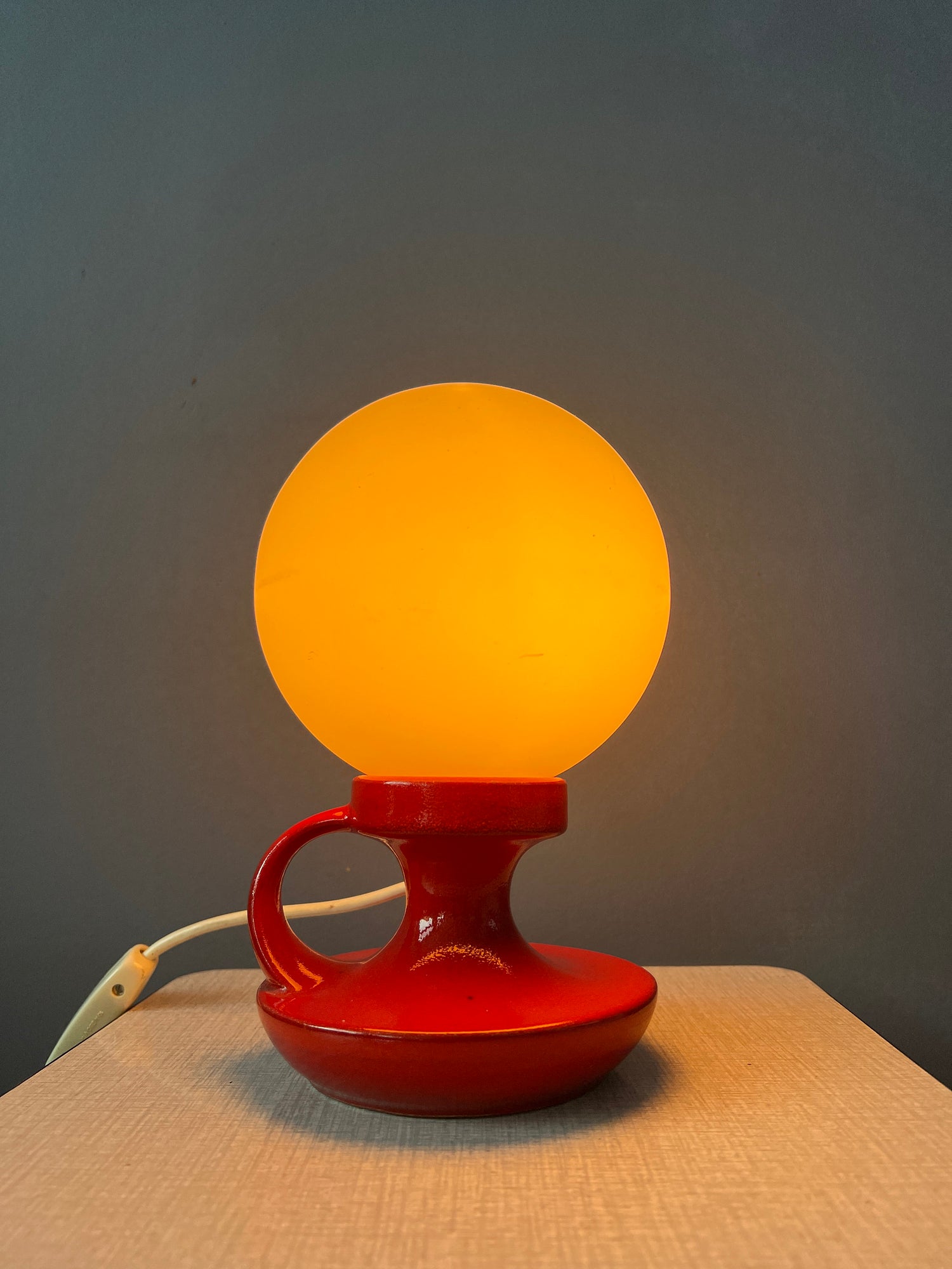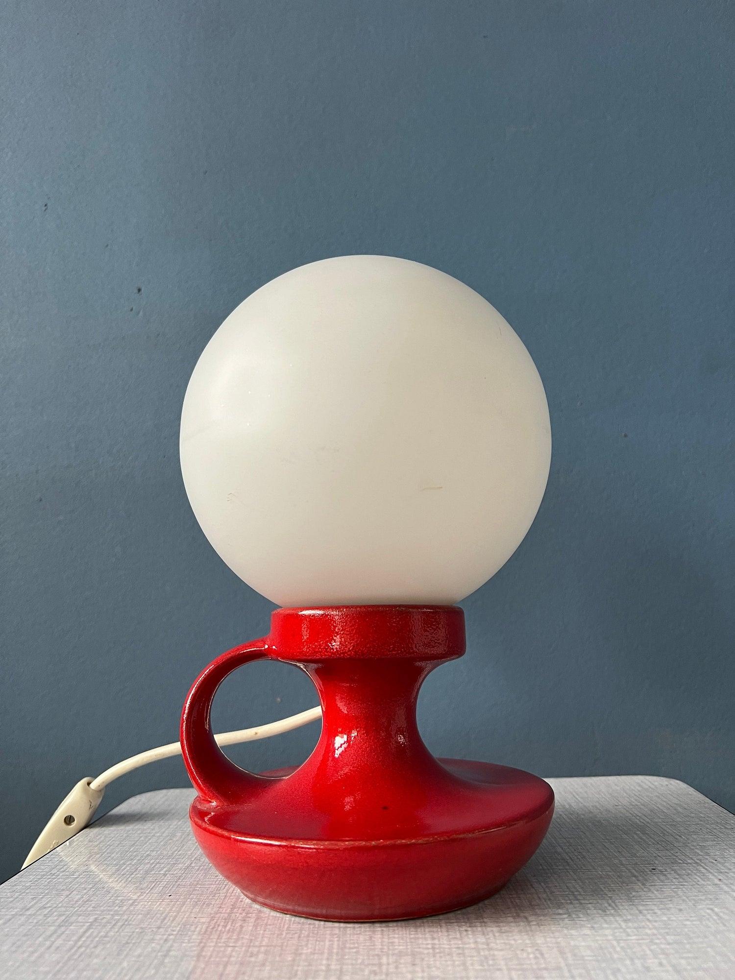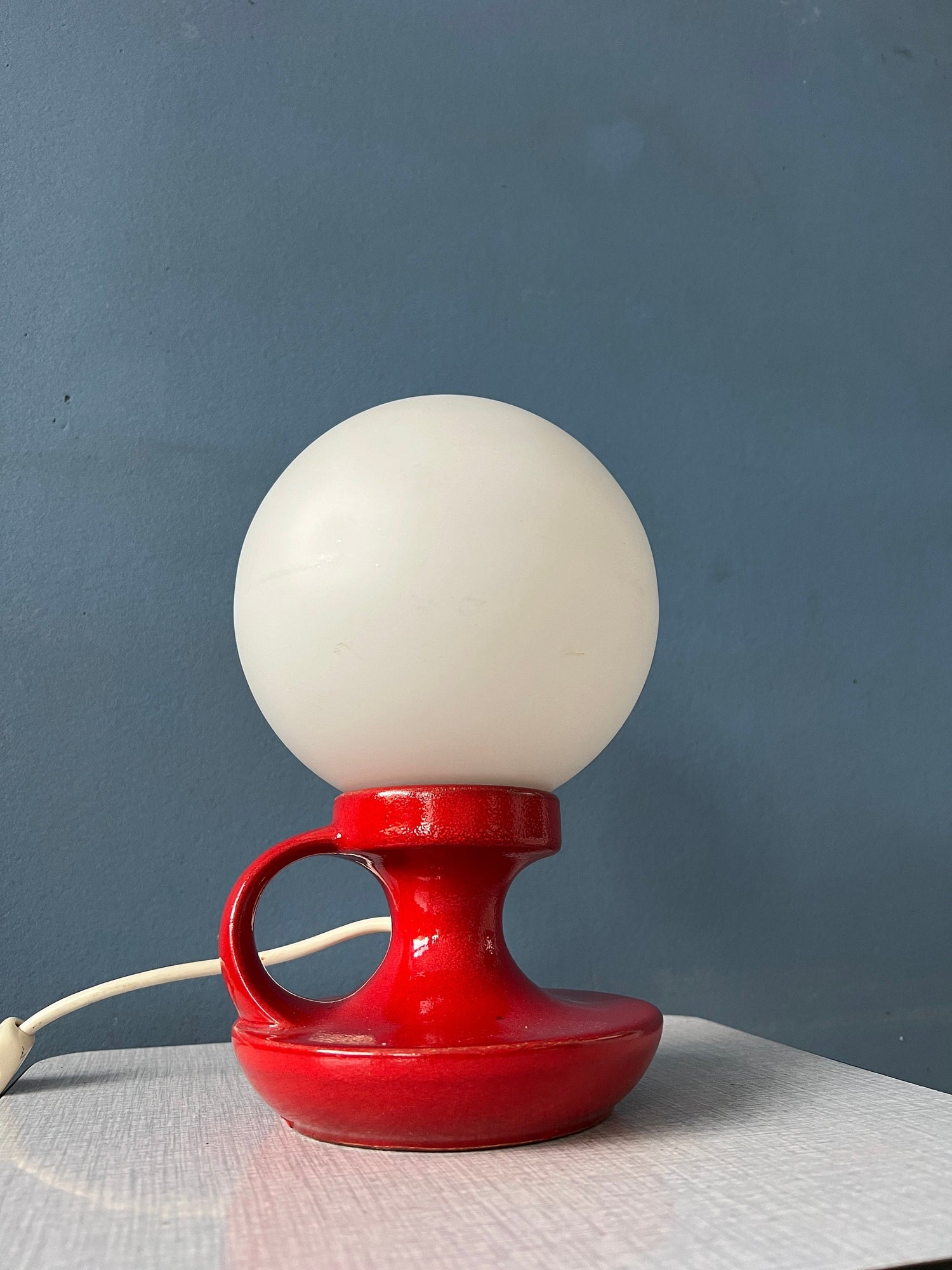Small red west germany ceramic table lamp with opaline glass shade. The lamp requires one E14 lightbulb and currently has an EU-plug.