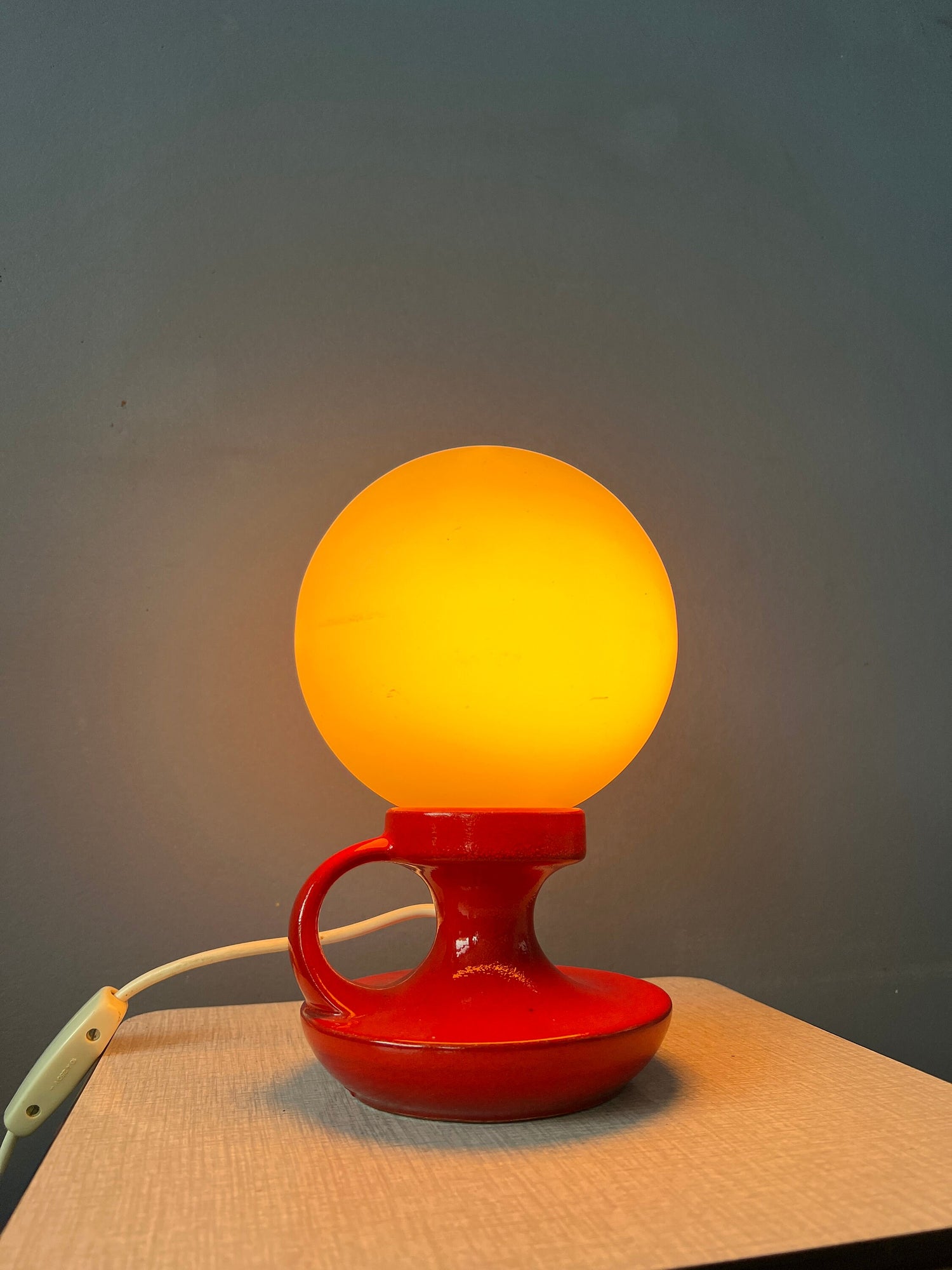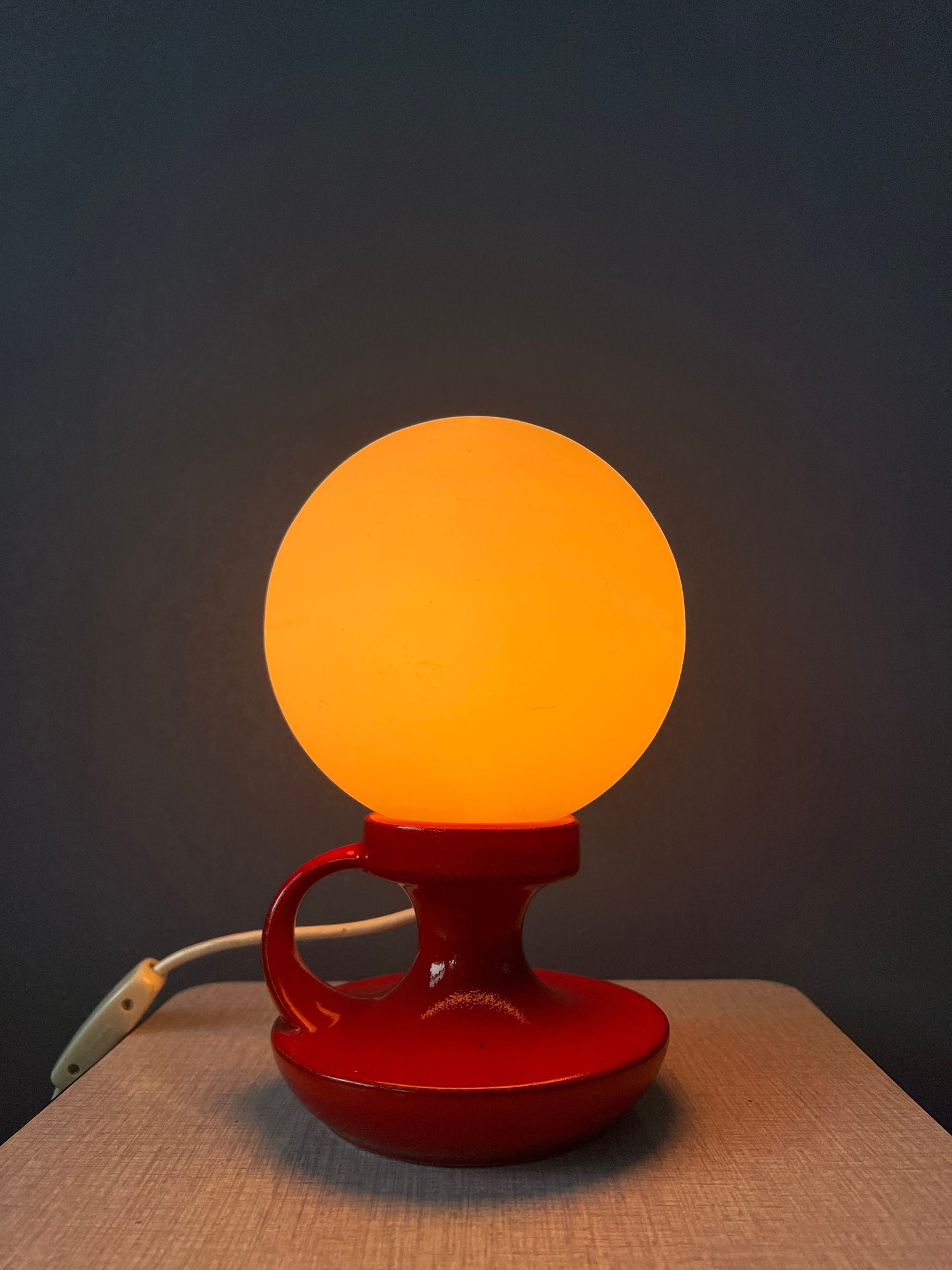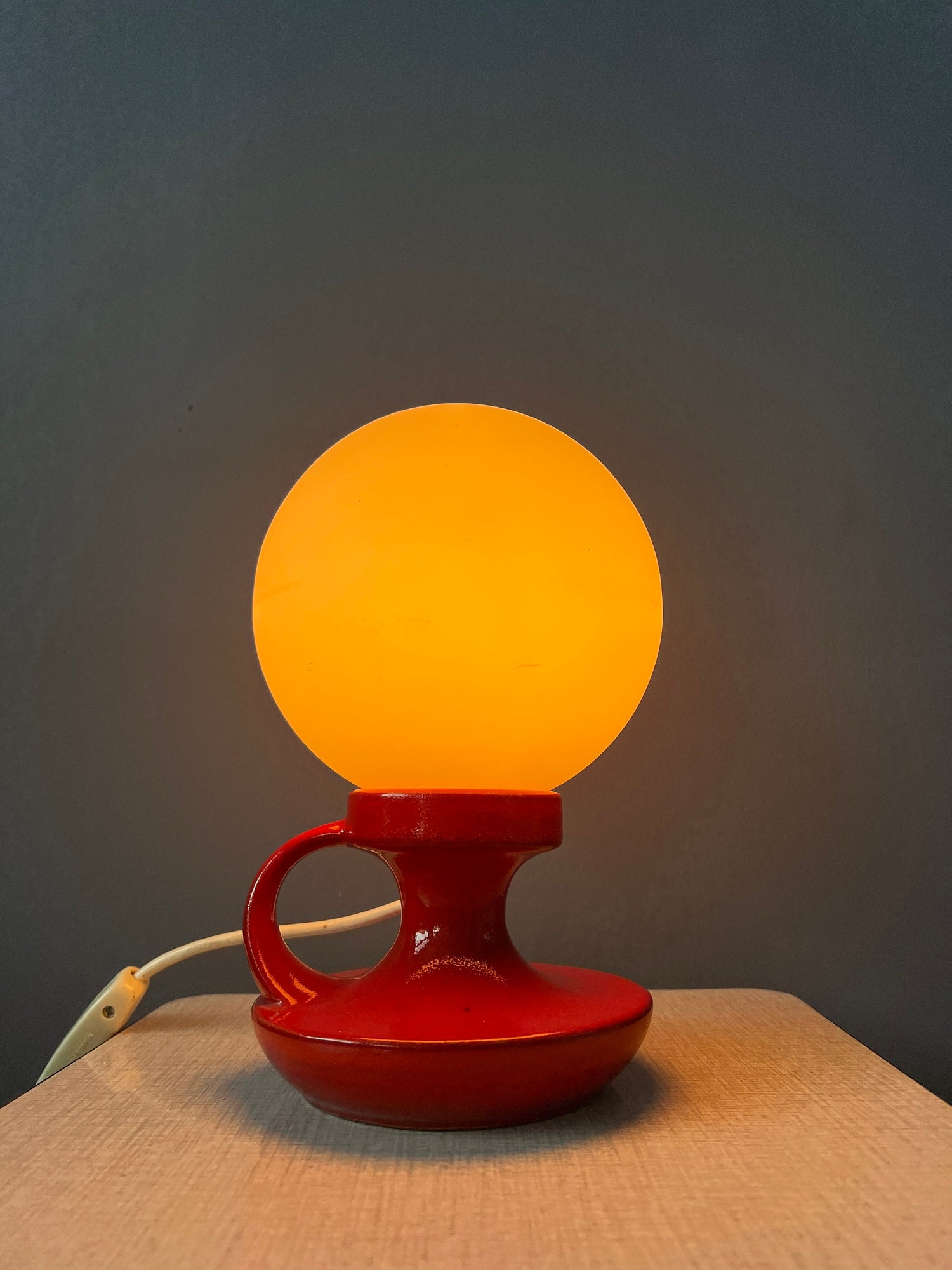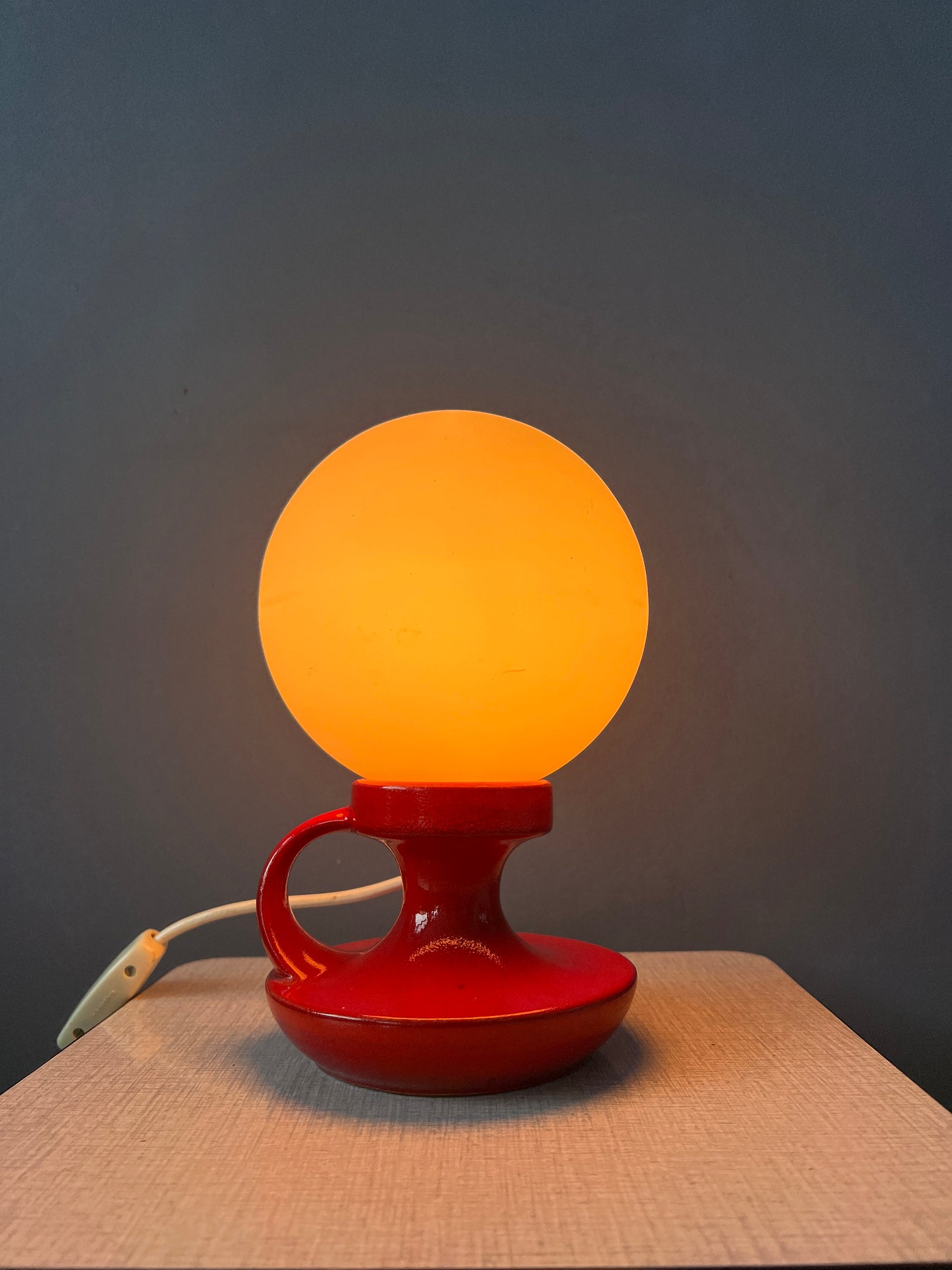 Small red west germany ceramic table lamp with opaline glass shade. The lamp requires one E14 lightbulb and currently has an EU-plug.