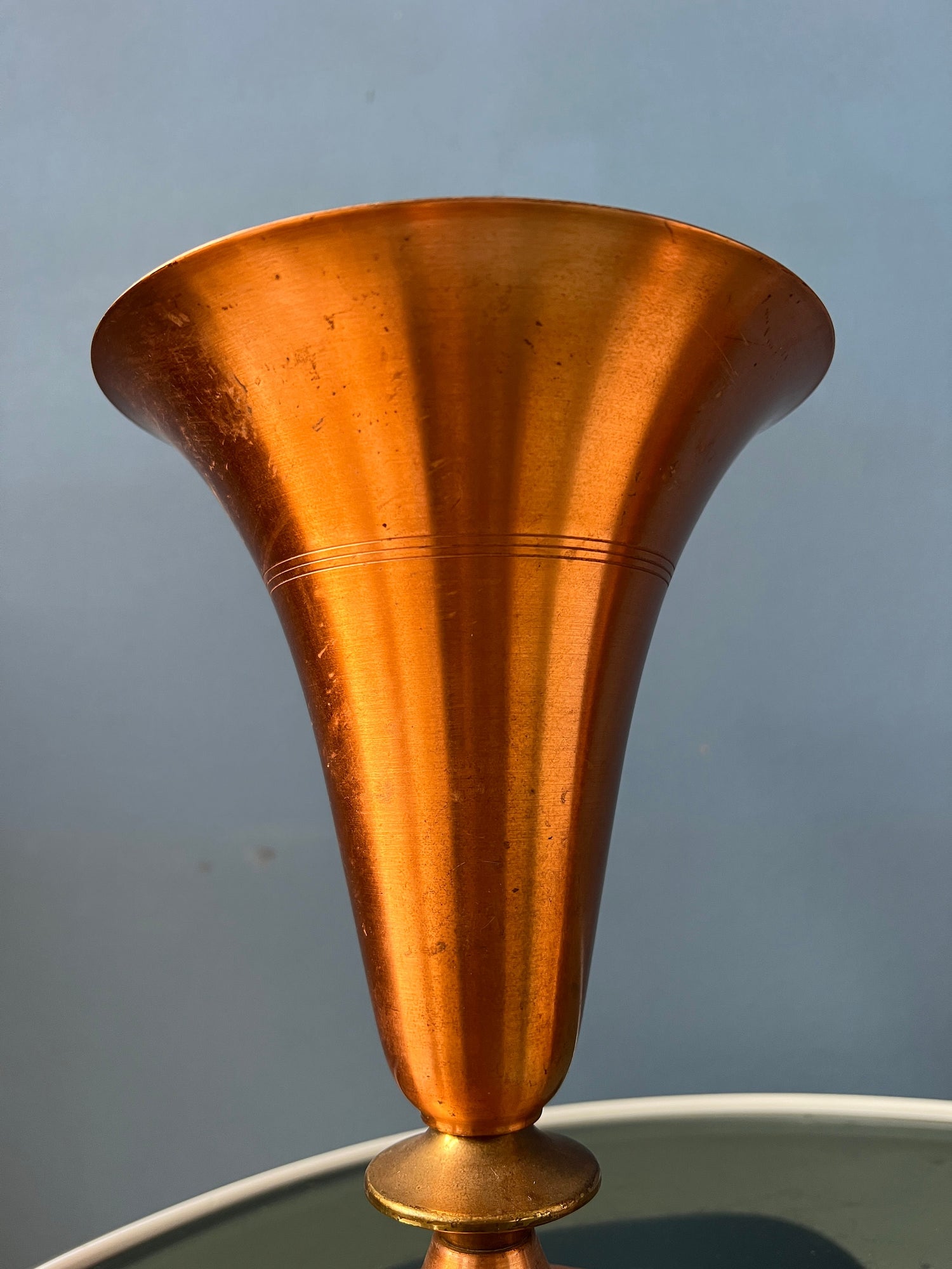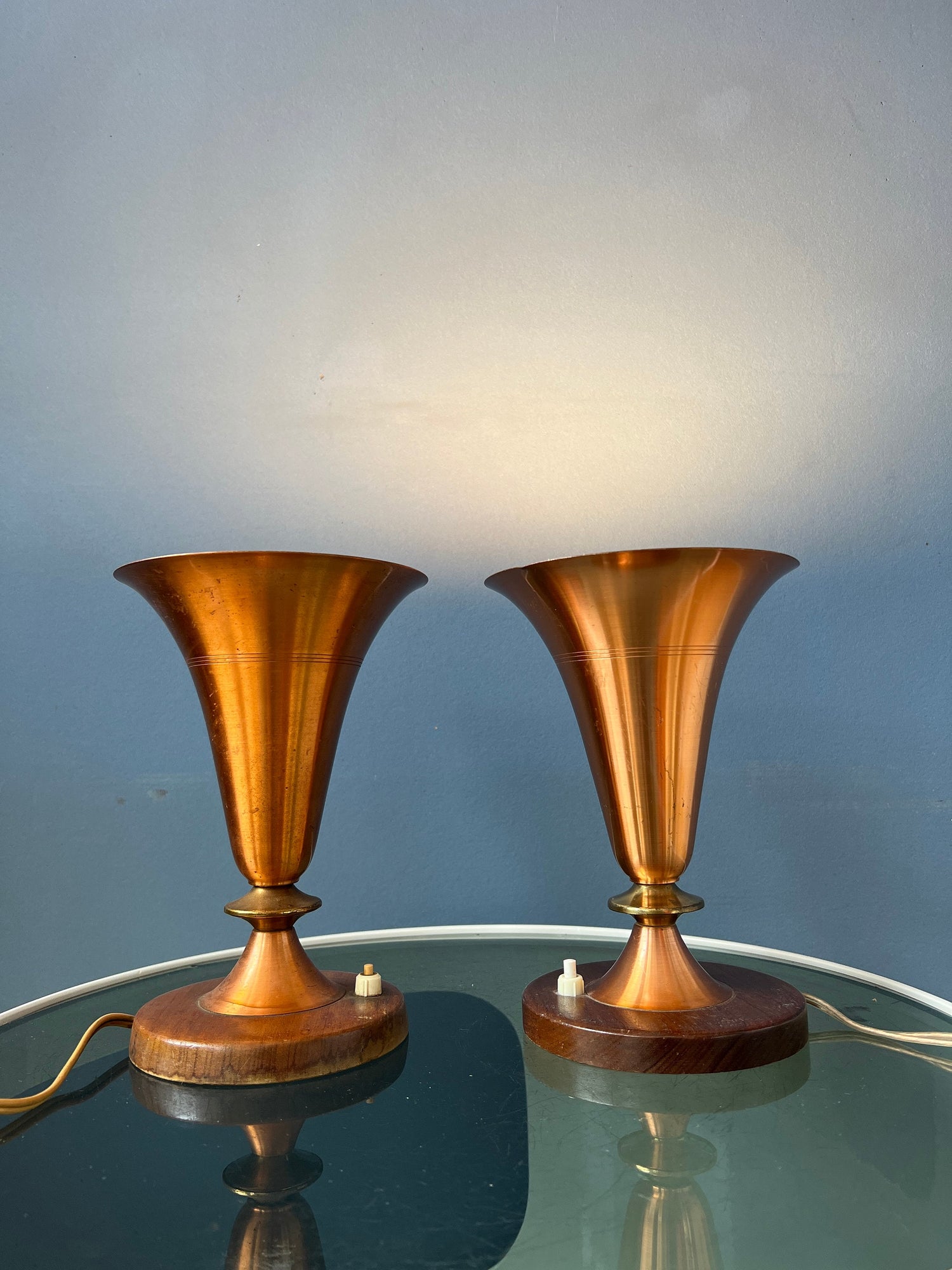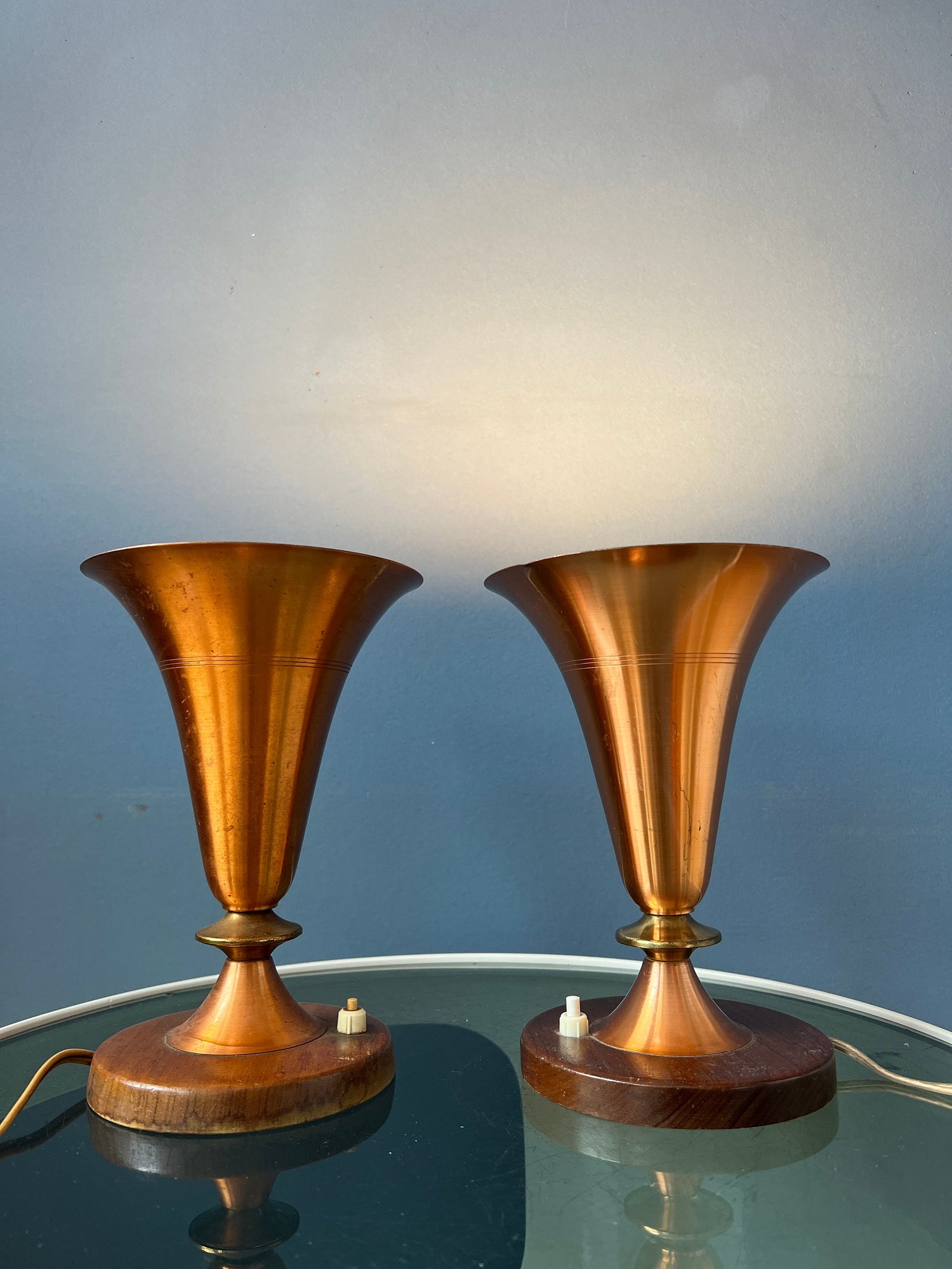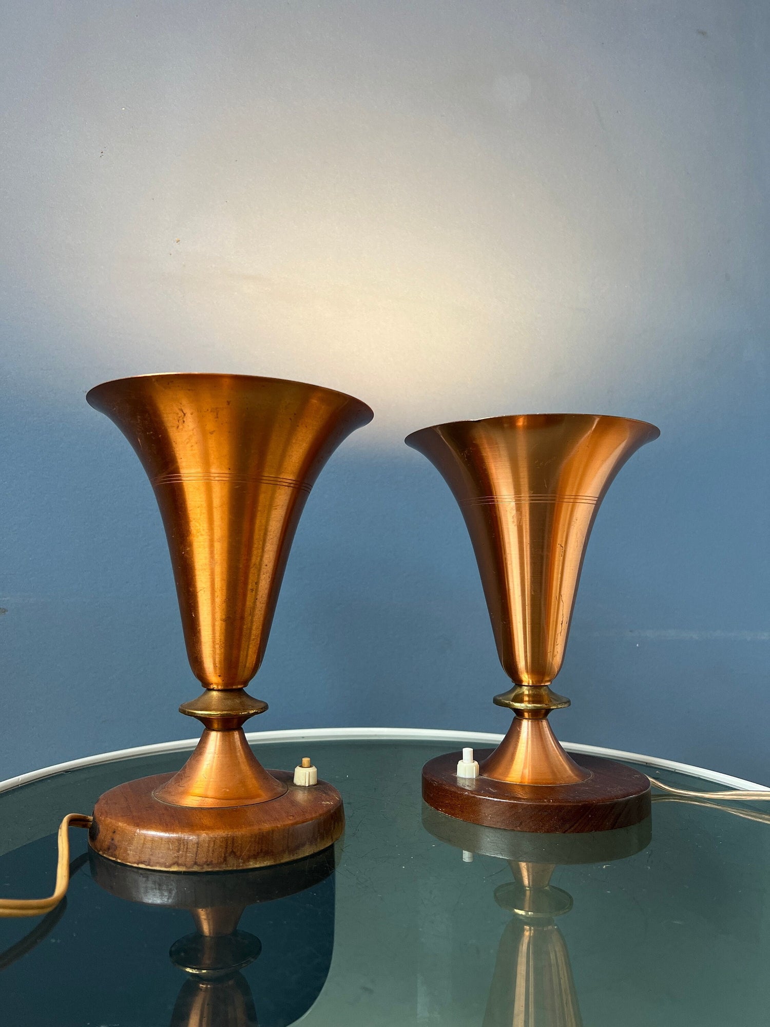Two Danish uplighter copper desk lamps in trumpet like shape. The light nicely projects upward. The lamps can be switched on and off with the buttons on the base. The lamps require E14 lightbulbs and currently have EU-plugs.