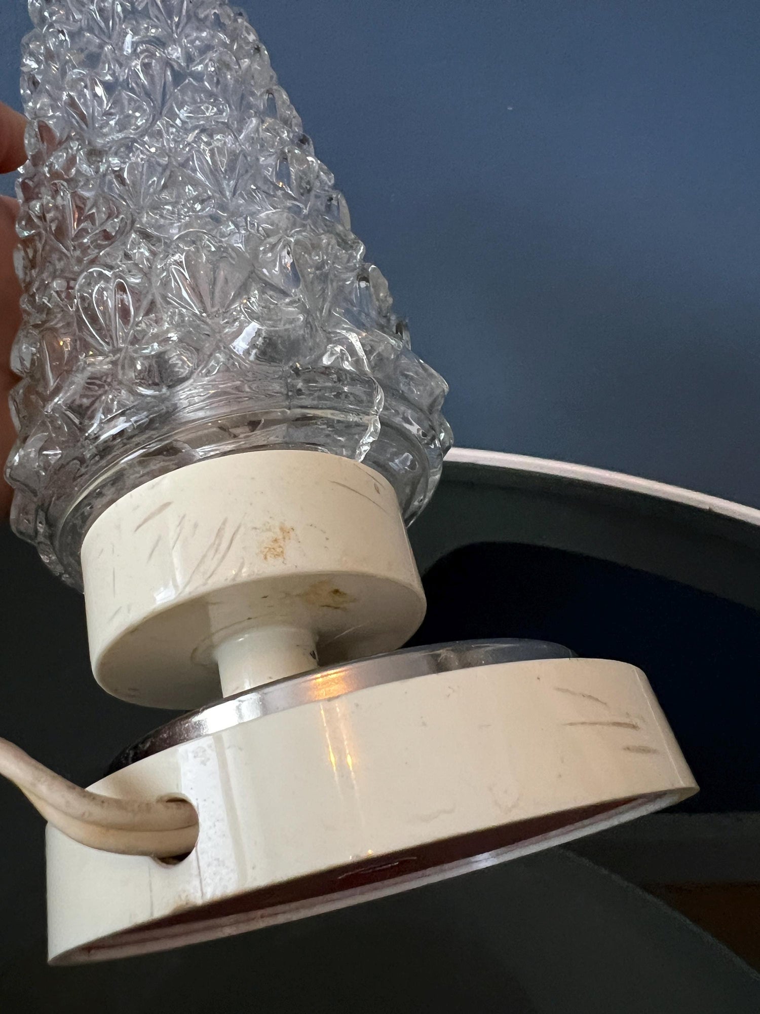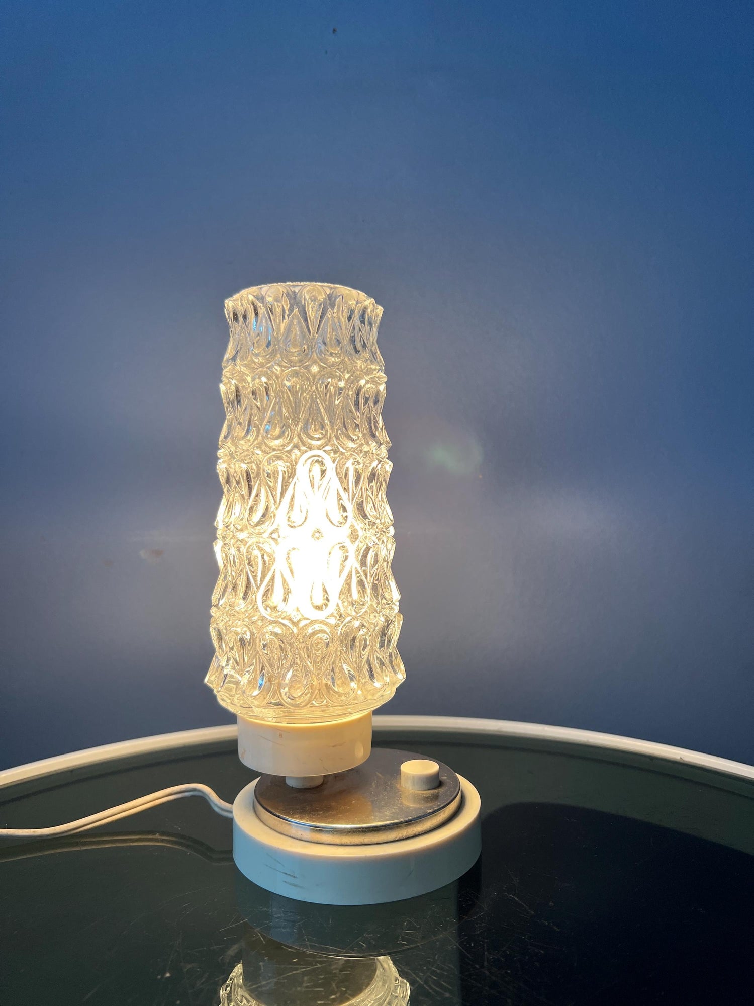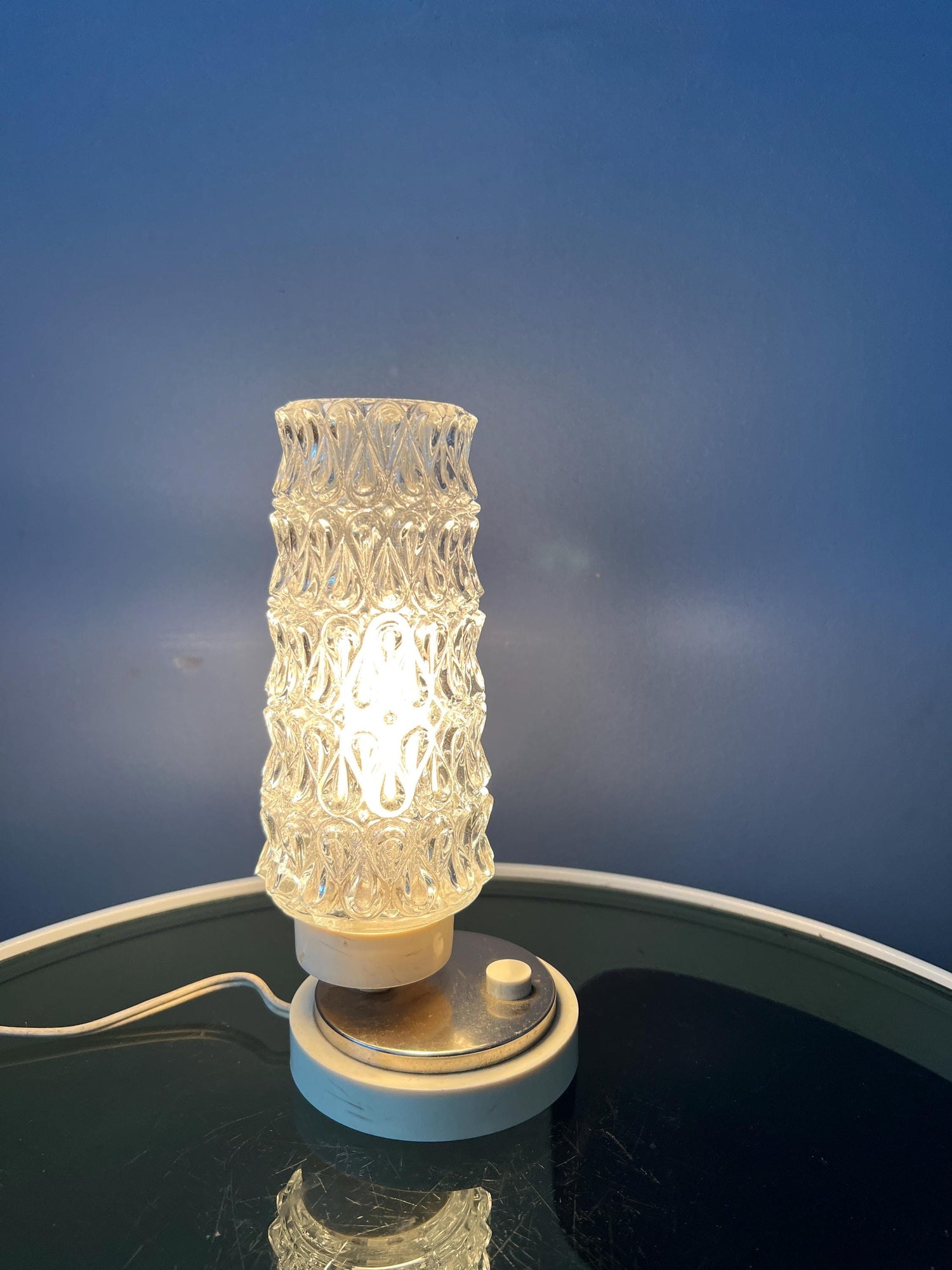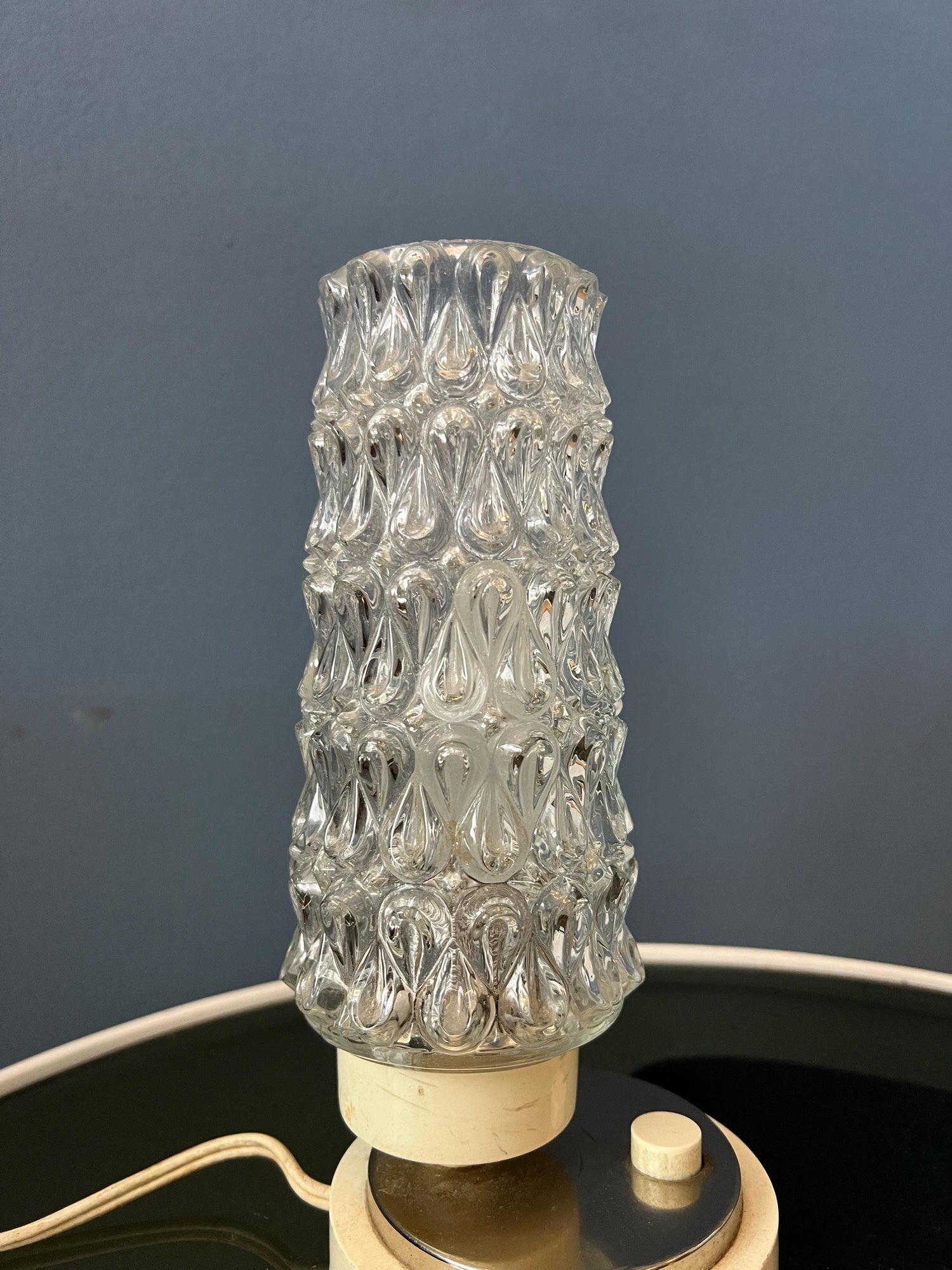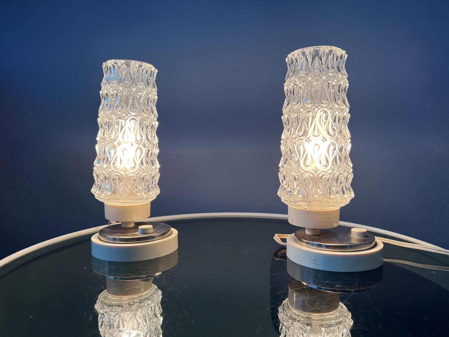 Set (2) of mid century table or bedside lamps with opaline glass shades. The piece have clear crystal glass shades and have a plastic and metal base. The lamps require E14 lightbulbs and currently have EU-plugs.