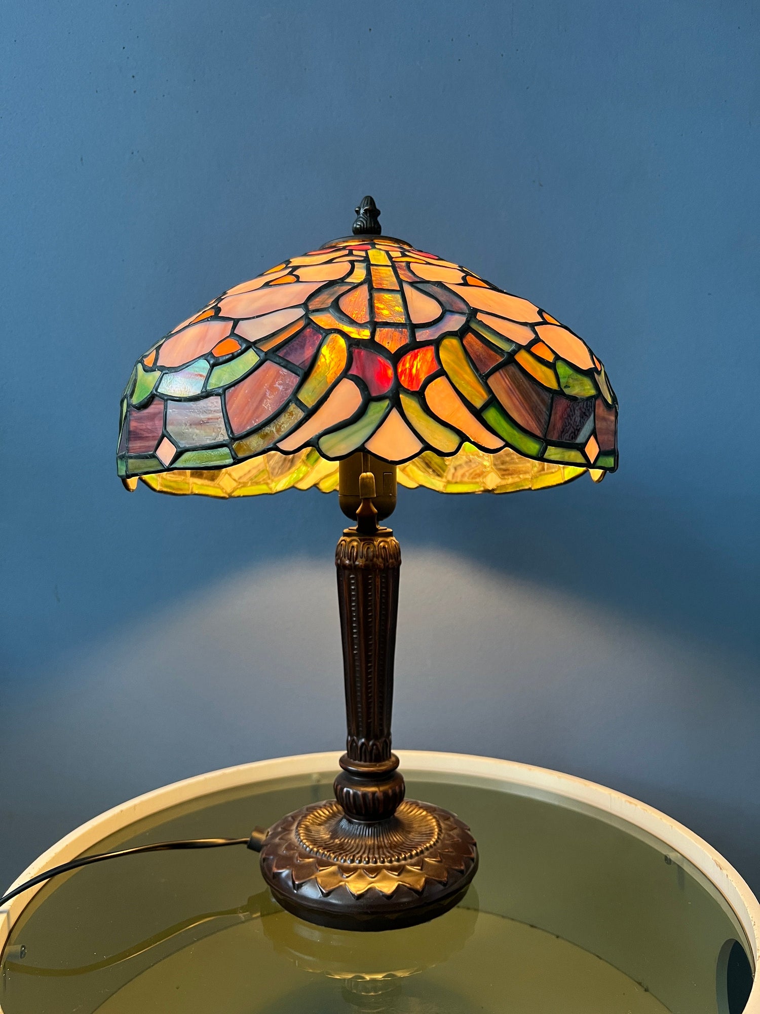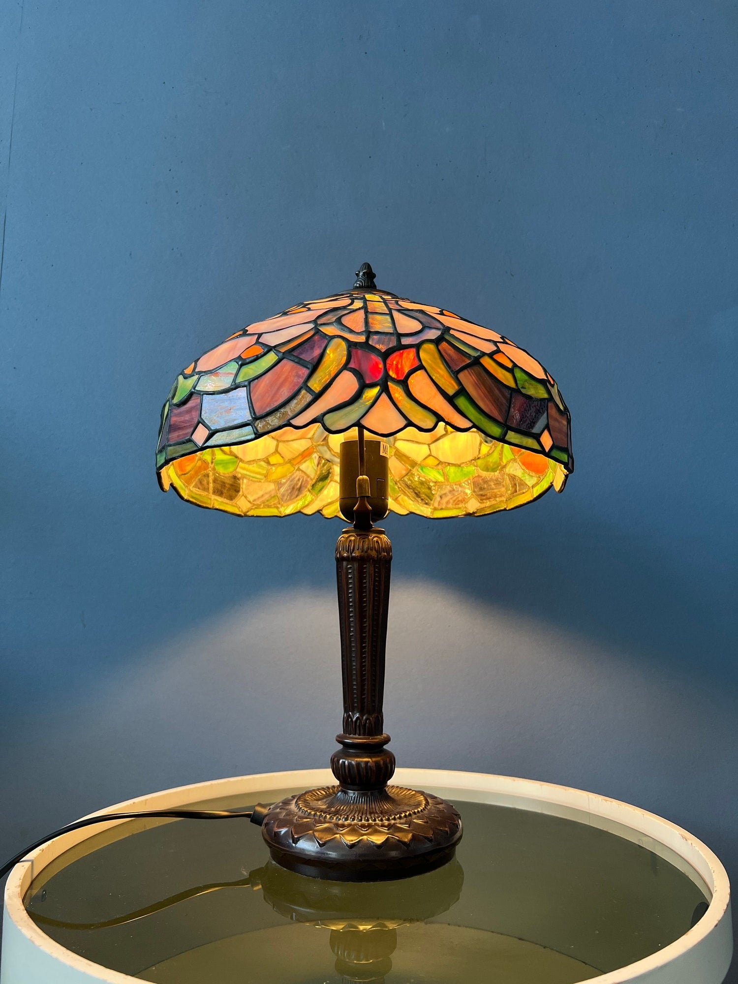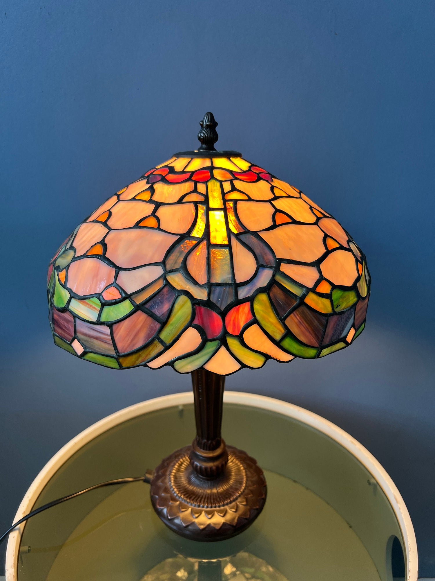 Big Tiffany desk lamp with very colourful patterned stained glass shade. The base is made out of metal and the shade is made from acrylic. The stained glass produces a warm light effect. The shade can be taken off the base and positioned in any way desirable. The lamp requires one E27/26 (standard) lightbulb and currently has an EU-plug (easily used outside EU with plug converter).