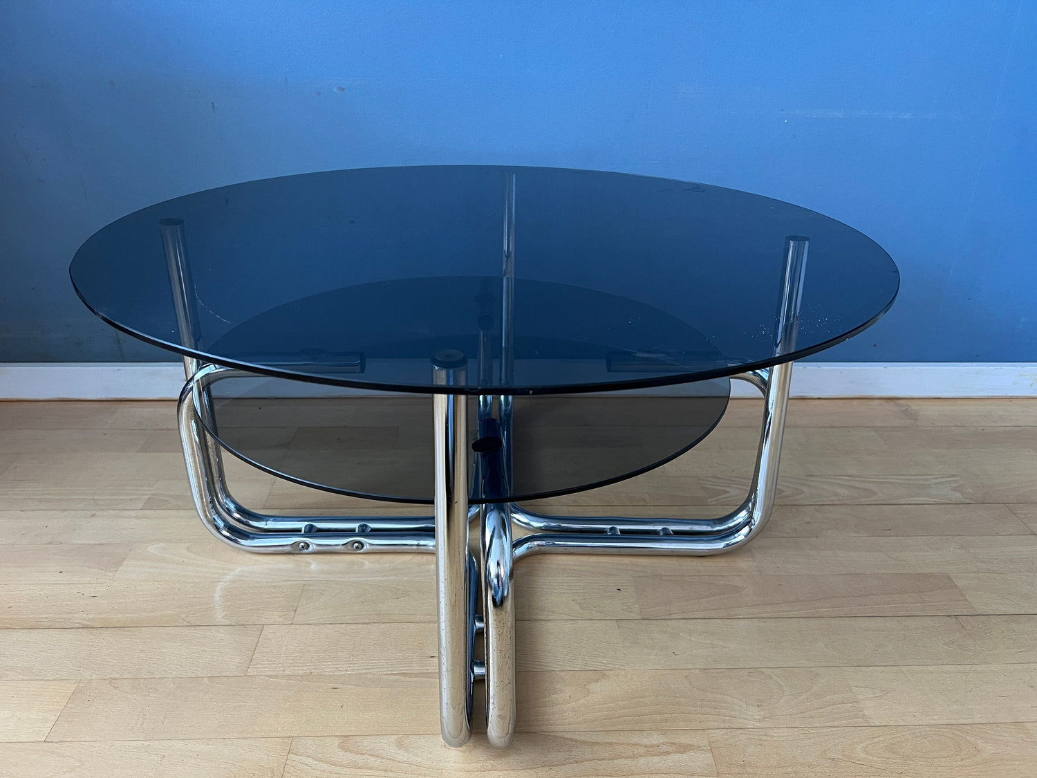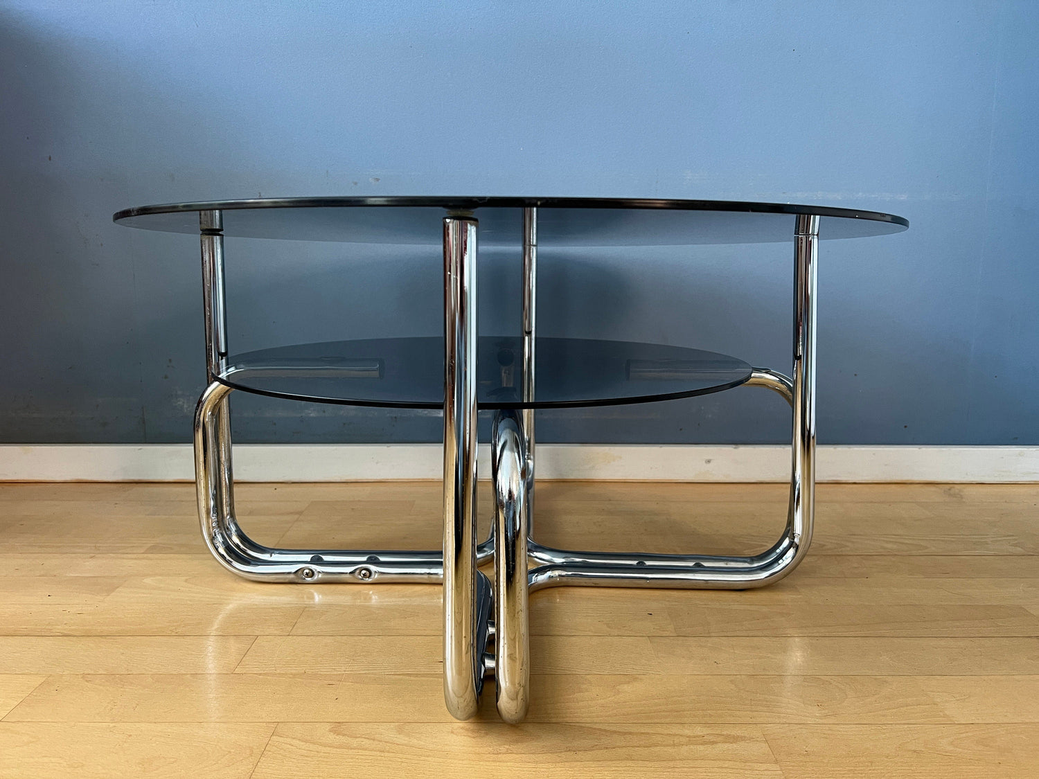 Chrome space age coffee table with two smoked glass surfaces. The piece has a higher and lower level. The smoked glass has a transparant gray colour.