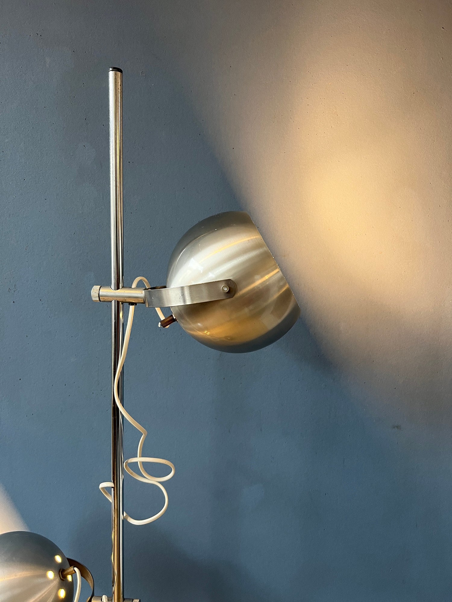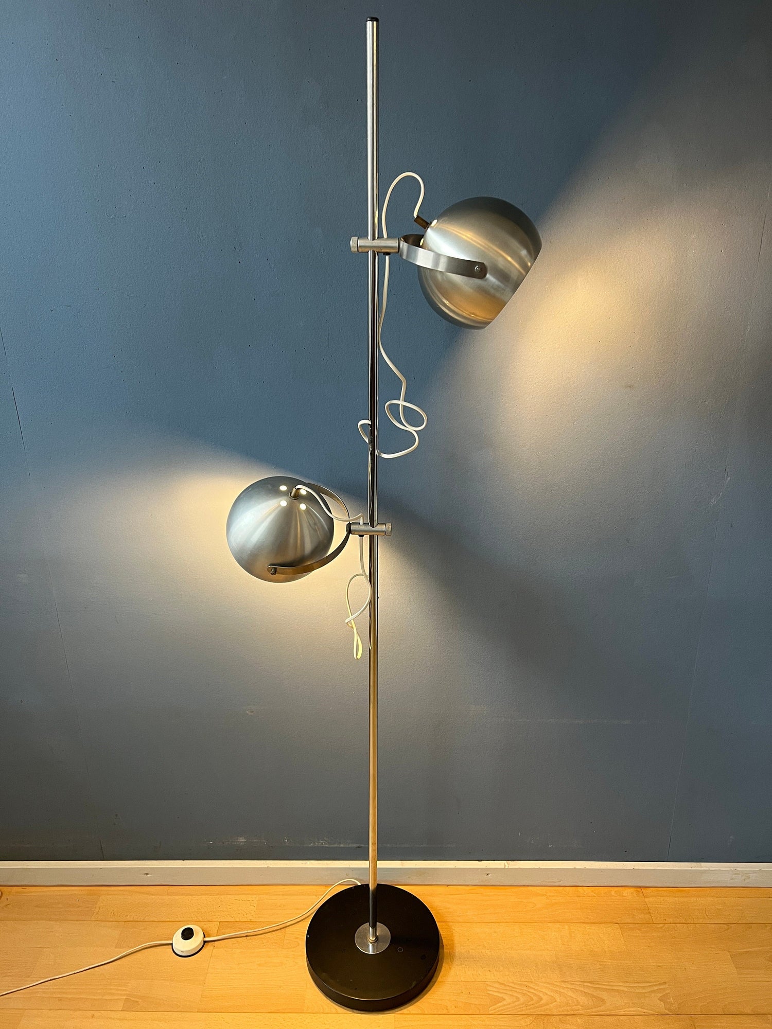 Space age floor lamp with two eyeball shades. The shades can be turned in any direction desirable and move up and down the base. The lamp requires two E27/26 (standard) bulbs and currently has an EU-plug (works outside EU with plug converter right away).