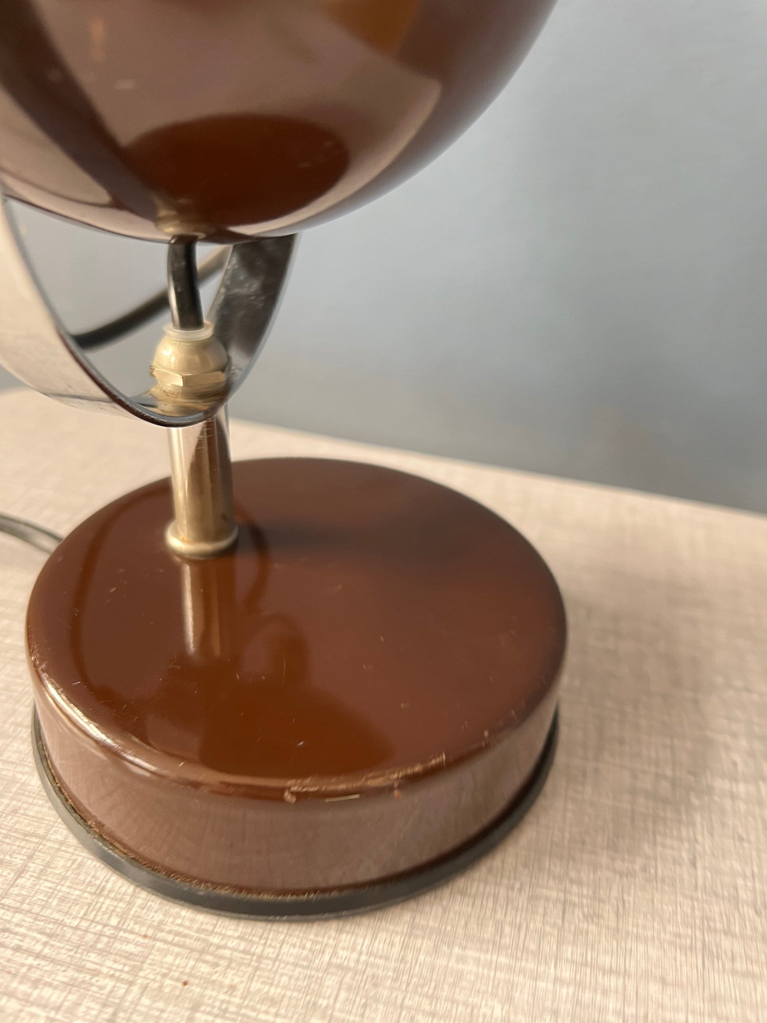 Small space age eyeball table lamp in brown colour. The eyeball shade can be turned in different directions. The lamp is made out of metal. The lamp requires one E14 lightbulb and currently has an EU plug (easily used outside EU with plug-converter).