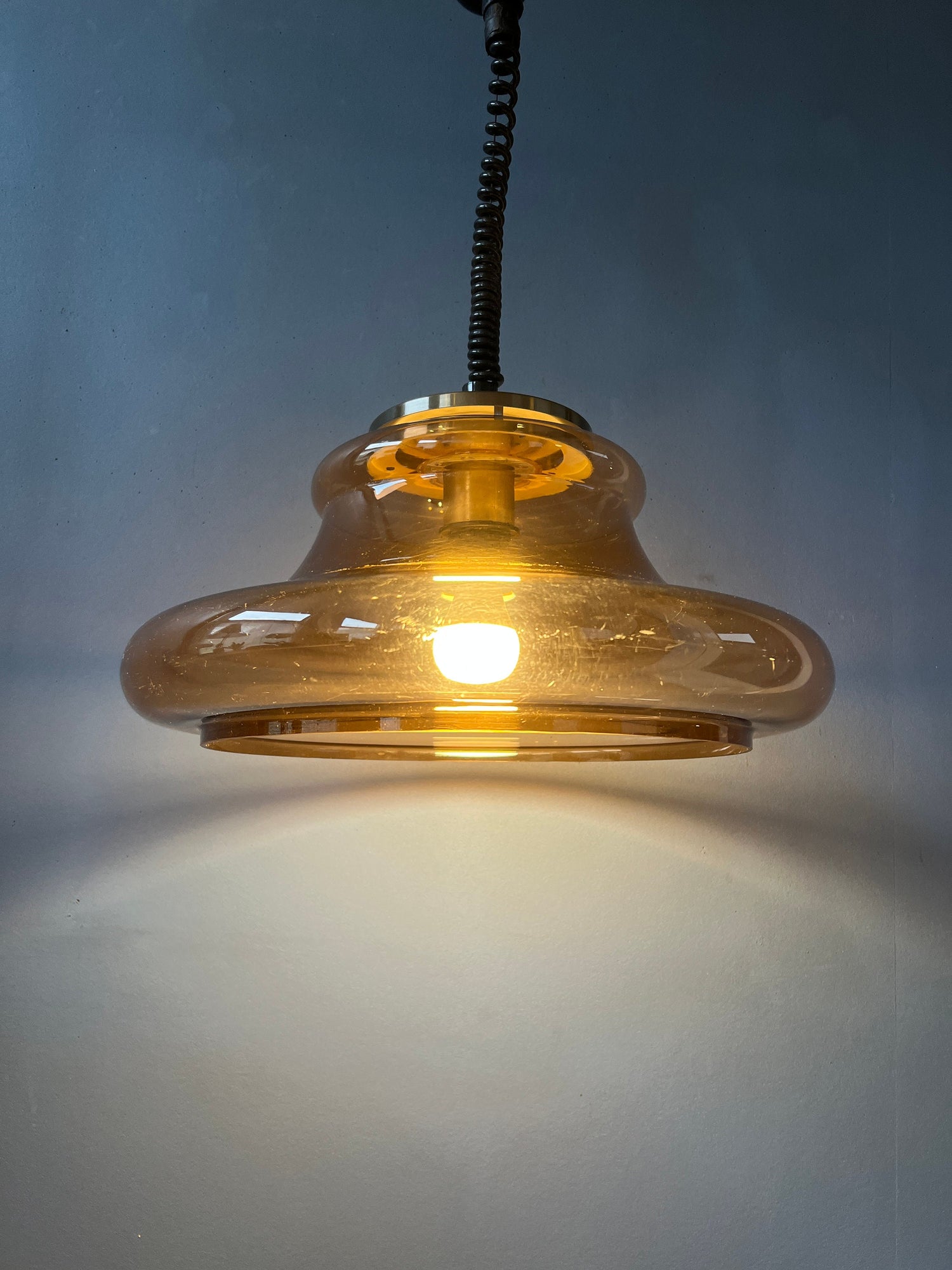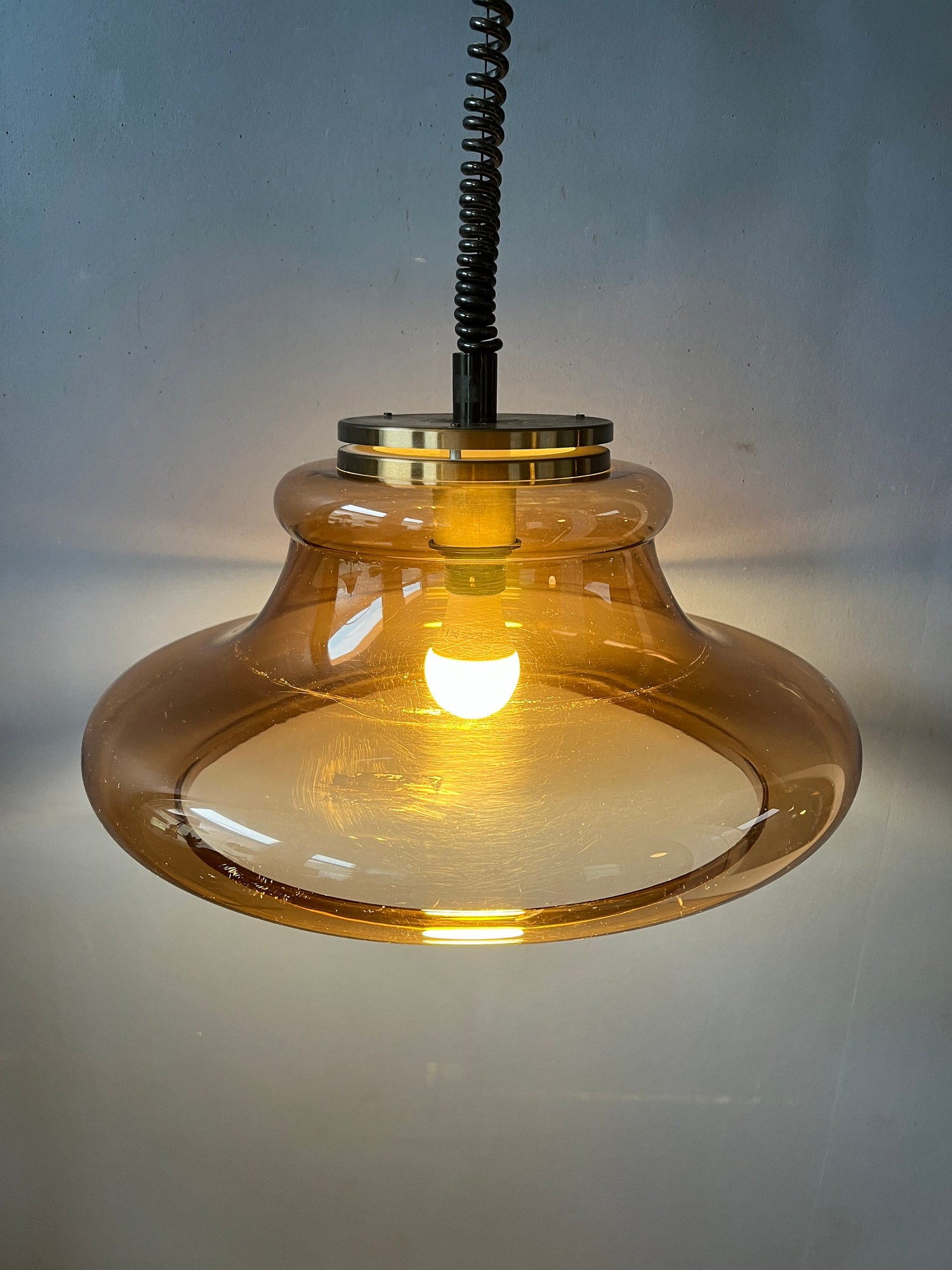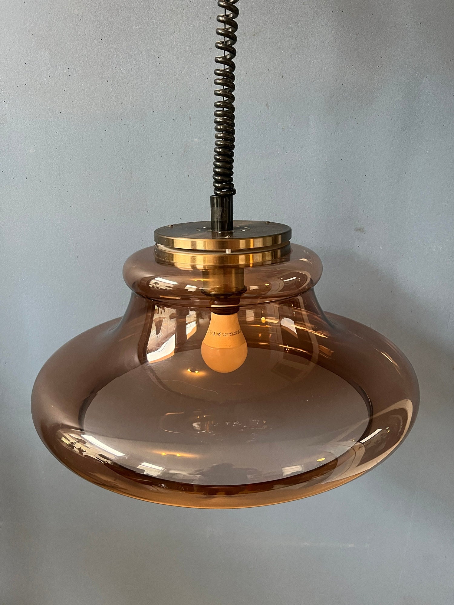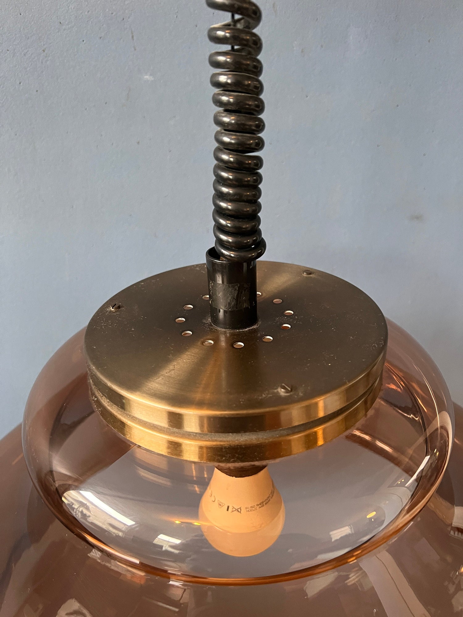A space age pendant lamp by Herda with transparent shade. The shade consists of acrylic glass in a copper-like colour. The height of the lamp can be adjusted with the rise-and-fall system.