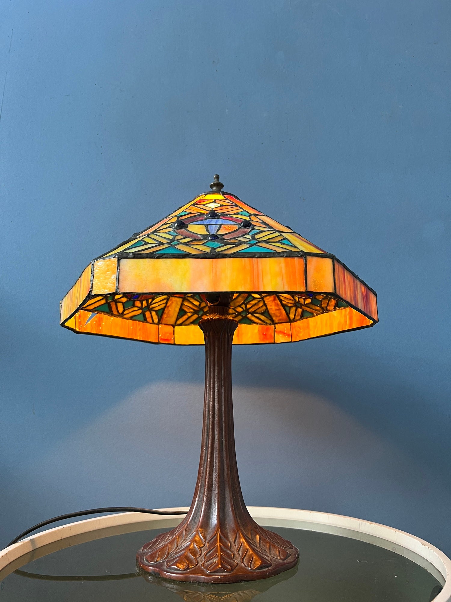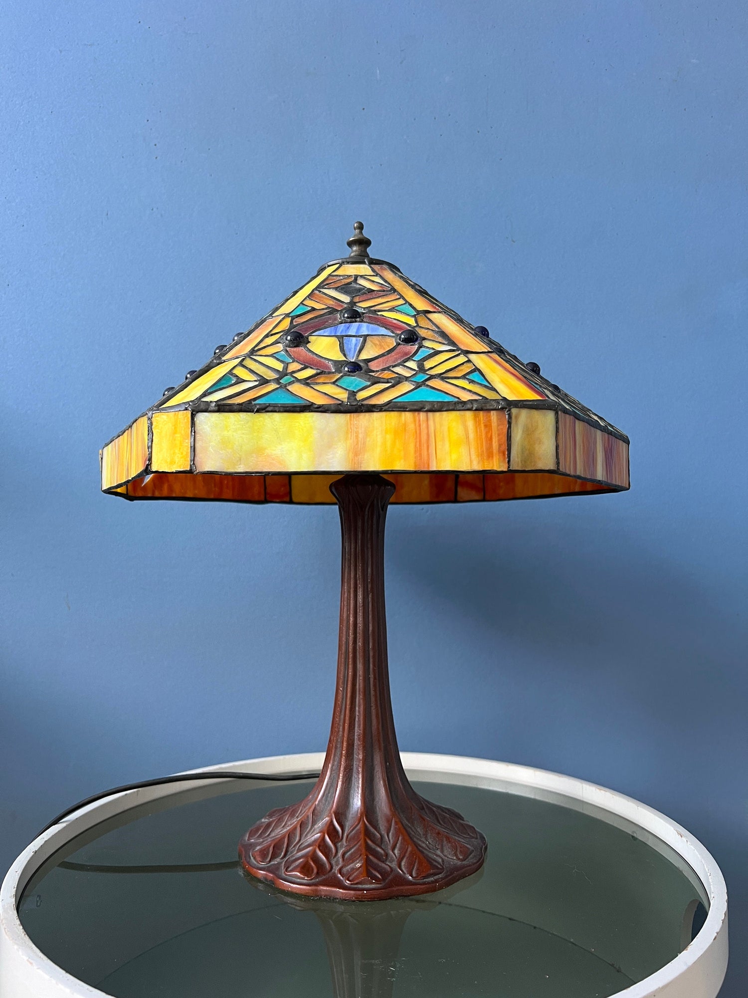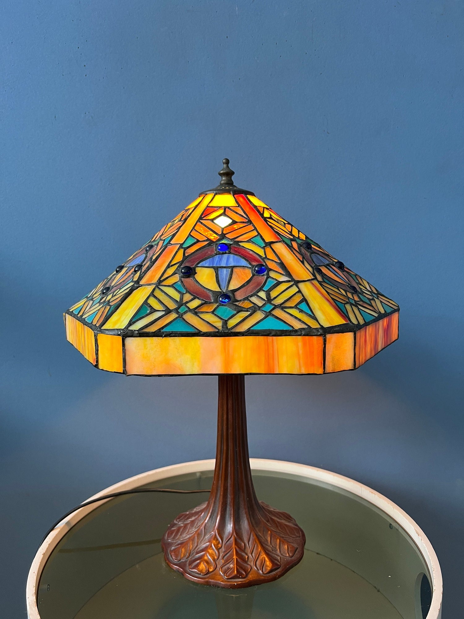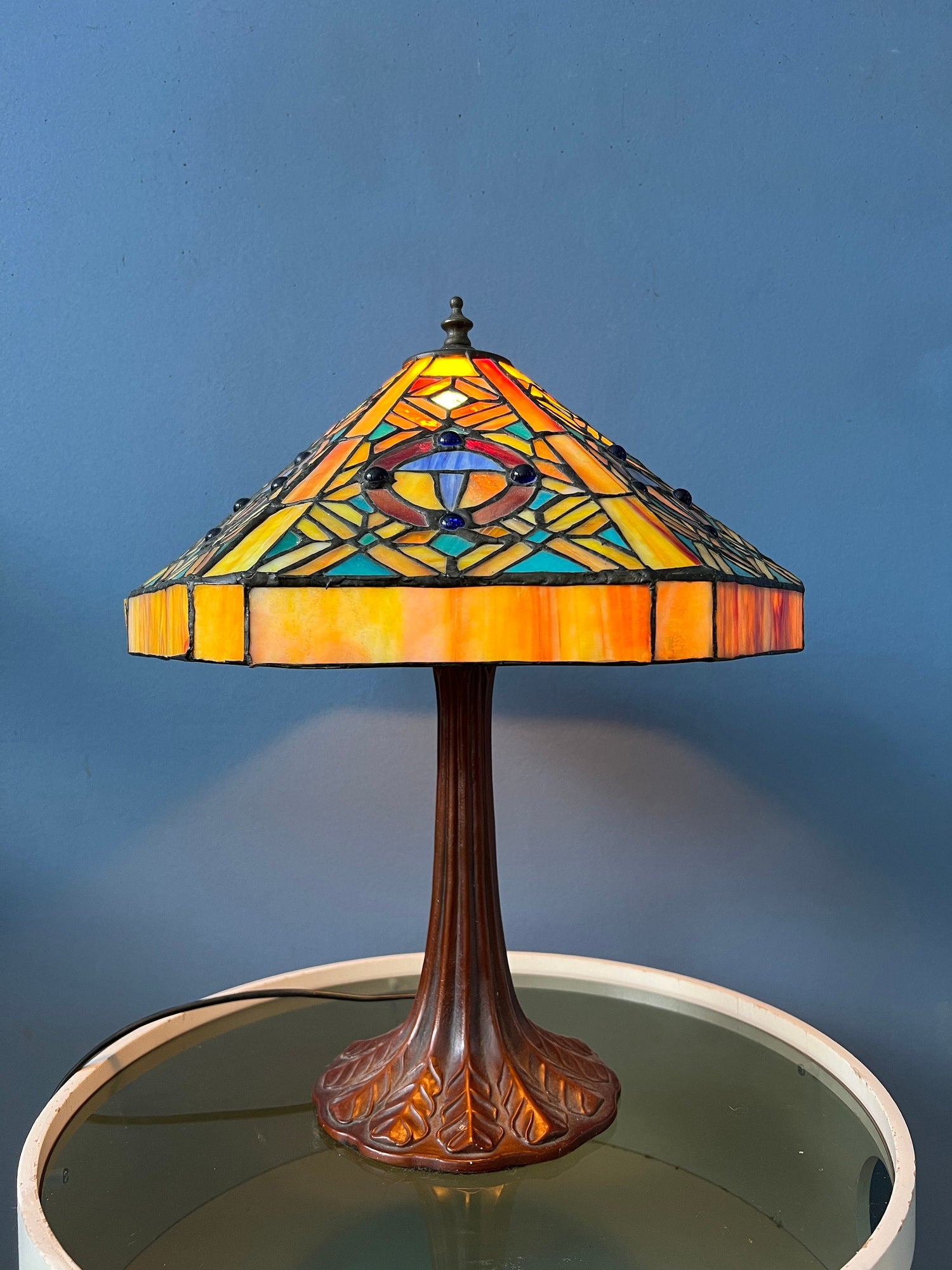 Big Tiffany table lamp with colourful stained glass shade. The base is made out of metal and the shade is made from acrylic. The stained glass creates a beautiful light effect. The shade can be taken off the base and positioned in any way desirable. The lamp requires one E27/26 (standard) lightbulb and currently has an EU-plug (easily used outside EU with plug converter).