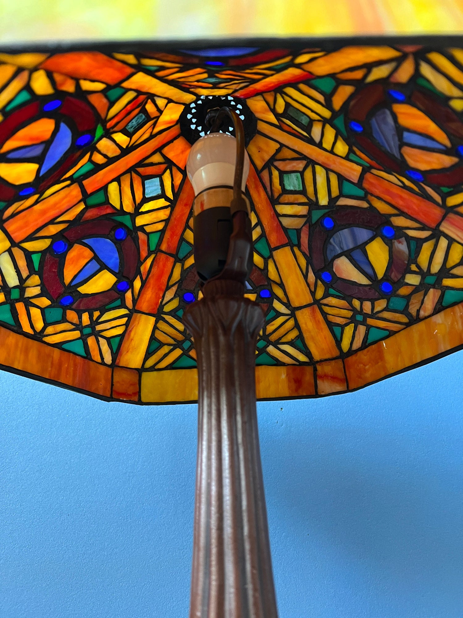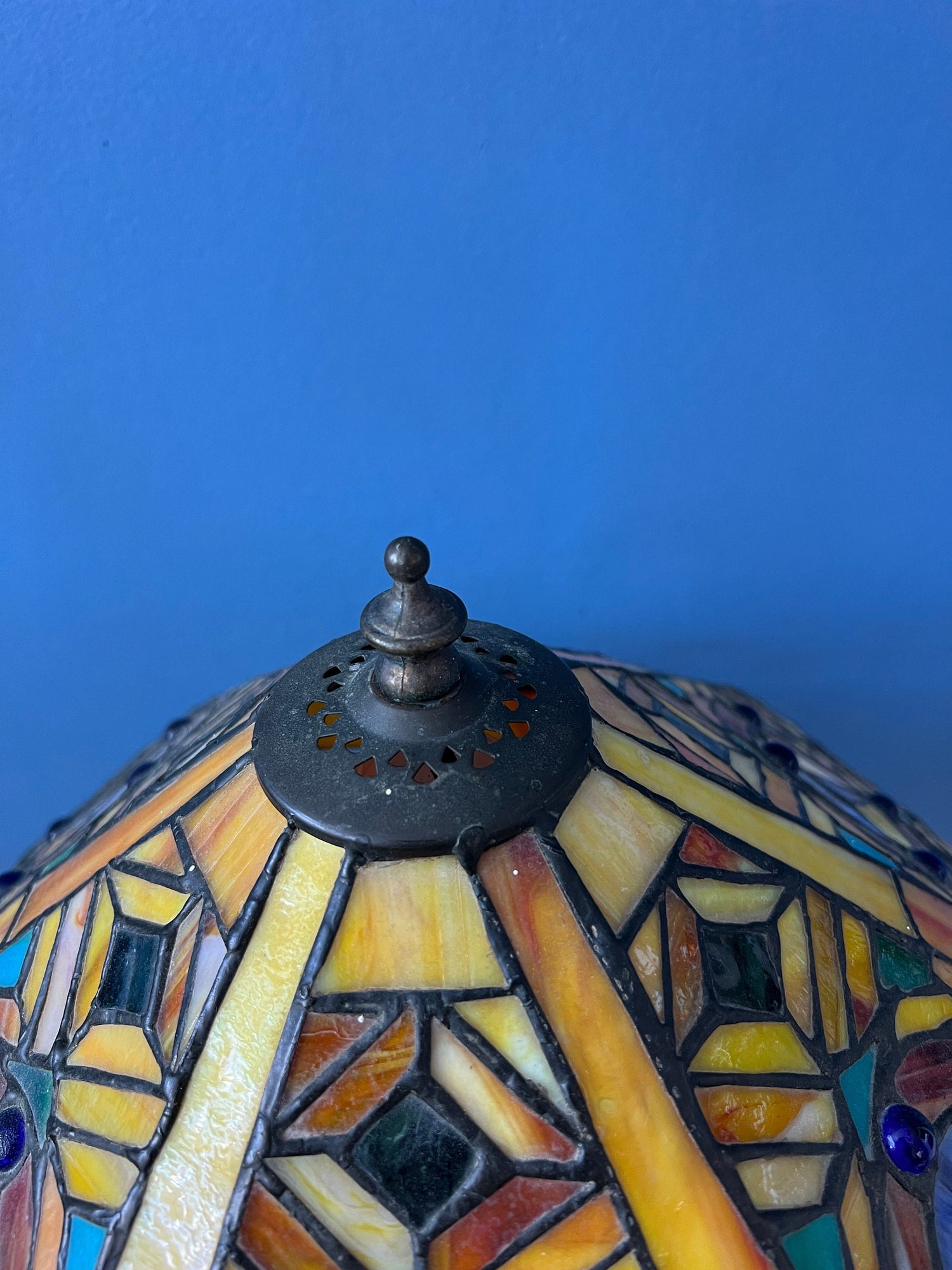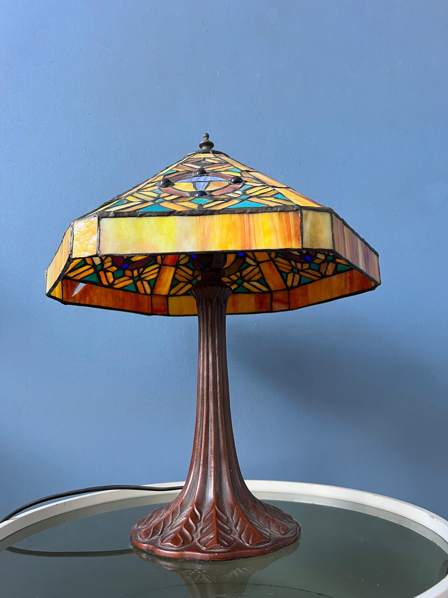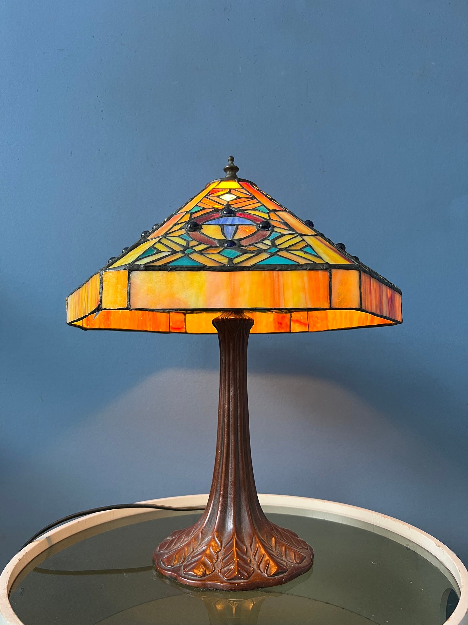 Big Tiffany table lamp with colourful stained glass shade. The base is made out of metal and the shade is made from acrylic. The stained glass creates a beautiful light effect. The shade can be taken off the base and positioned in any way desirable. The lamp requires one E27/26 (standard) lightbulb and currently has an EU-plug (easily used outside EU with plug converter).