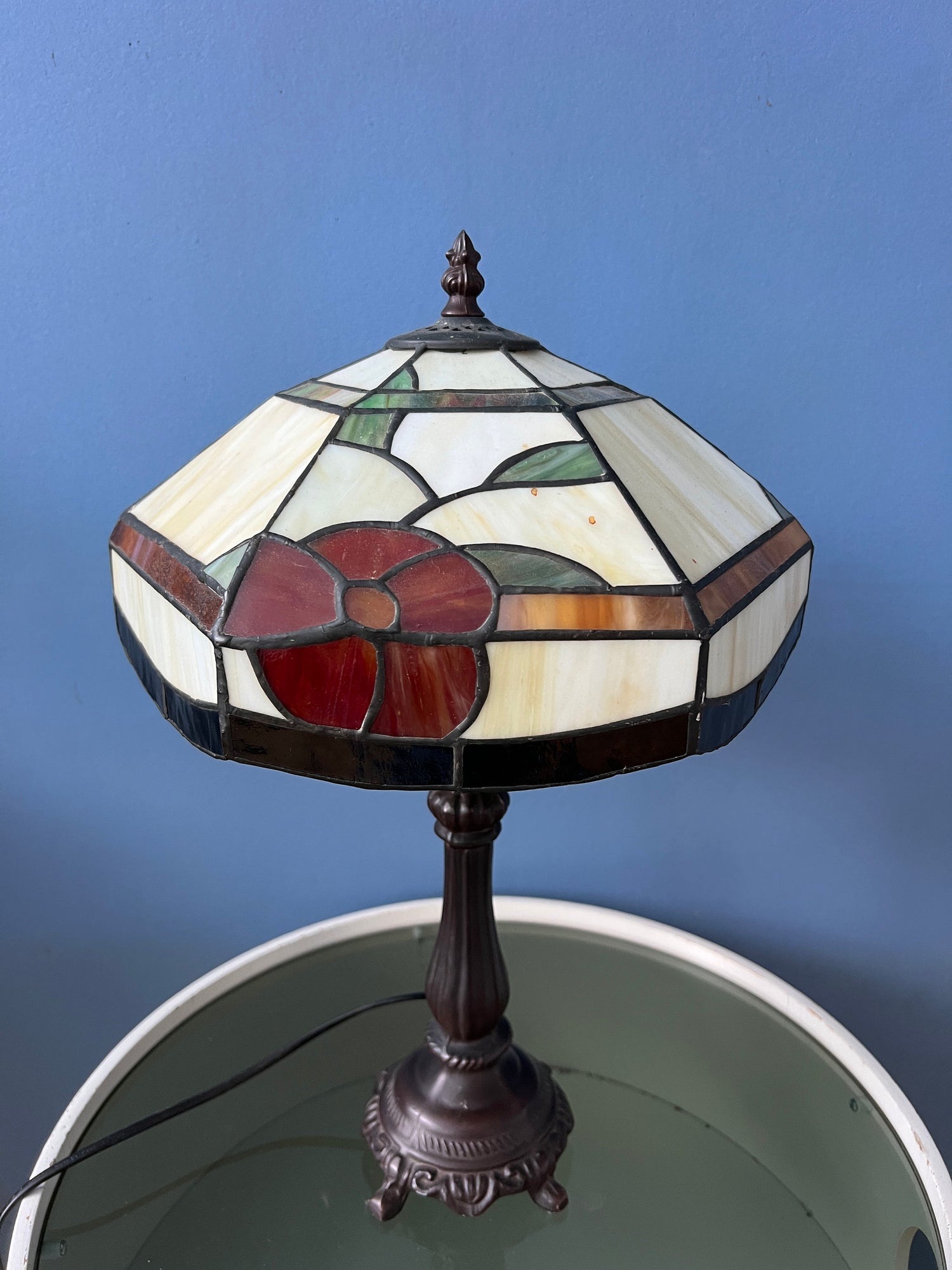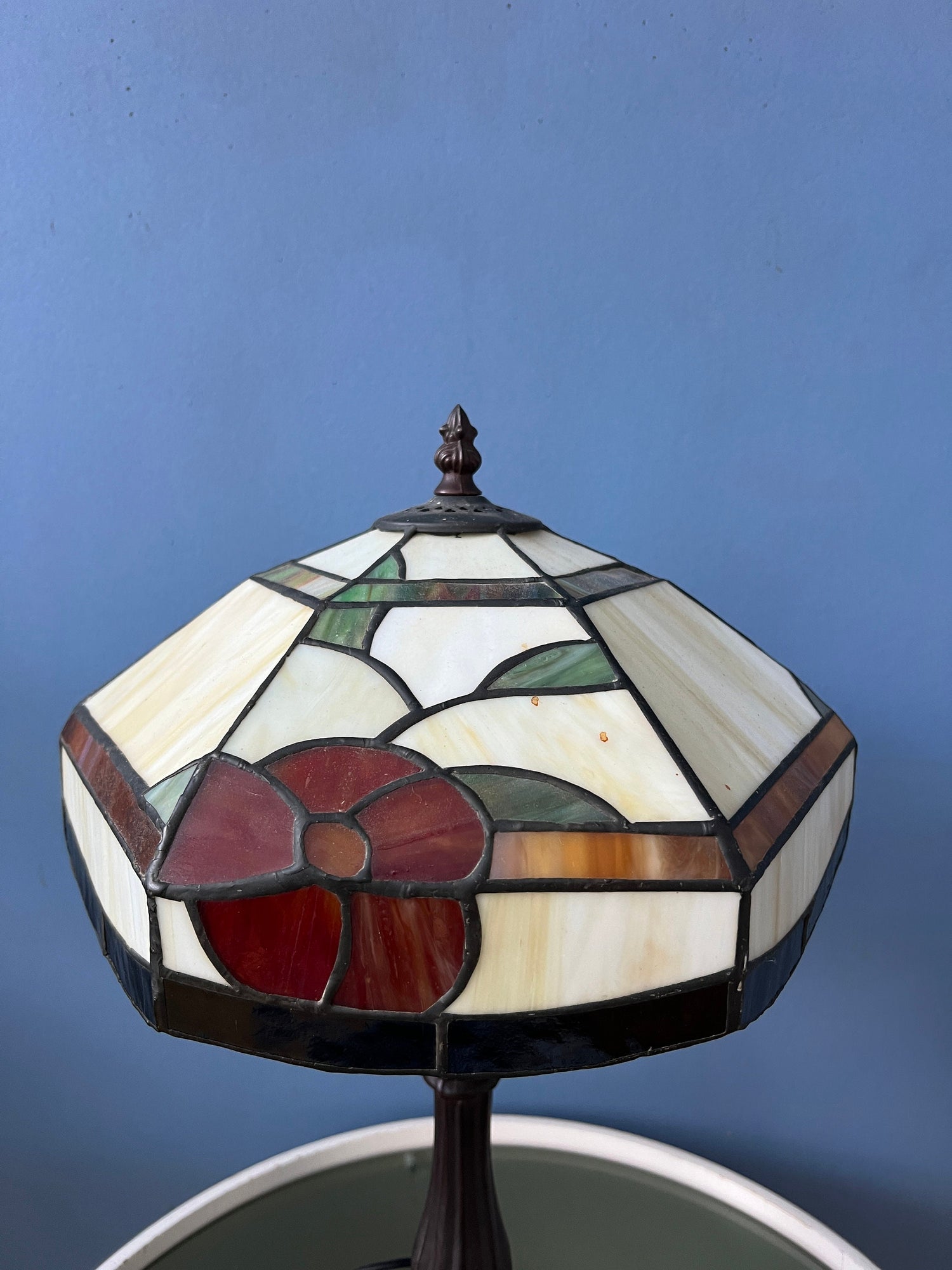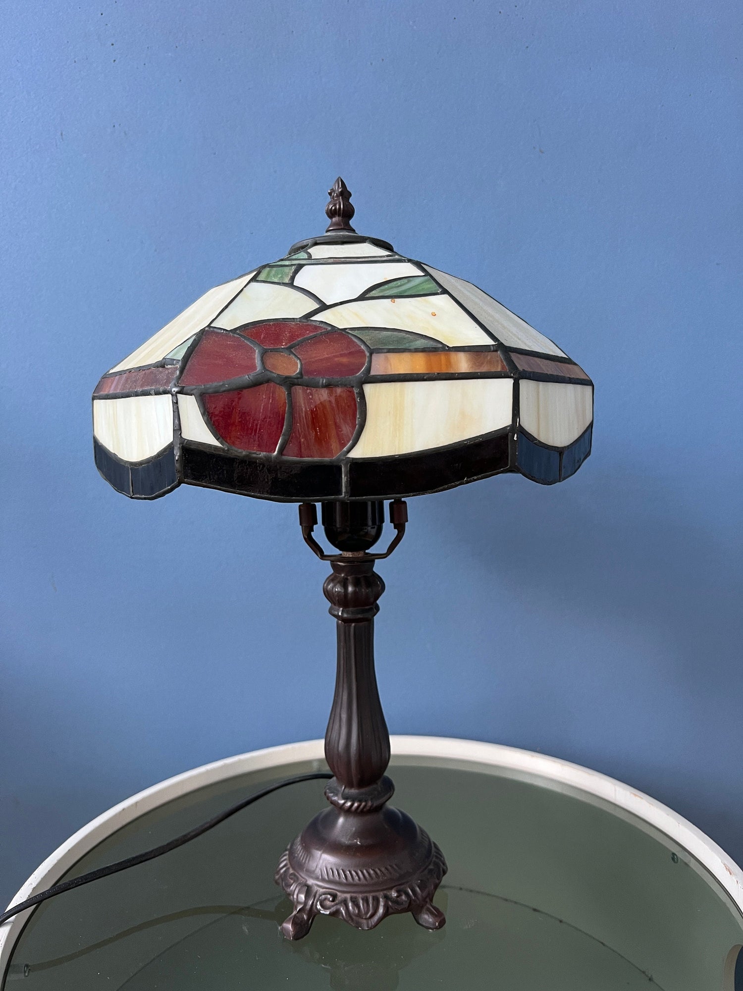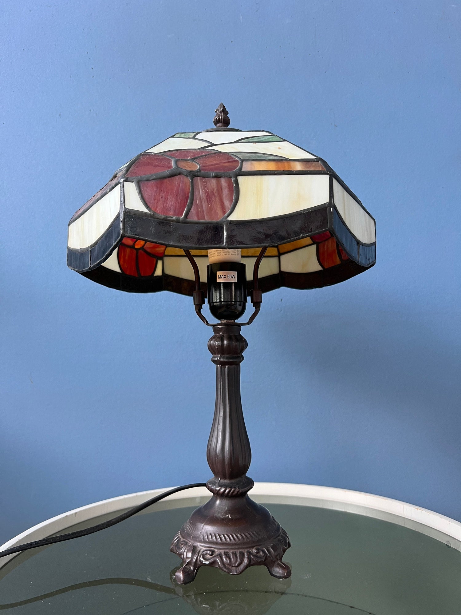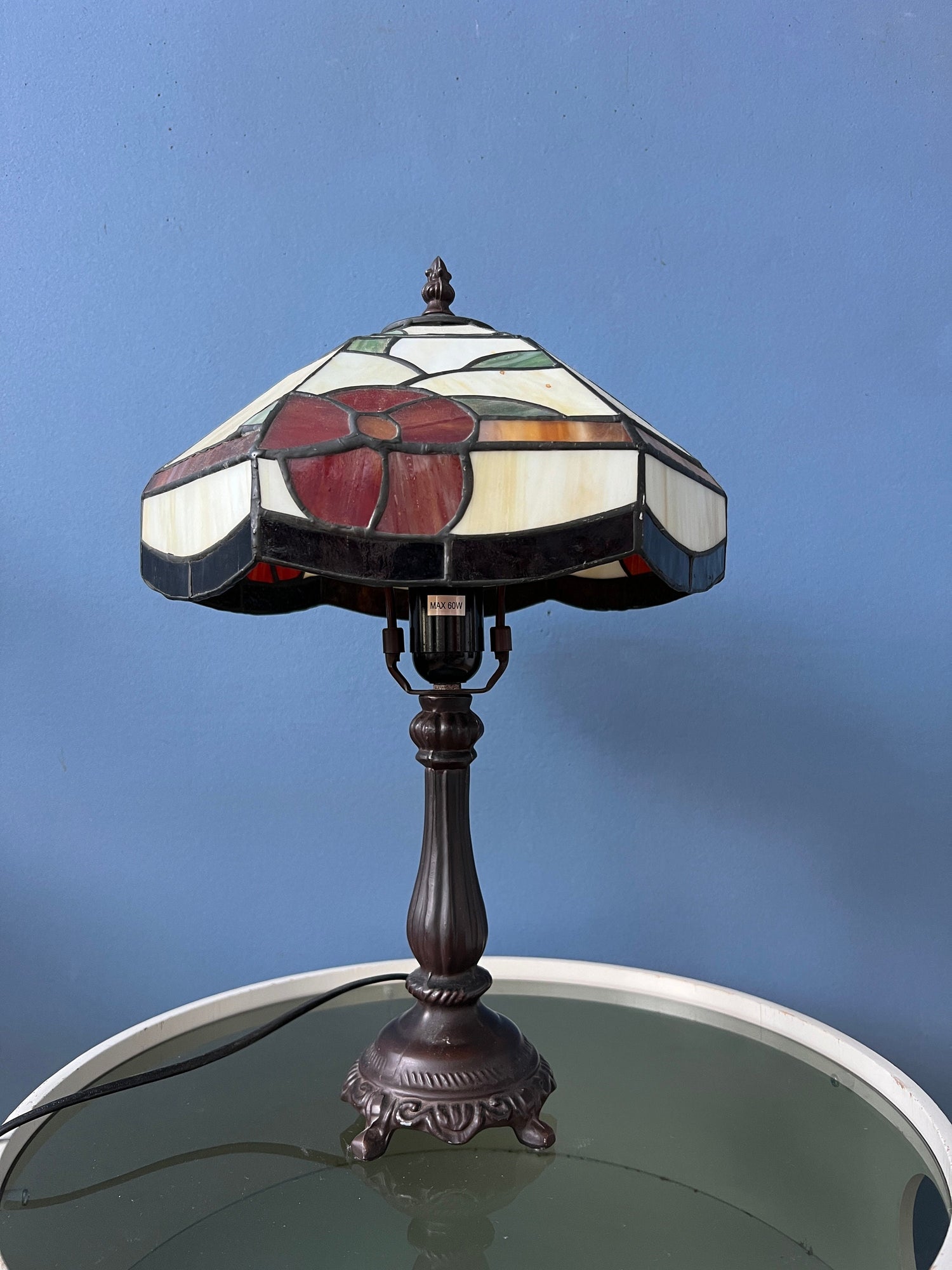 Tiffany style desk lamp with beautifully patterned stained glass shade. The base is made out of metal and the shade is made out of acrylic. The stained glass produces a warm light effect. The shade can be taken off the base and positioned in any way desirable. The lamp requires one E27/26 (standard) lightbulb and currently has an EU-plug (easily used outside EU with plug converter).