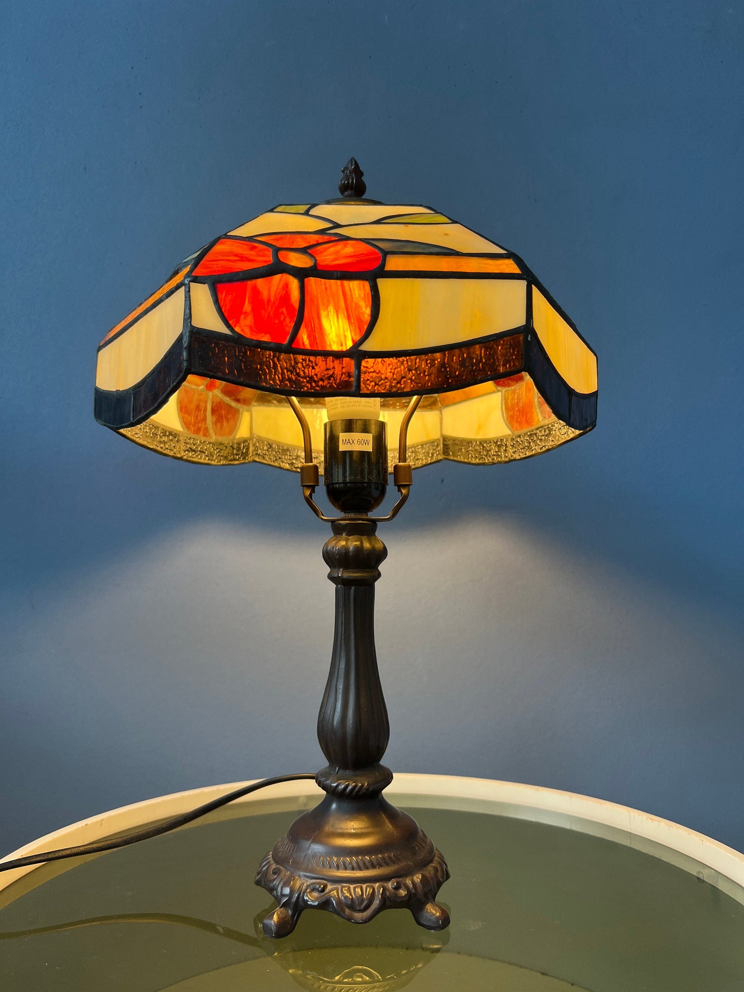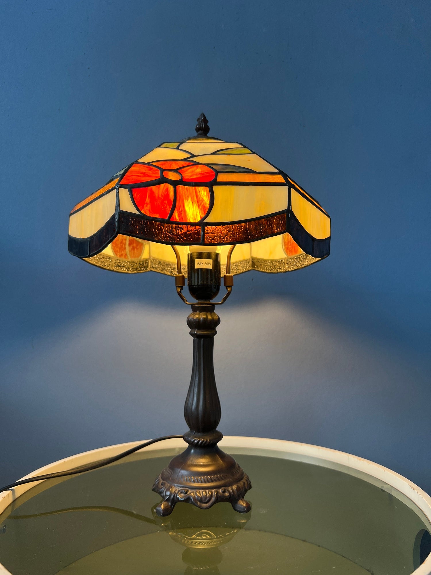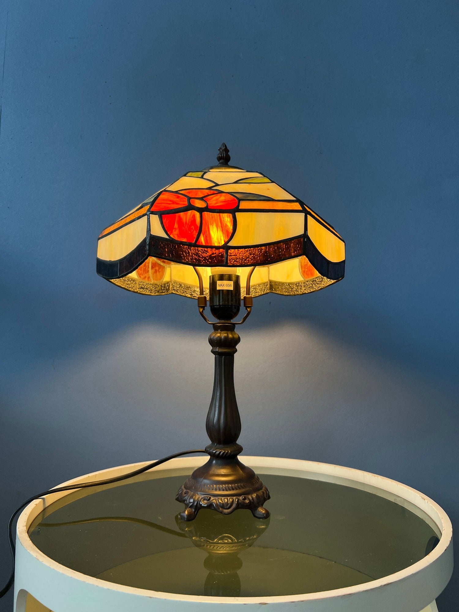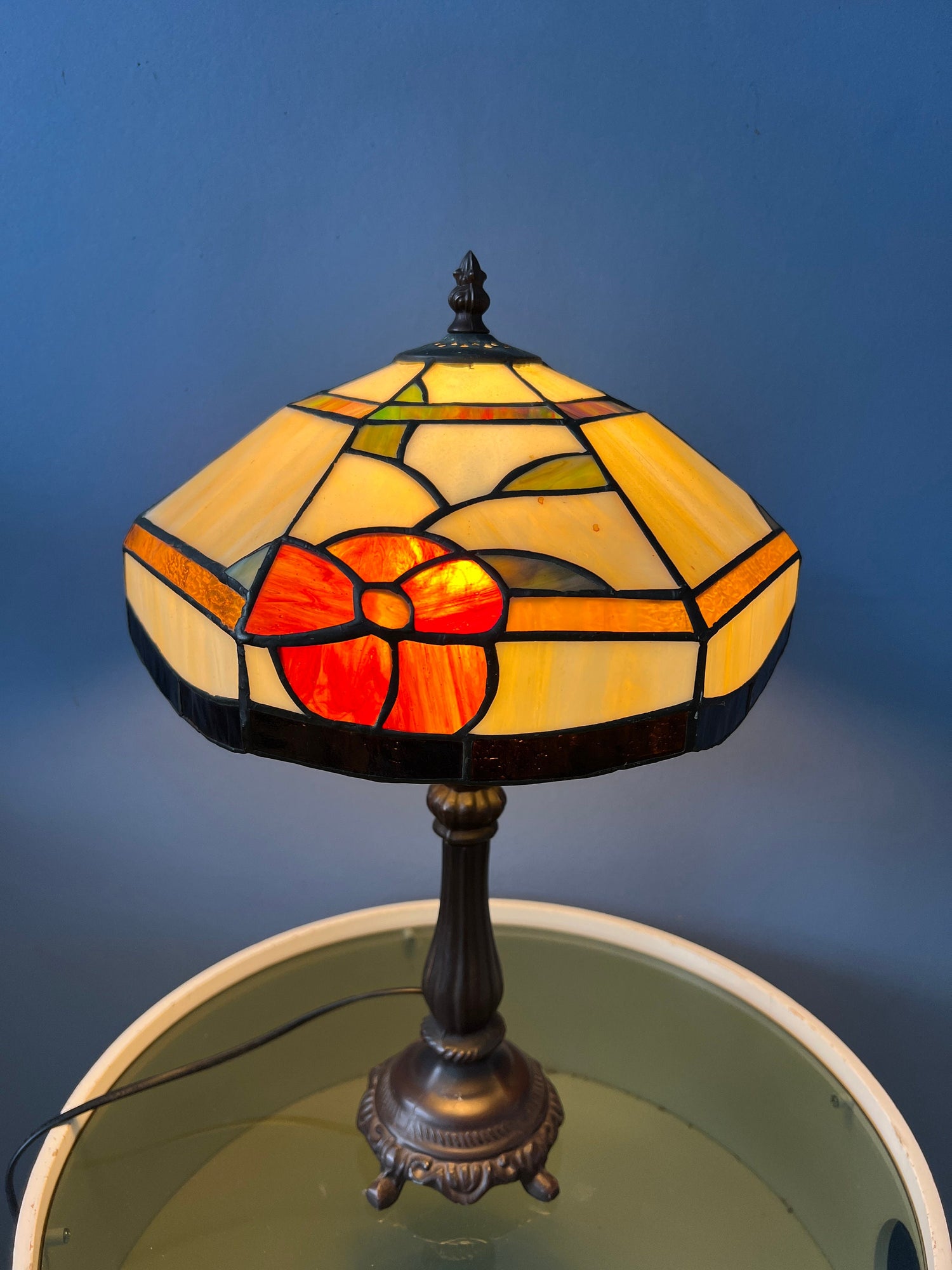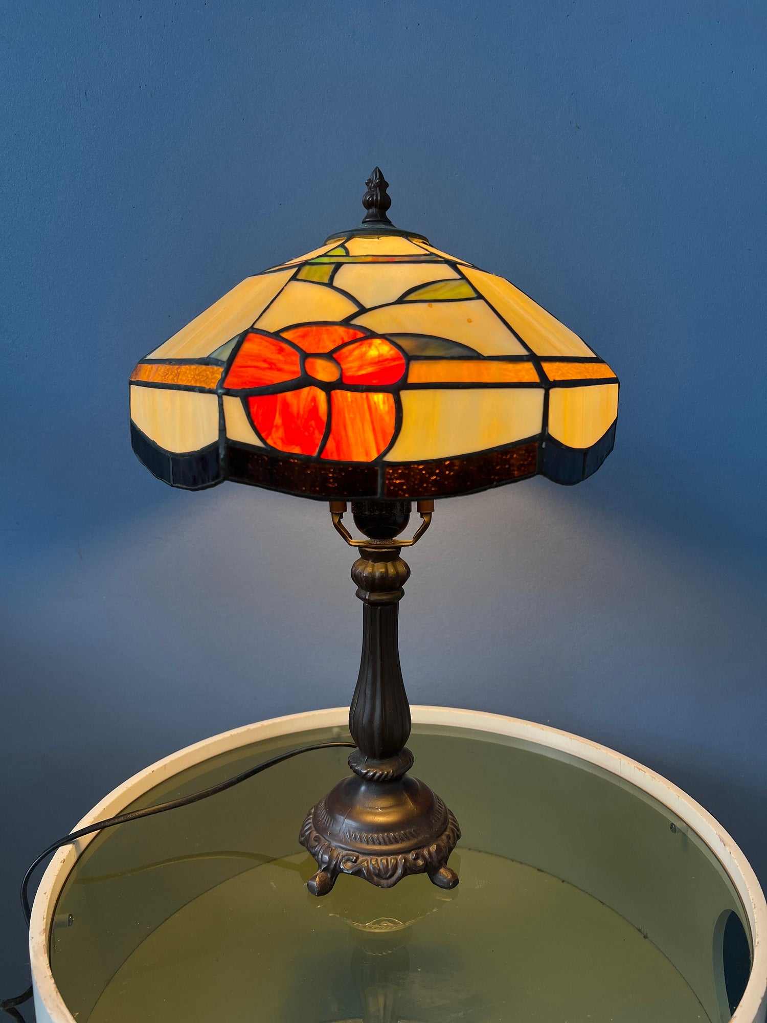 Tiffany style desk lamp with beautifully patterned stained glass shade. The base is made out of metal and the shade is made out of acrylic. The stained glass produces a warm light effect. The shade can be taken off the base and positioned in any way desirable. The lamp requires one E27/26 (standard) lightbulb and currently has an EU-plug (easily used outside EU with plug converter).