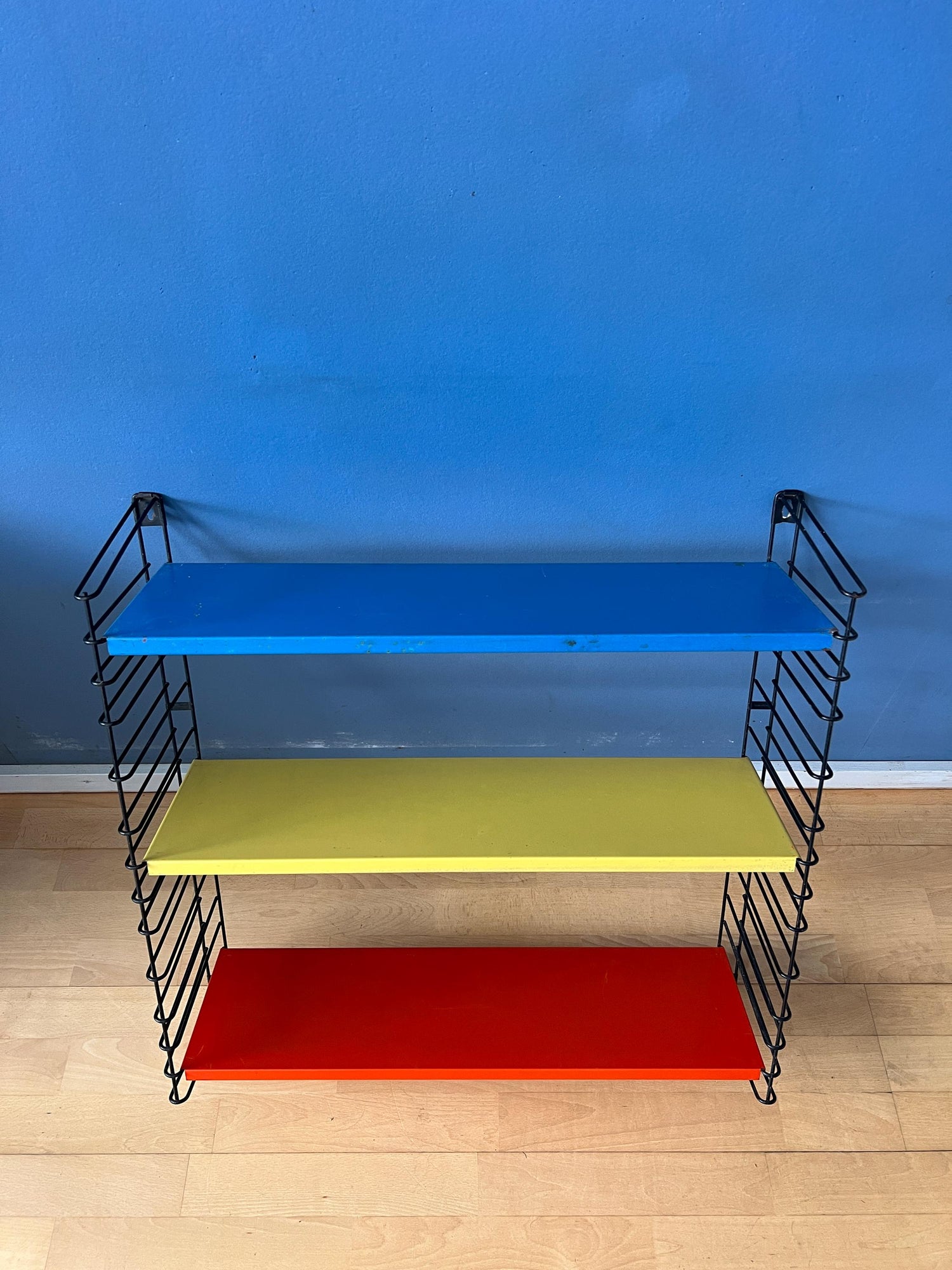 Original very colourful vintage Tomado wall system with shelves in yellow, red and blue colour. The metal Tomado wall shelving unit was designed by Adriaan Dekker and originally inspired by Nisse Strinning. The modular wall unit consists of two black ladders and three metal wall shelves. The wall rack is easily mounted with 4 screws.
