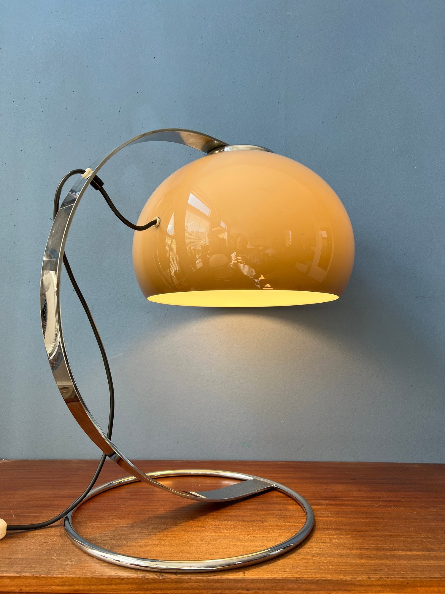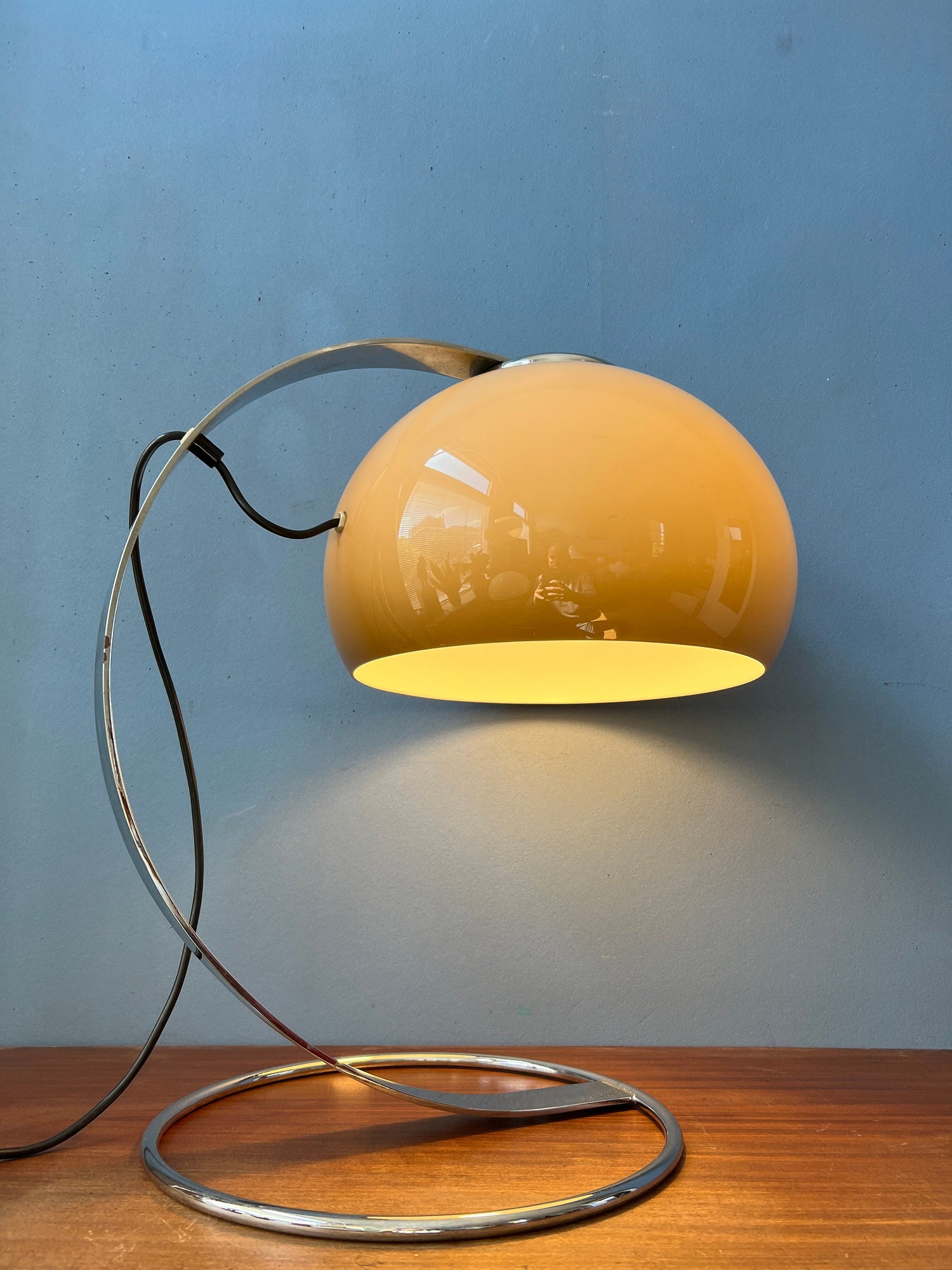 A big and extremely rare mushroom desk lamp by Dijkstra. The lamp consists of a mocca-coloured mushroom shade and has a beautifully designed chrome frame. The lamps requires one E27 (standard) lightbulb and currently has an EU-plug.