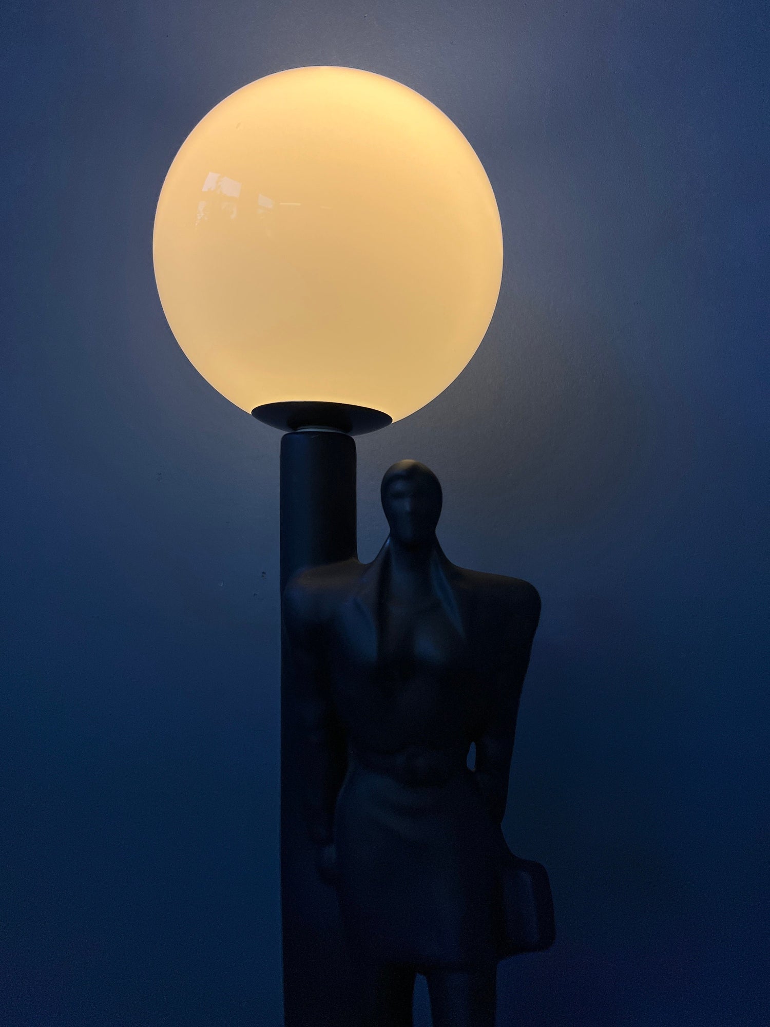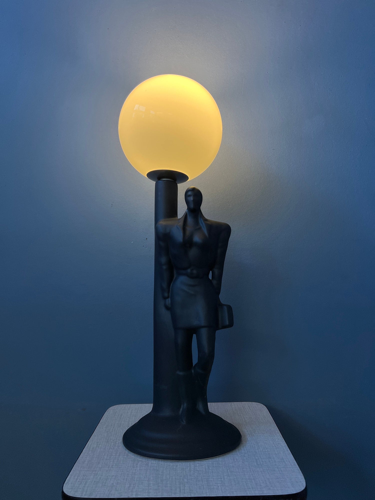 Vintage art deco style men figure table lamp with porcelain base and glass shade. The lamp requires one E14 lightbulb and currently has an EU-plug.