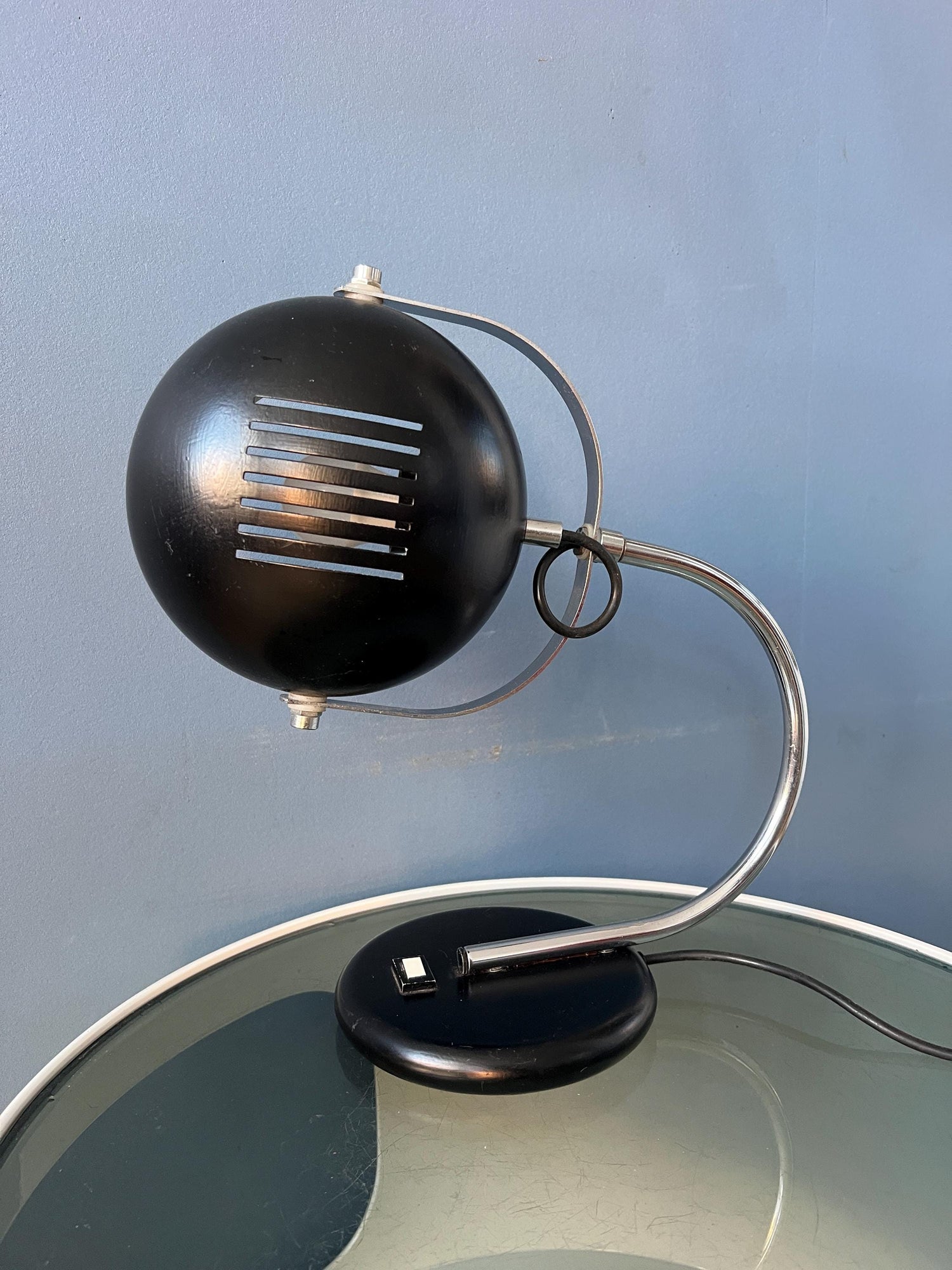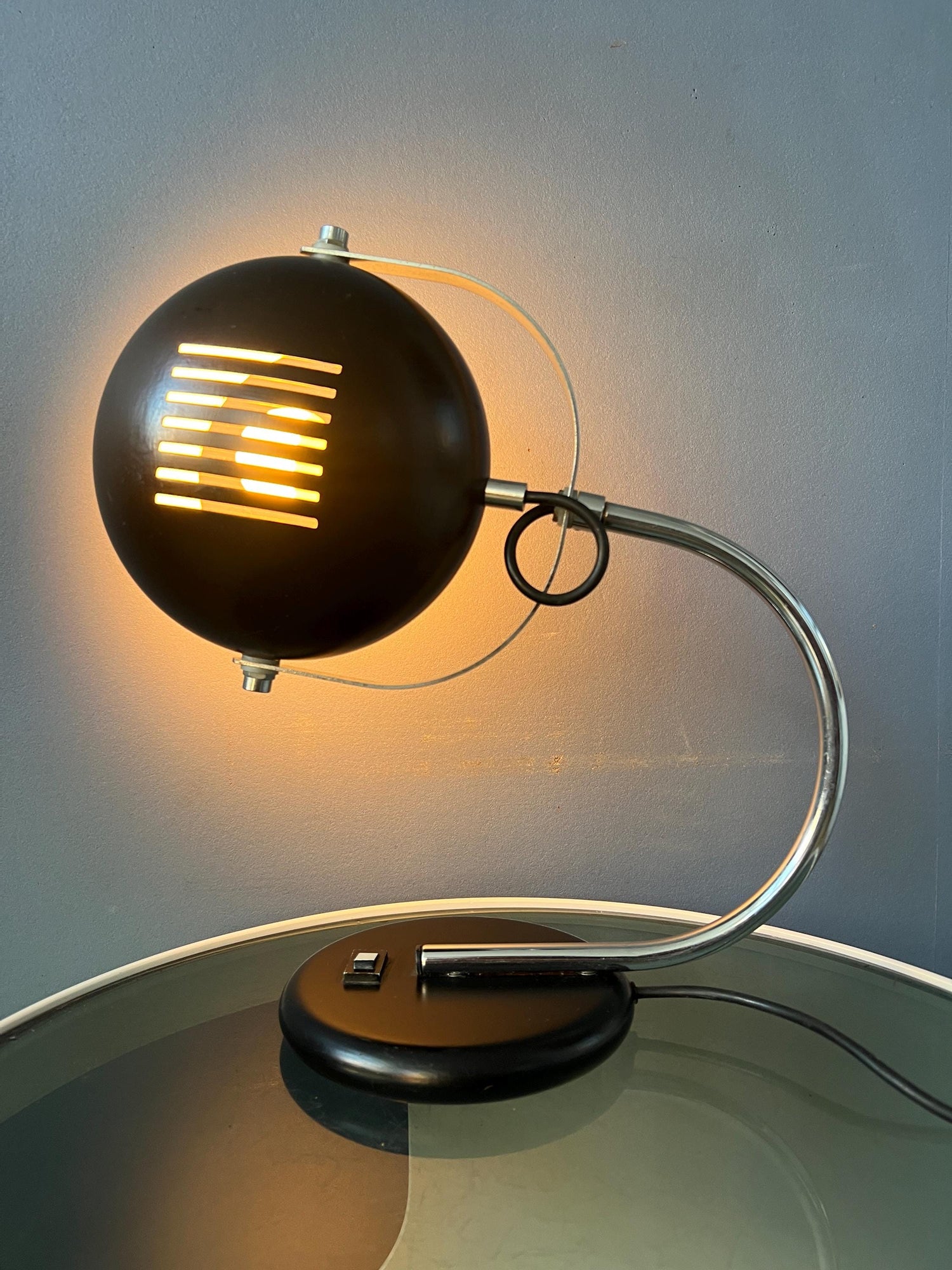 Brown space age table lamp with beautiful roster-like shade. The metal shade can be turned up and down. The bracket that holds the shade can also turn left and right. The lamp requires one E27/26 (standard) lightbulb and currently has an EU plug.