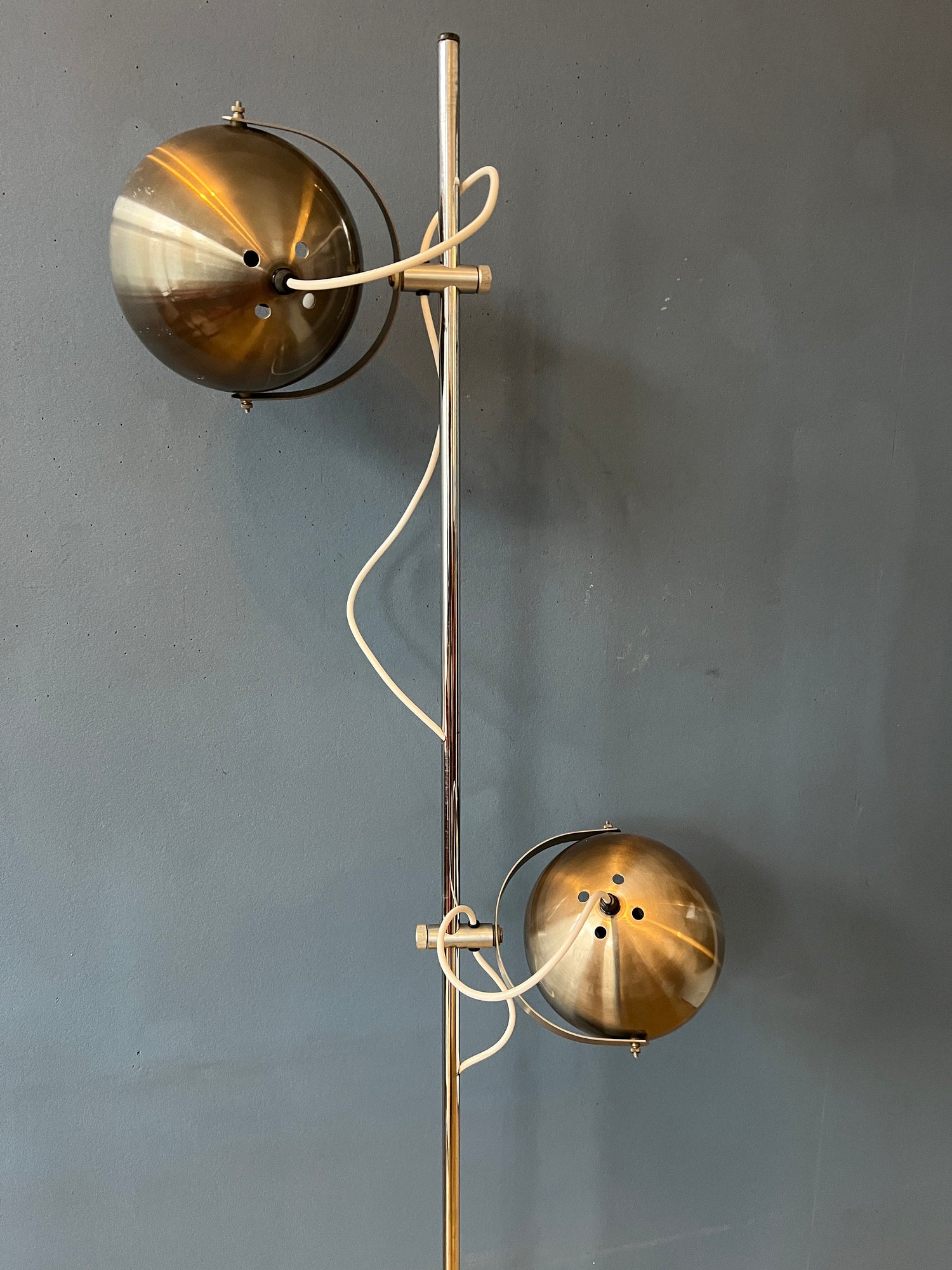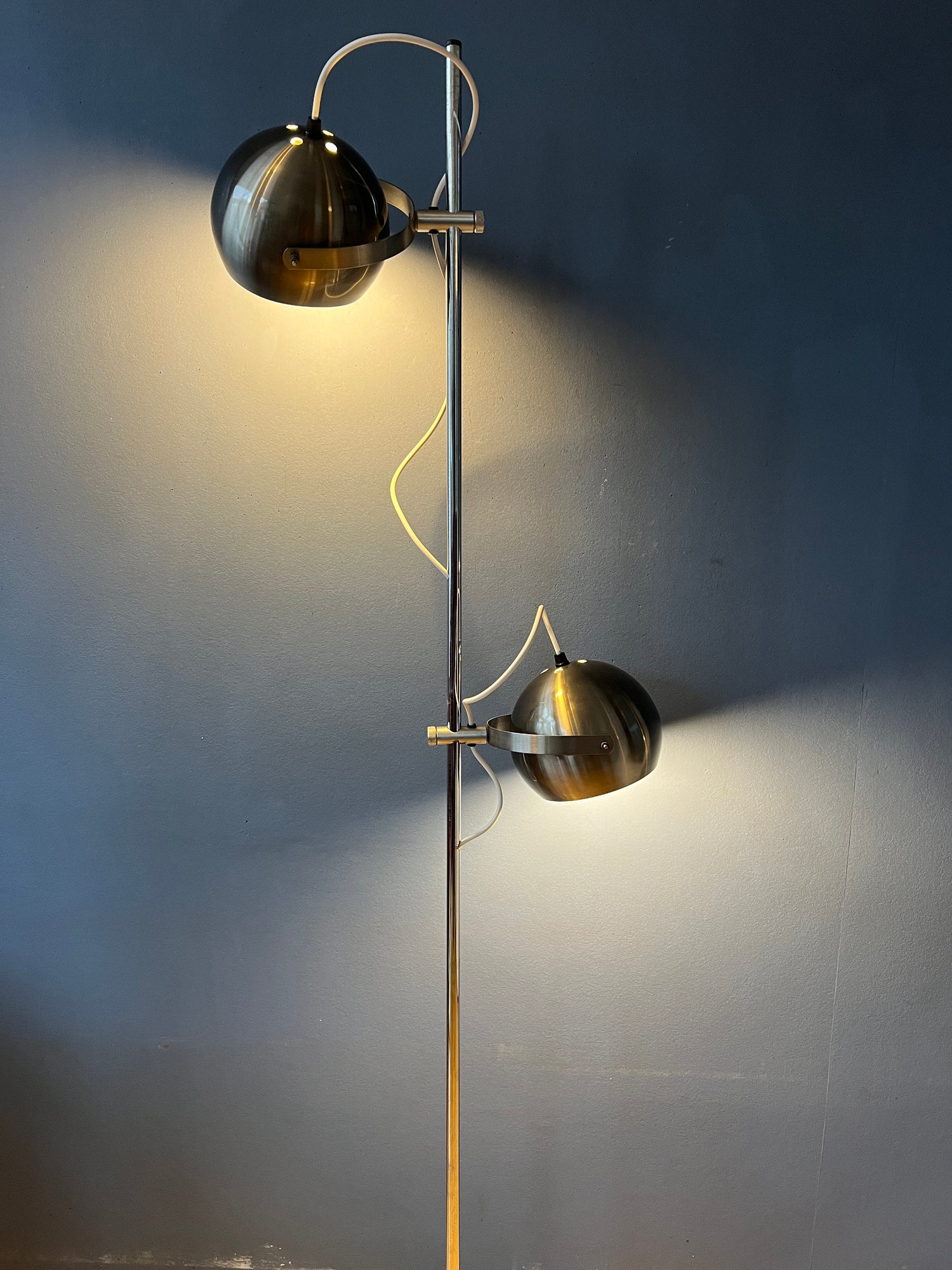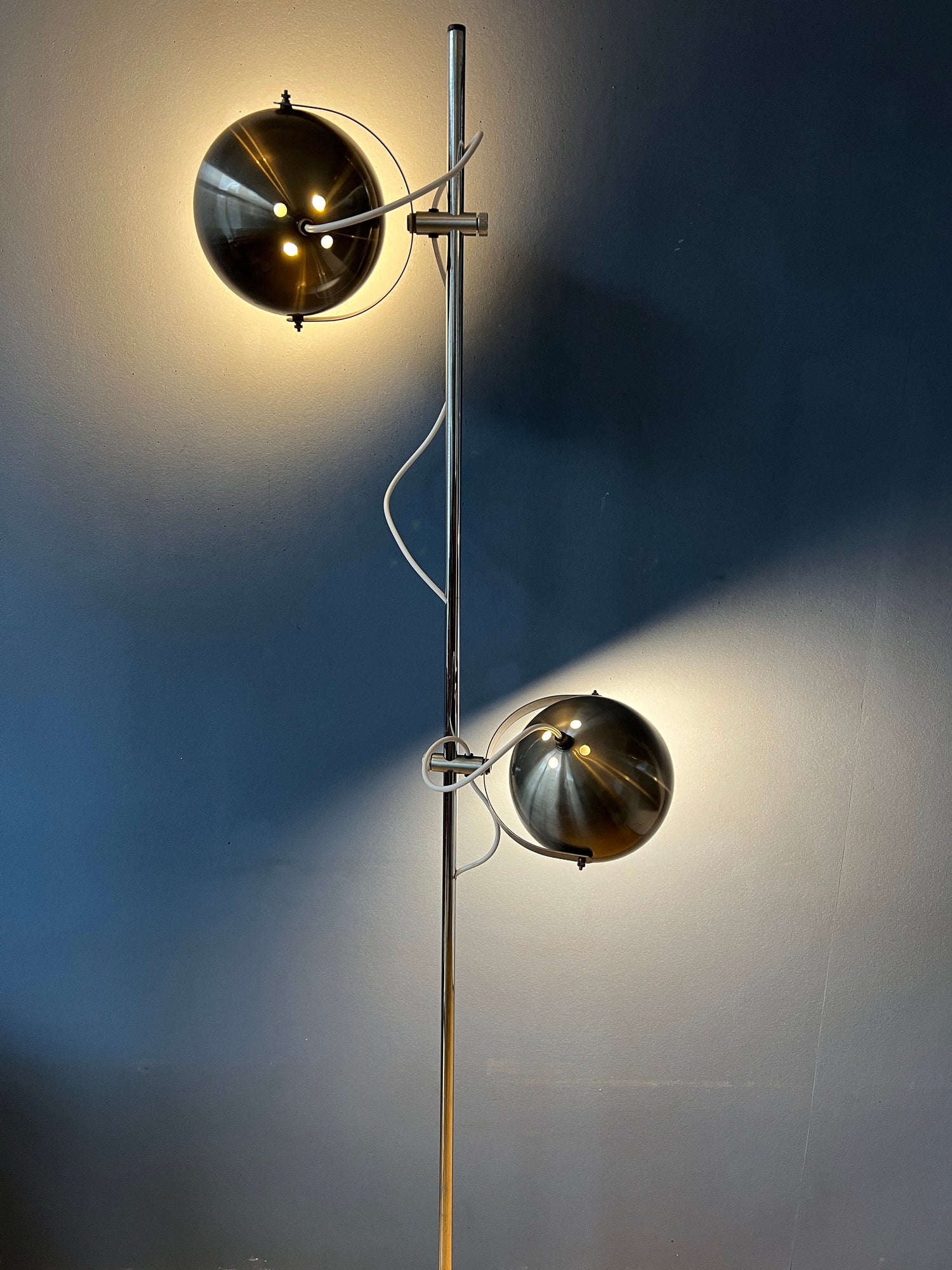 A classic eyeball floorlamp produced by the Dutch Herda in dark silver / gray colour. The design allows you to position the eyeball shades in any way desirable. They can also move up and down the pole. The lamp requires two E27/26 lightbulbs and currently has a EU-plug (easily used outside EU with plug converter).