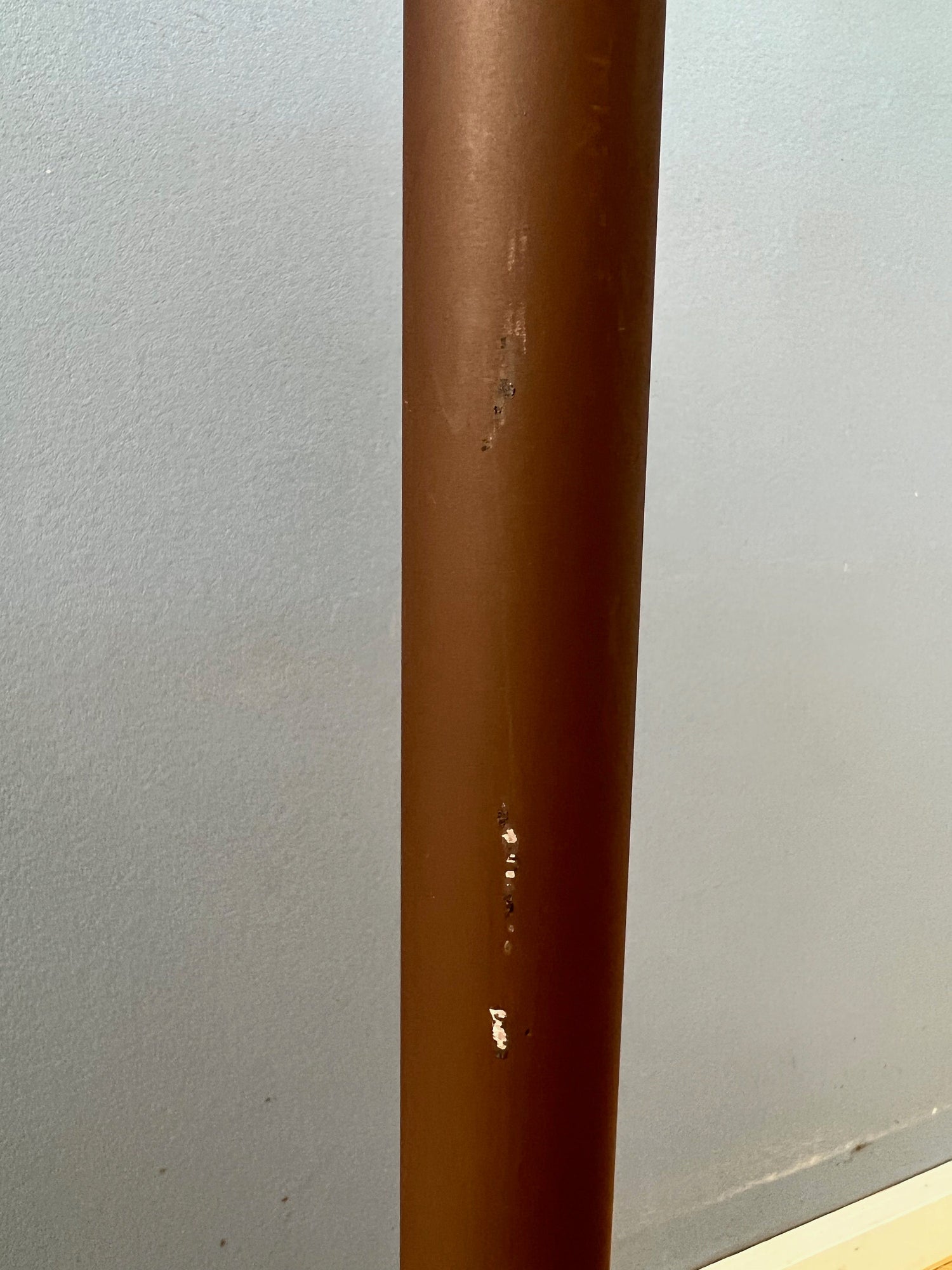 Very good. The shade and the base are still in good condition. One spot on the brown pole has some scratches to the lacquer, see last picture. The shade is slightly stretched due to the chrome frame, see picture.