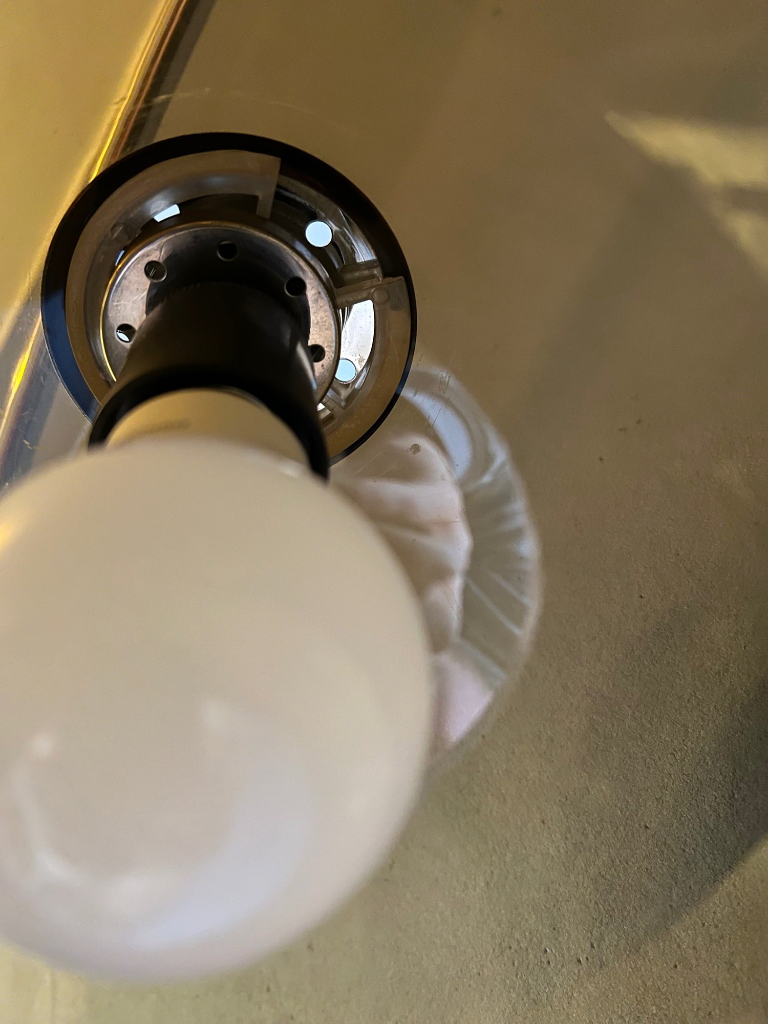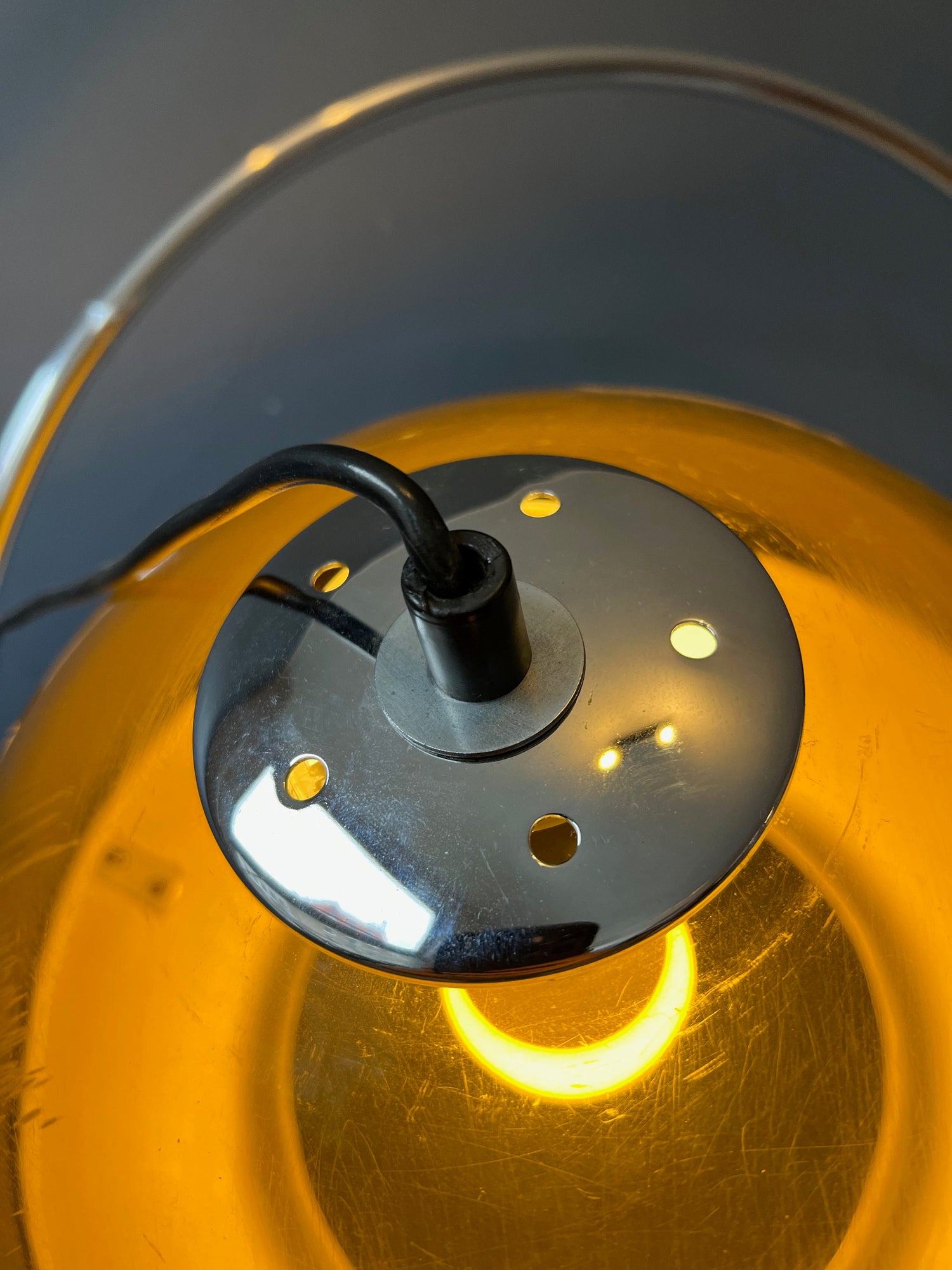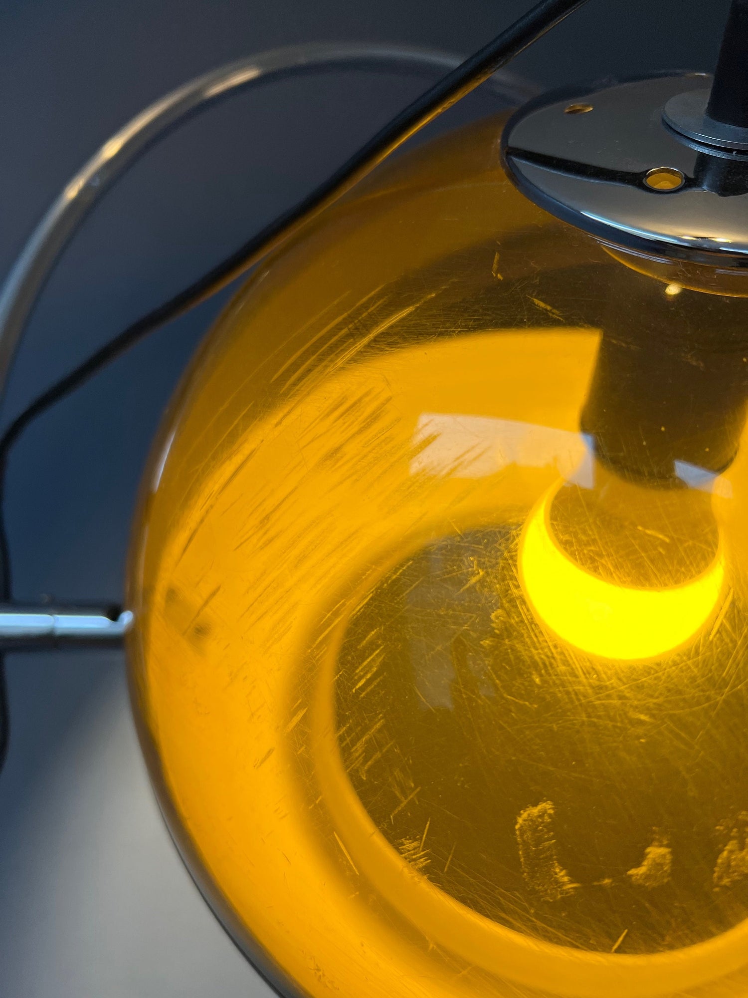 Good. The chrome is in great shape, just like the aluminium part of shade. The transparant part of shades clear scratches all over the shade, but especially one particular side, see last pictures. The inner ring of the shade that attaches it to the socket misses one small corner of its frame, but this is not visible, see last picture. Please let us know if you require more pictures of certain parts.