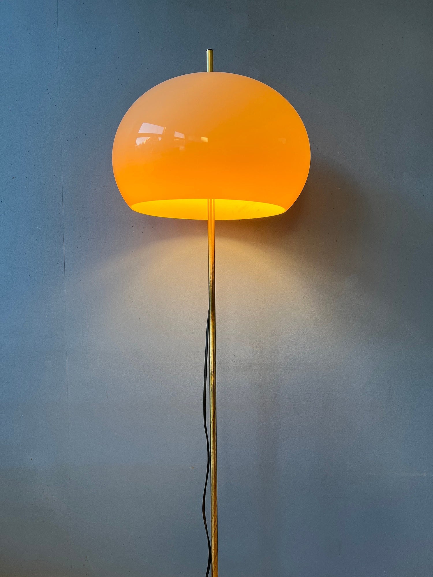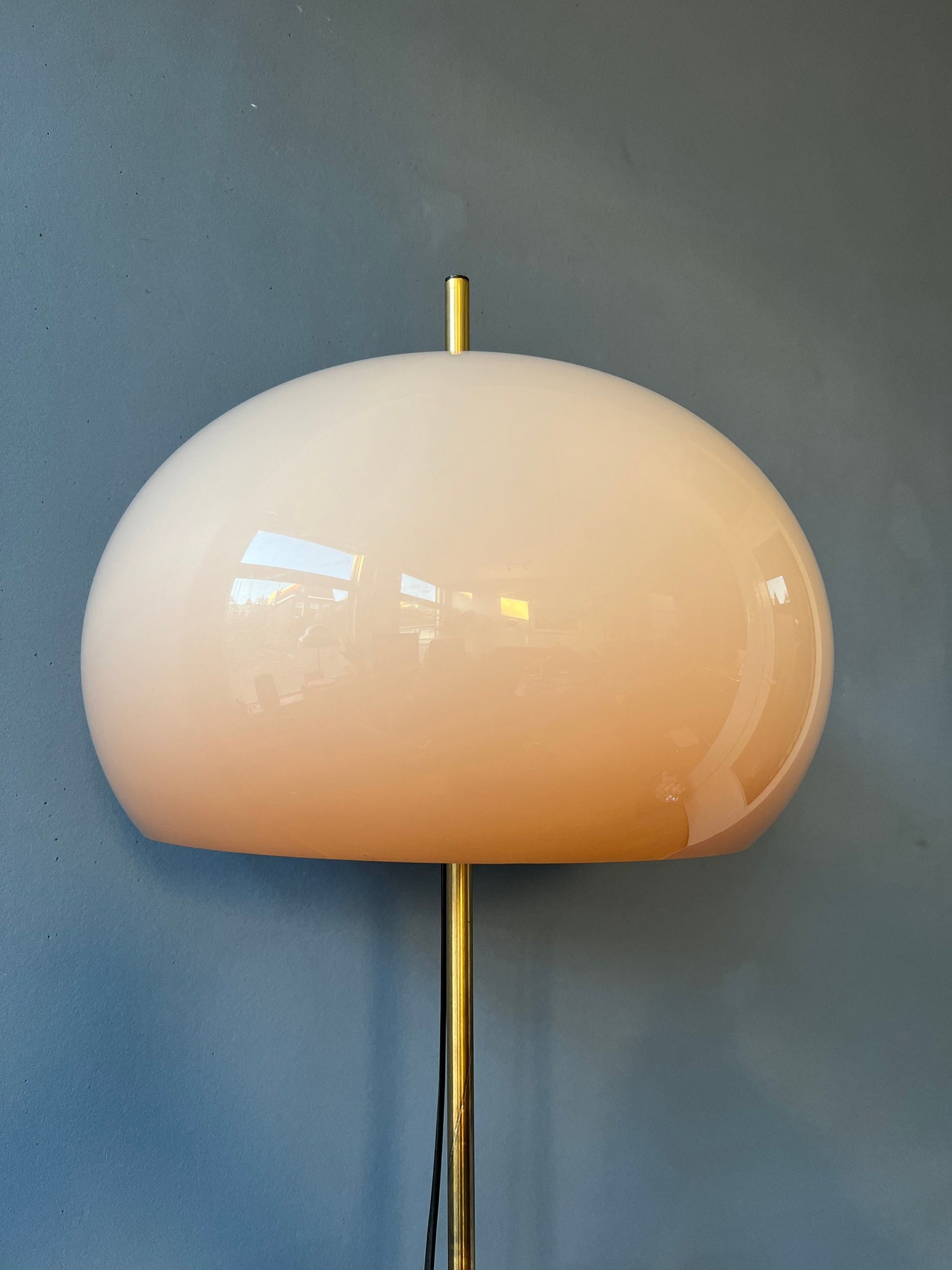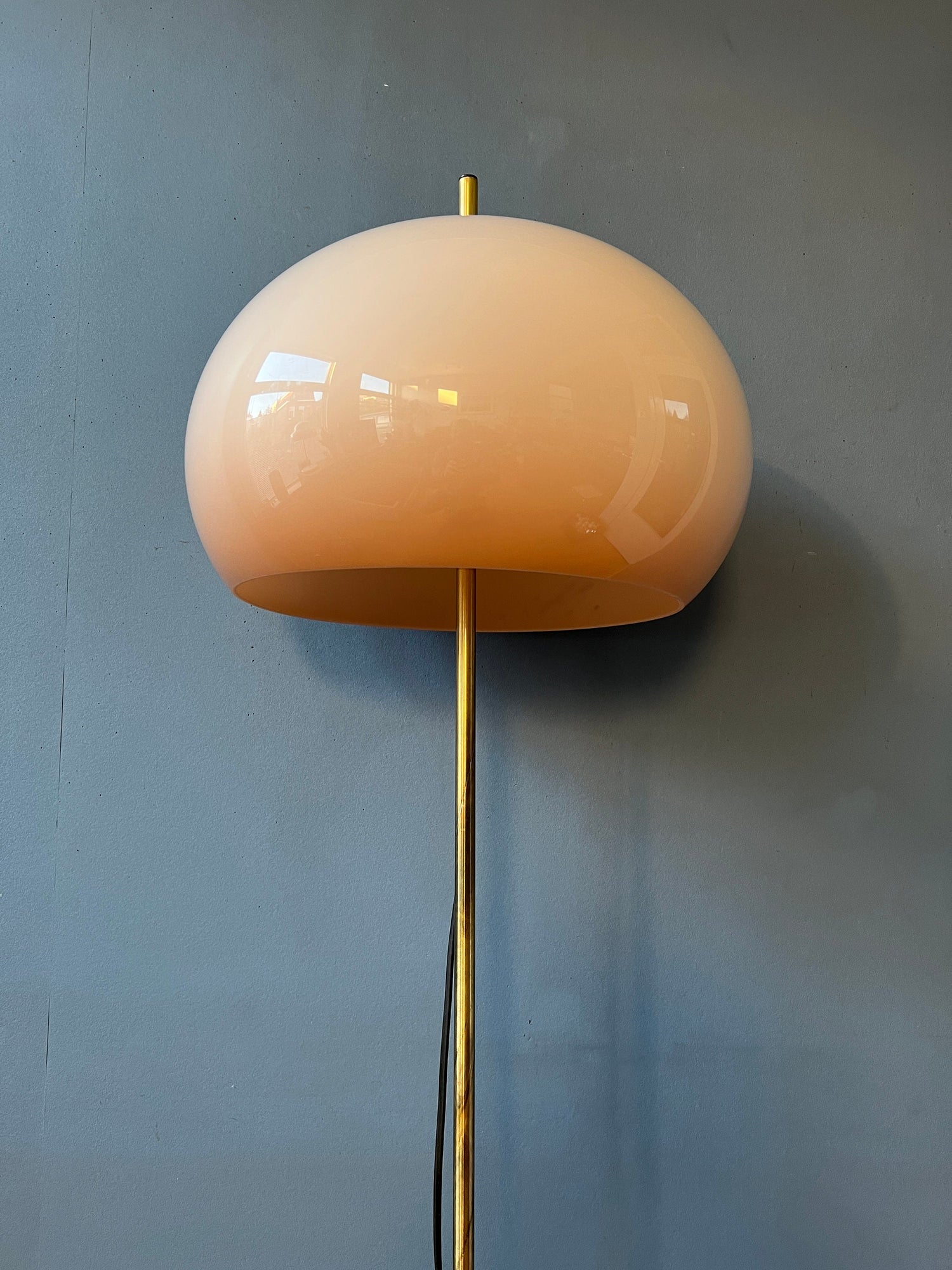 Vintage Dijkstra space age mushroom floor lamp in beige with pink/orange tones. The shade can be moved up and down the base. The lamp requires two E27/26 lightbulbs and currently has an EU-plug.