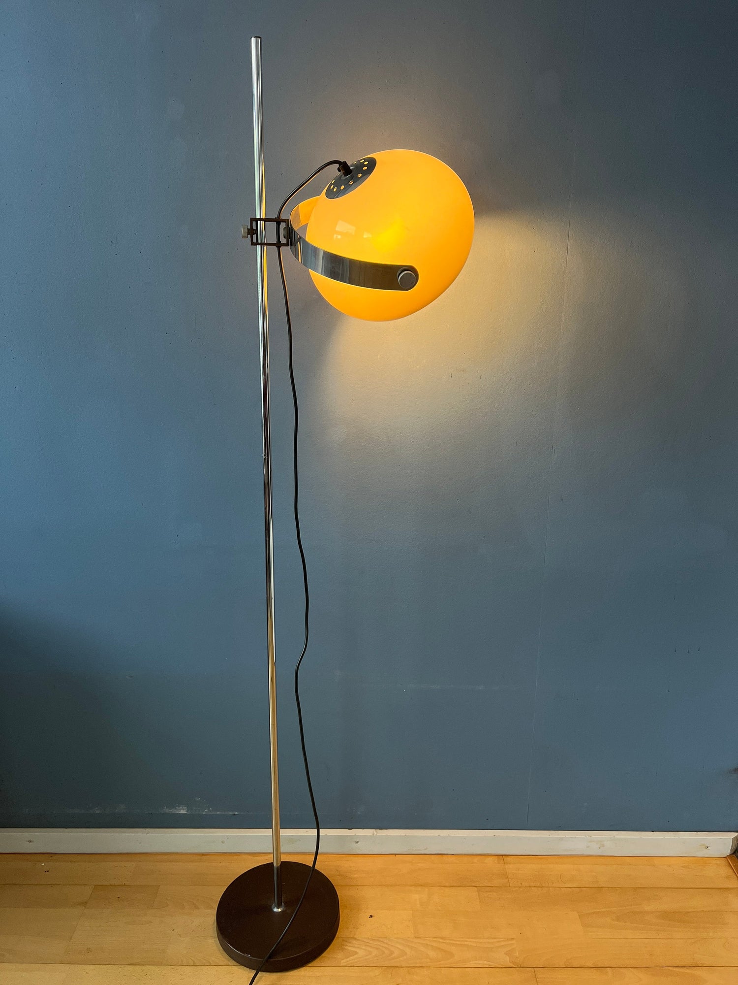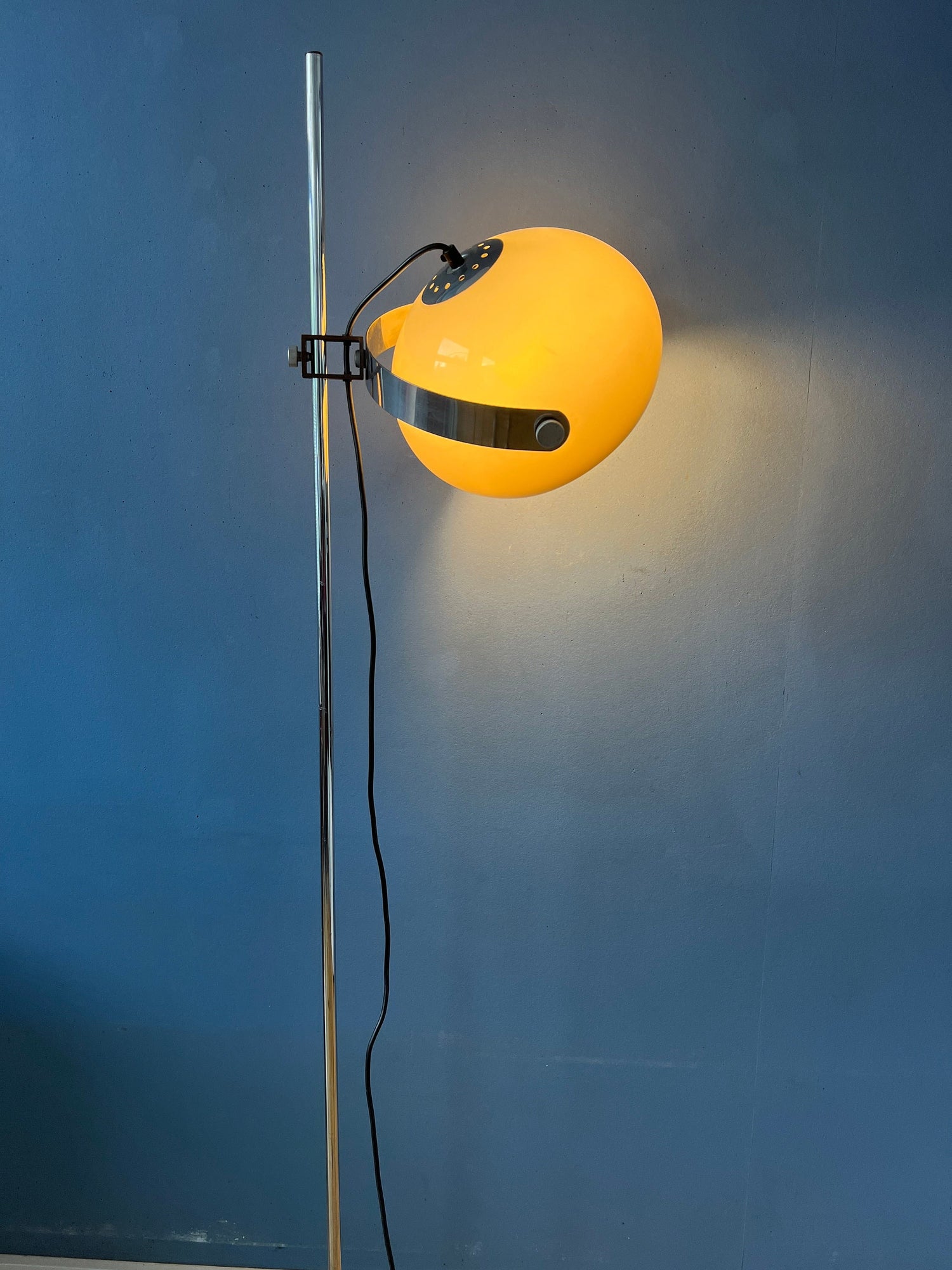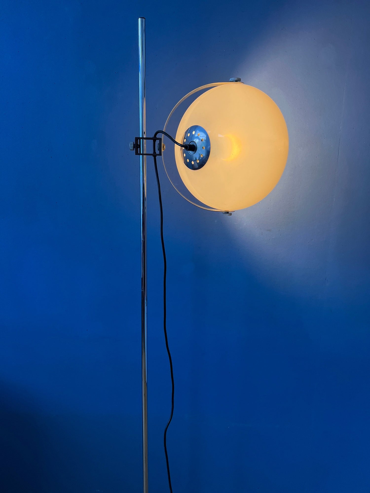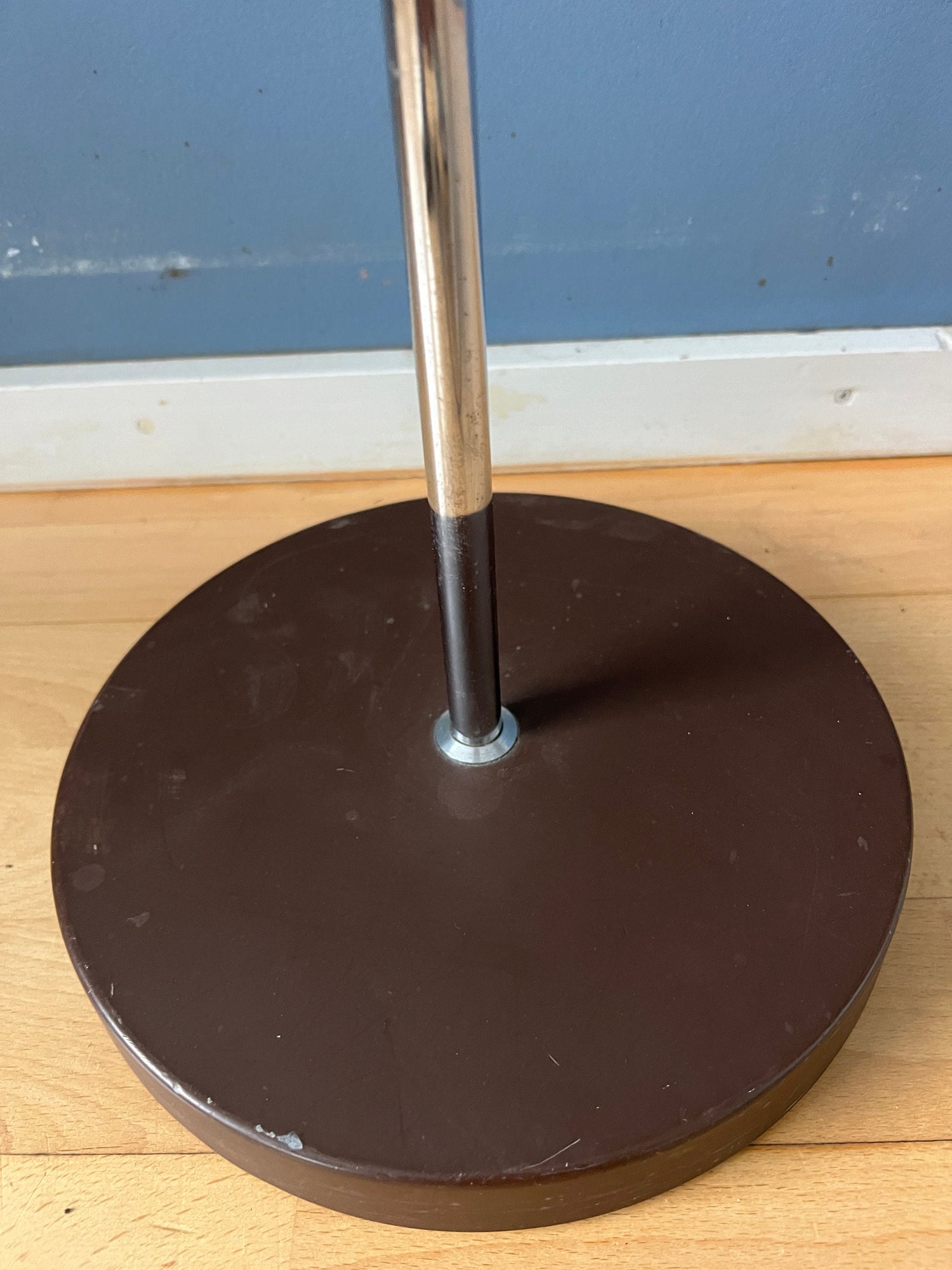 Dijkstra space age mushroom floor lamp with a beautiful glow. The mushroom shade can be turned in any direction and move up and down the base. The lamp requires one E27 lightbulb and currently has an EU-plug (works outside EU with plug-converter).