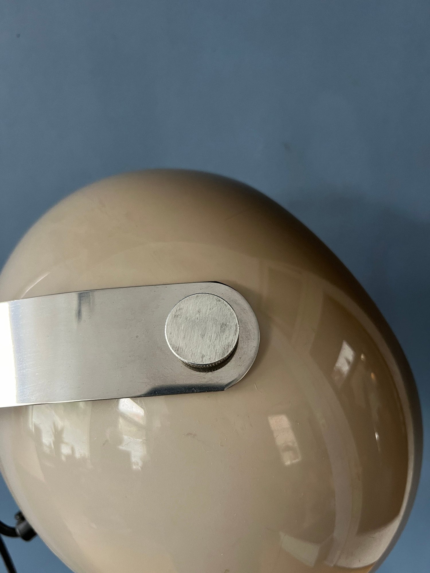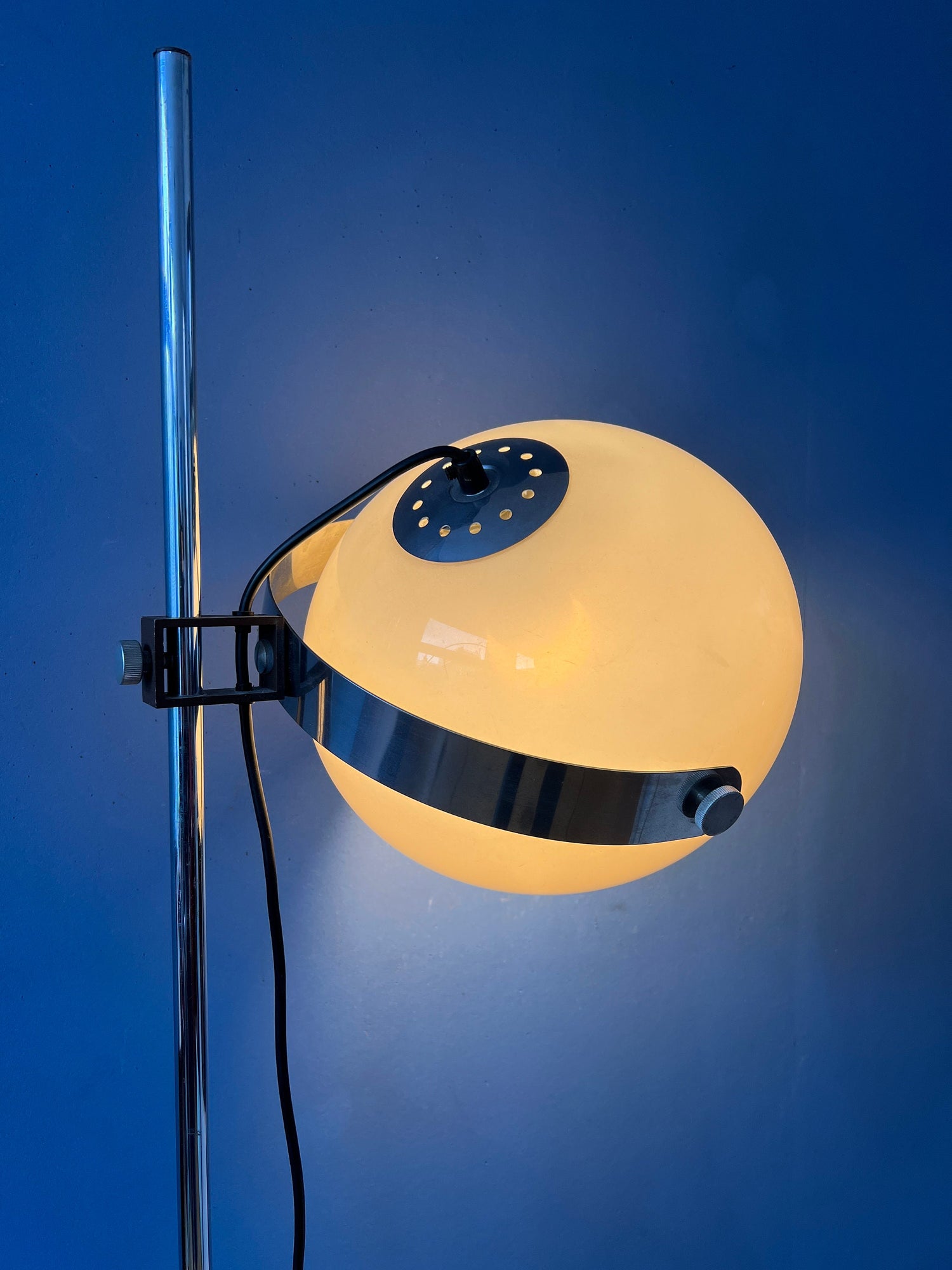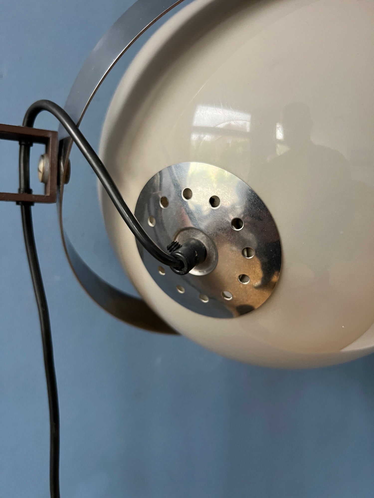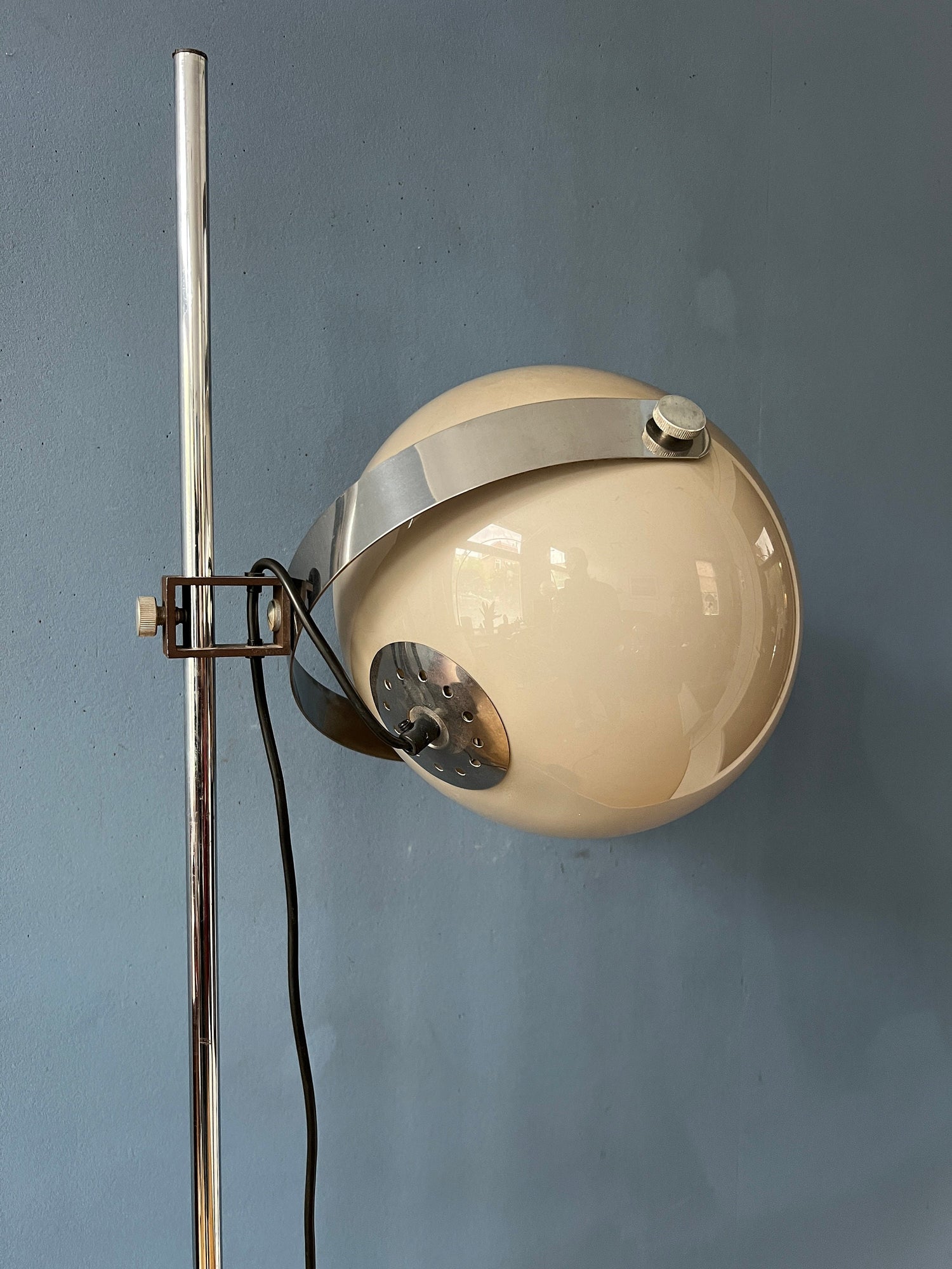 Dijkstra space age mushroom floor lamp with a beautiful glow. The mushroom shade can be turned in any direction and move up and down the base. The lamp requires one E27 lightbulb and currently has an EU-plug (works outside EU with plug-converter).