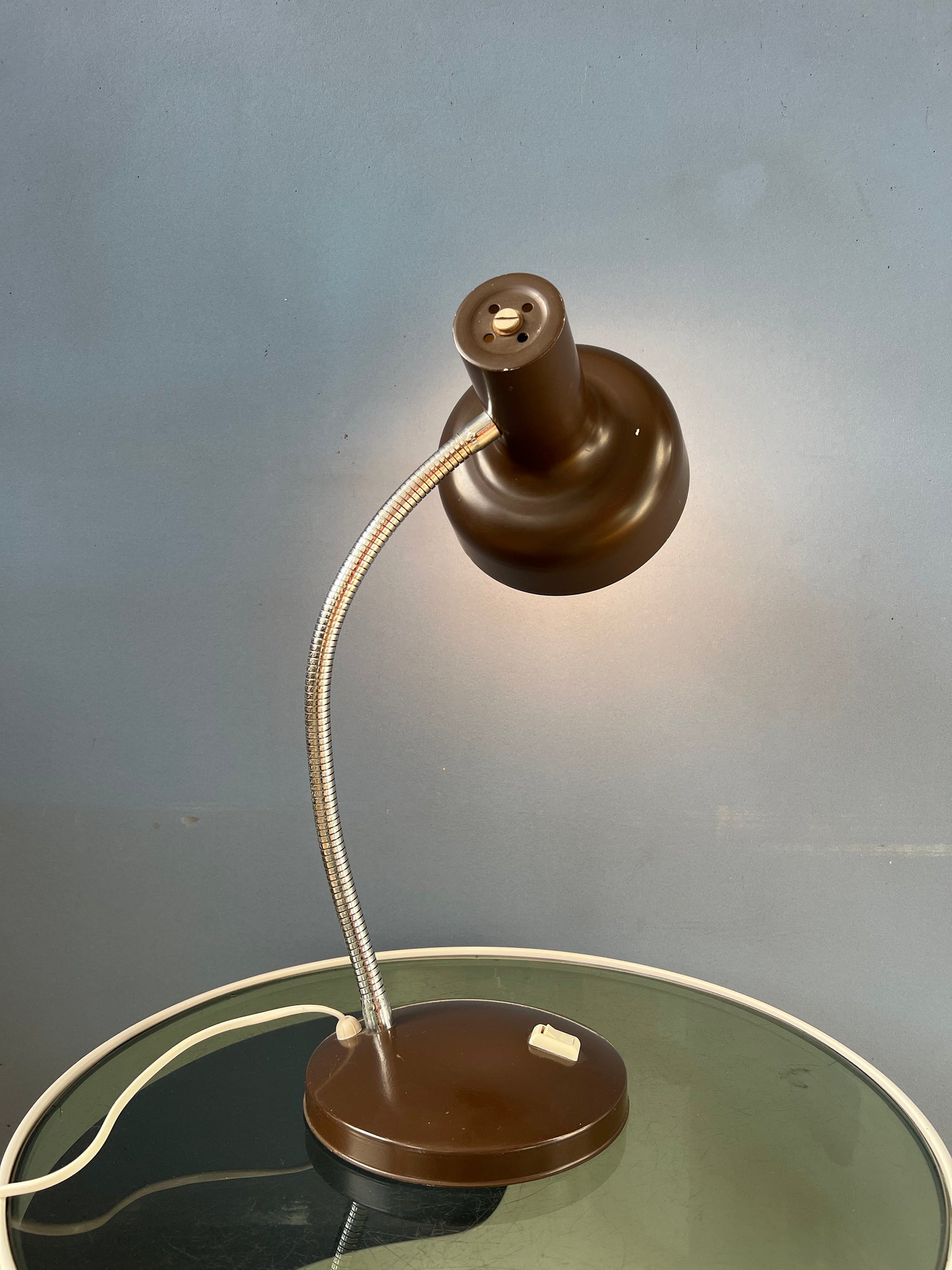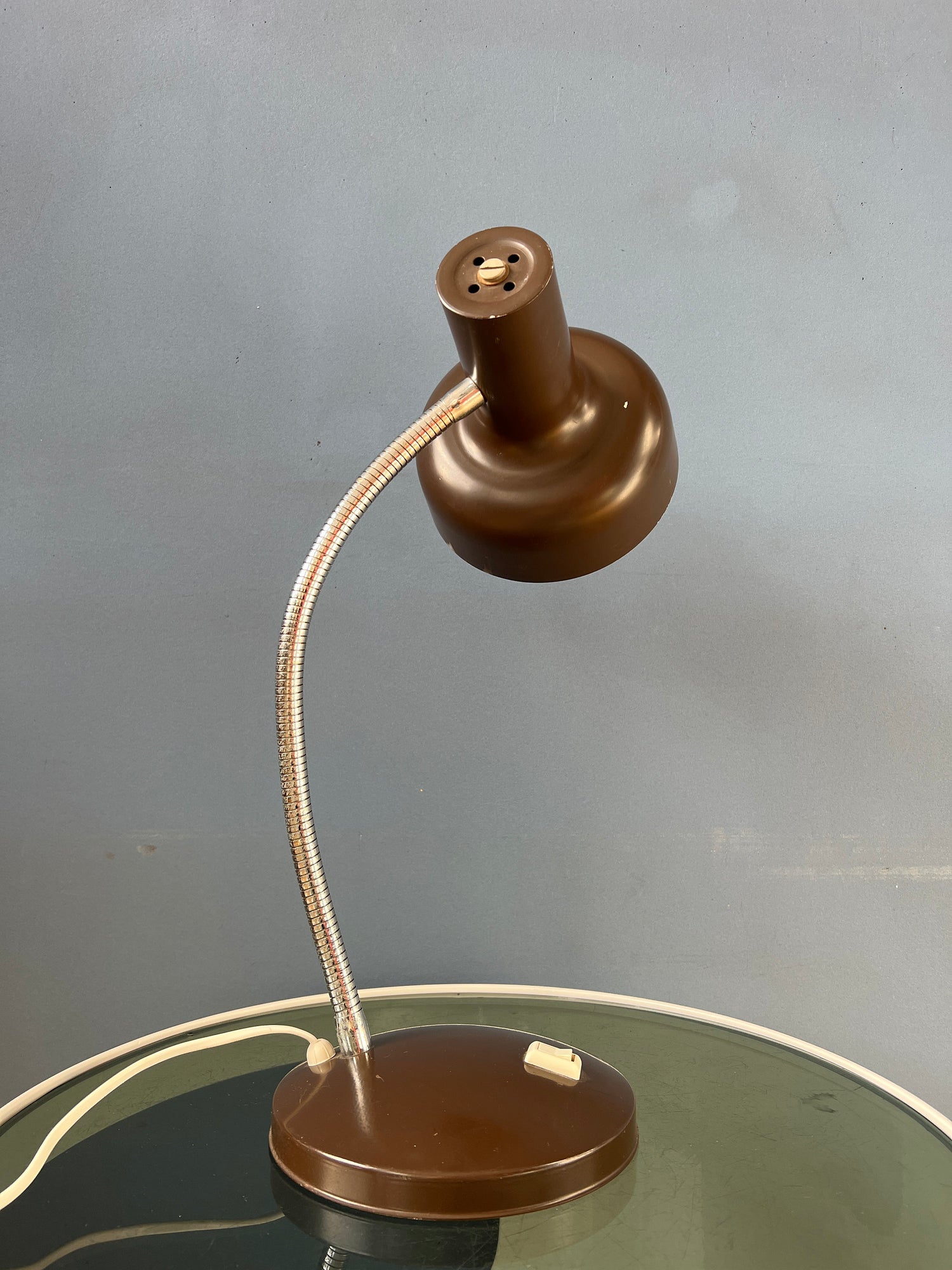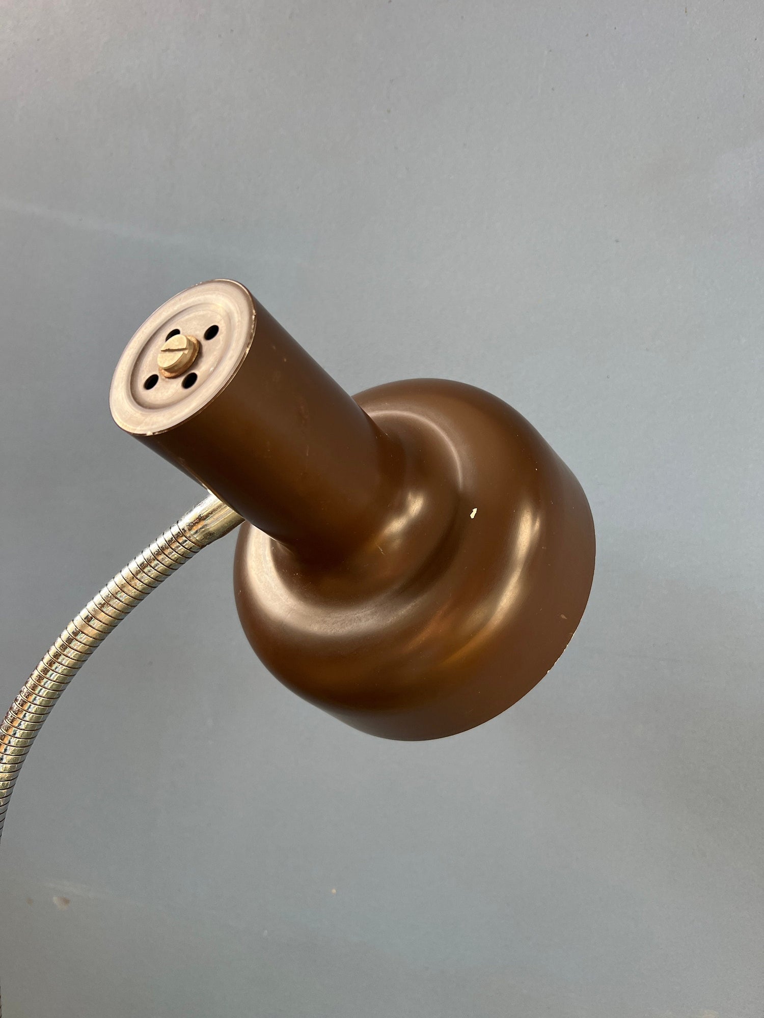 Vintage space age table lamp in brown colour with flexible arm. The arm and shade can be positioned in any way desirable. The lamp is made out of metal. The lamp requires one E27/26 (standard) lightbulb and currently has an EU plug.
