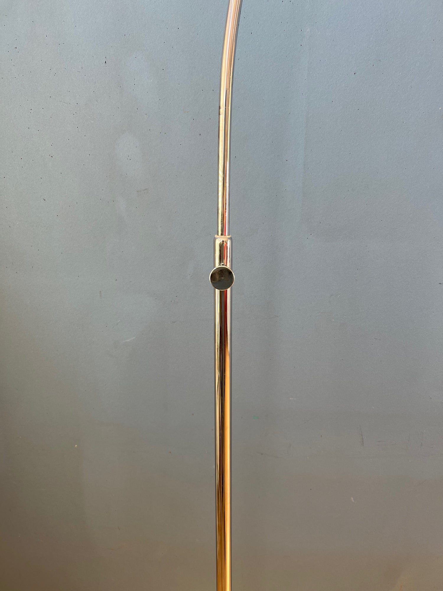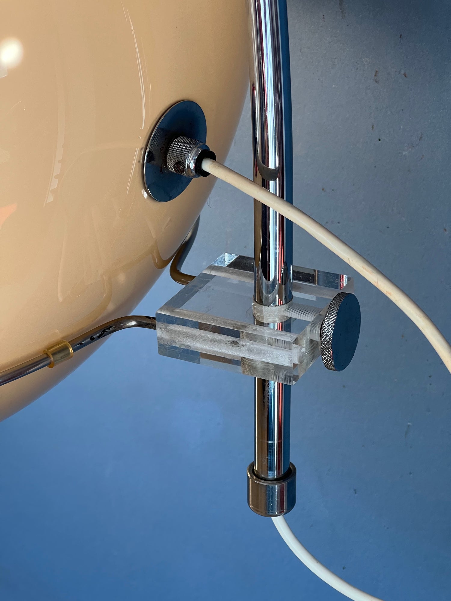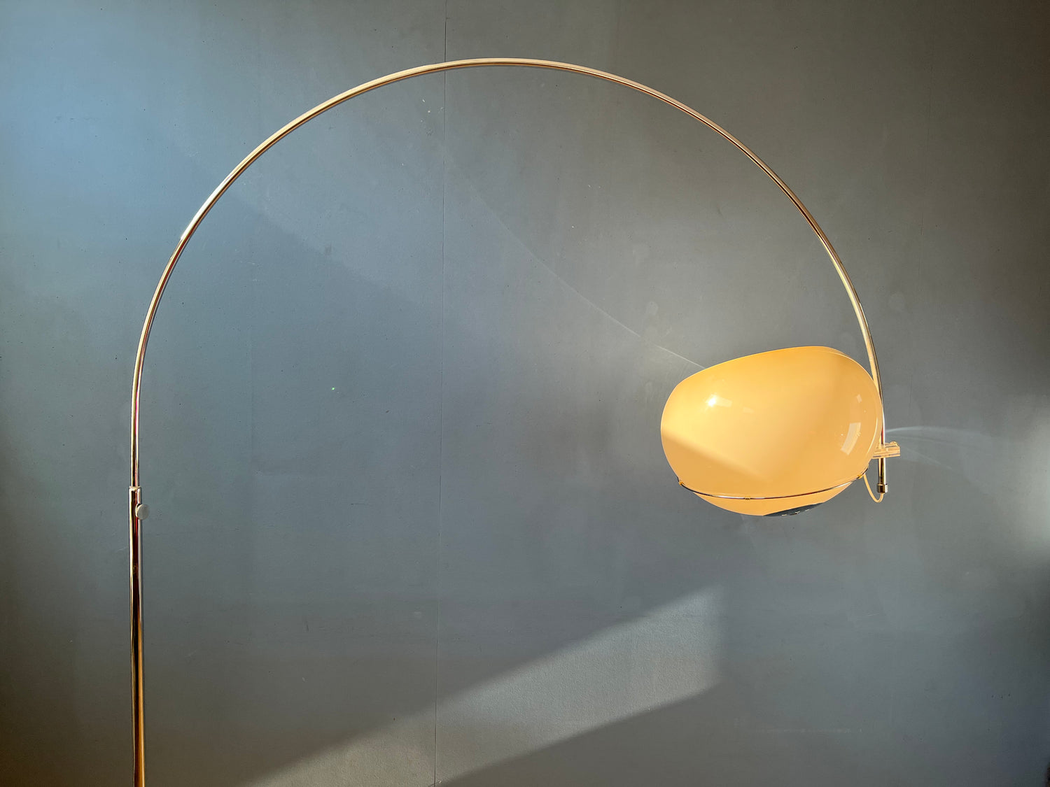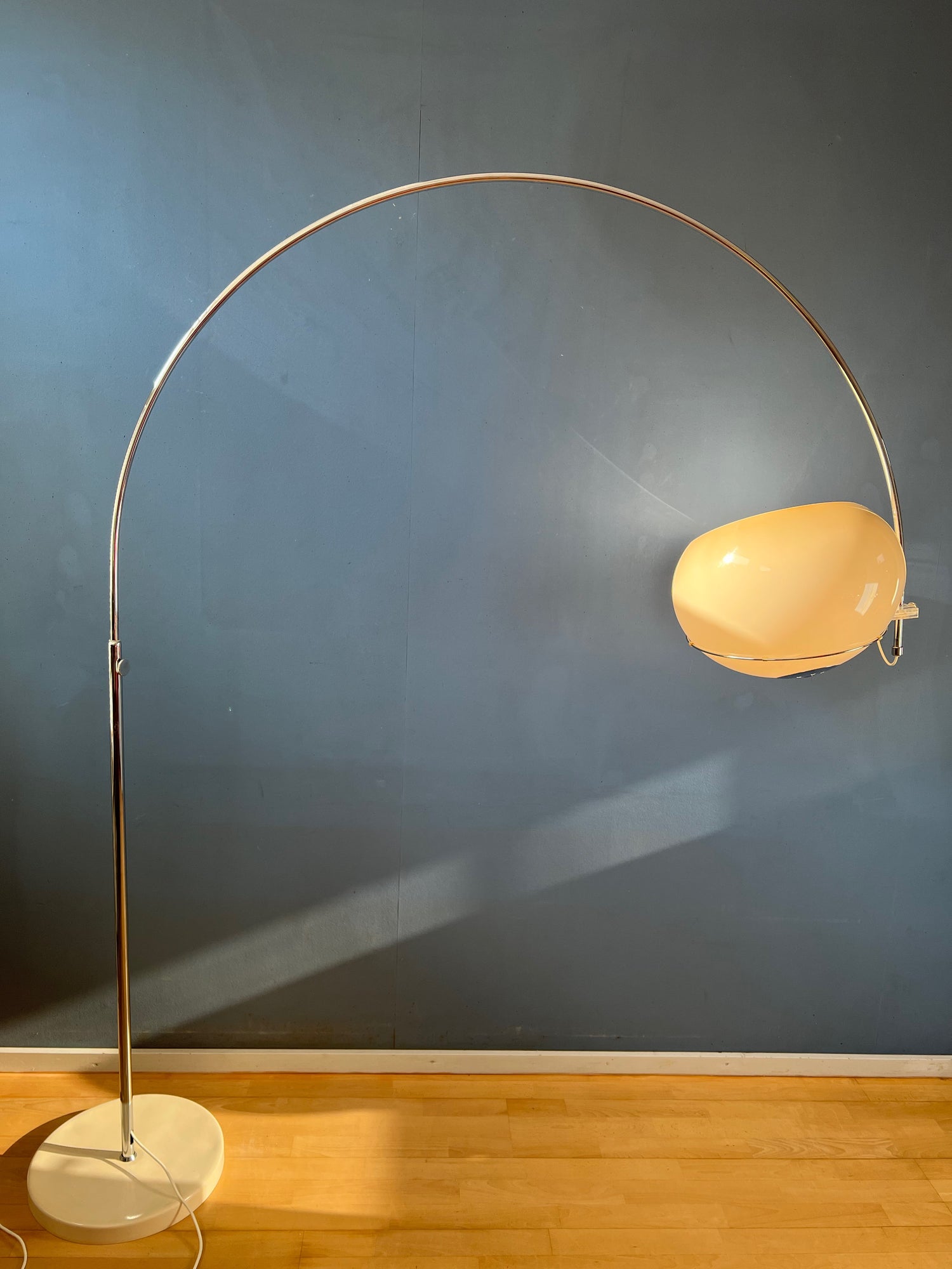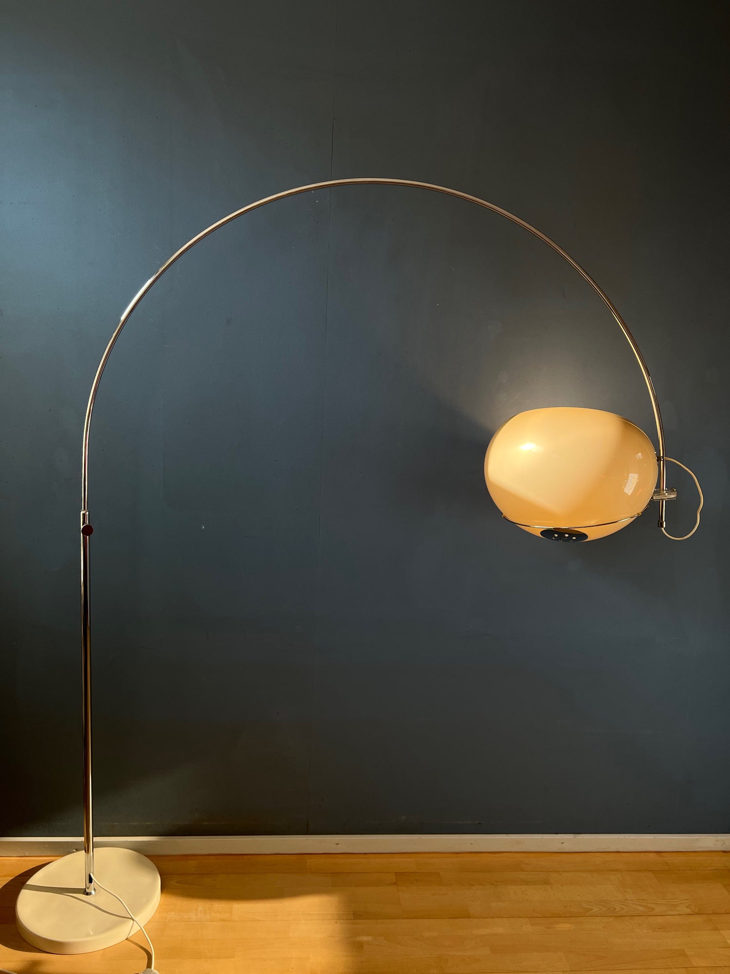 This GEPO arc floor lamp has an acrylic shade that produces a moon-like glow. It has a chrome frame that is an excellent, shiny condition and a beige base that has a delicate beige paint. The 'mushroom' shade can be placed in the metal ring in any way desirable (up, down, to the side). The arc goes into the pole of the base and can be easily swept from left or right.