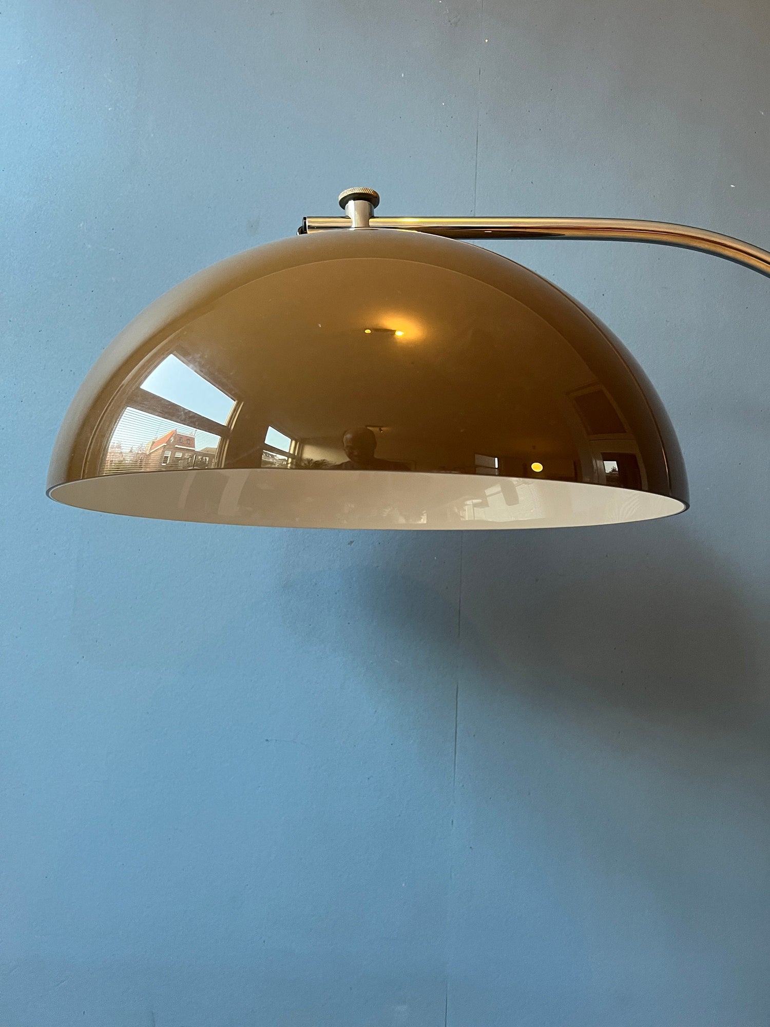 Very rare mushroom floor lamp by GEPO with flexible base. The shades produce a warm light and can be fixated at different points. The swing mechanism of the base allows you to position the lamp in any way desirable. Even the height of the lamp is adjustable. The lamp requires one E27/26 lightbulb and currently has a EU-plug.