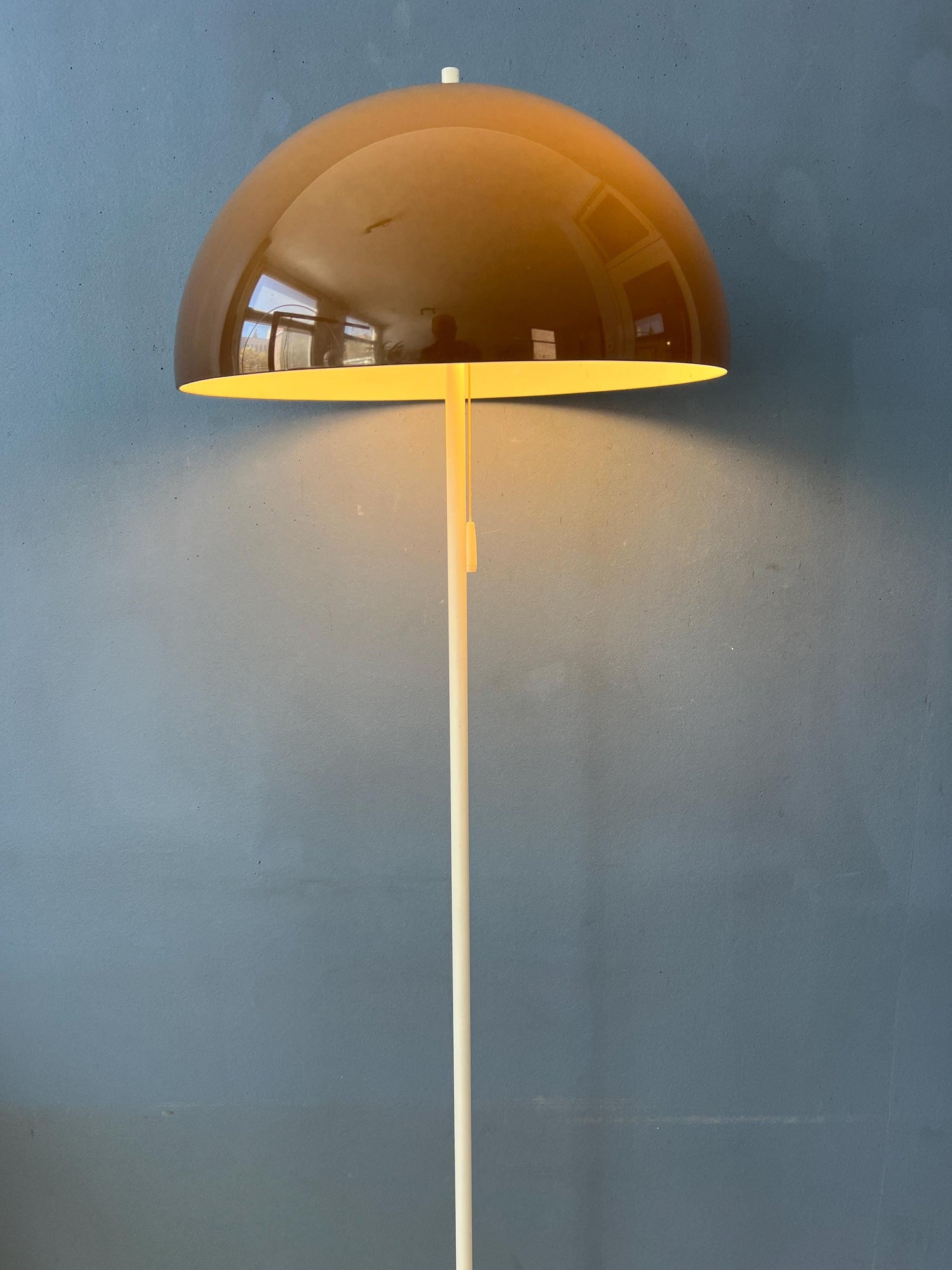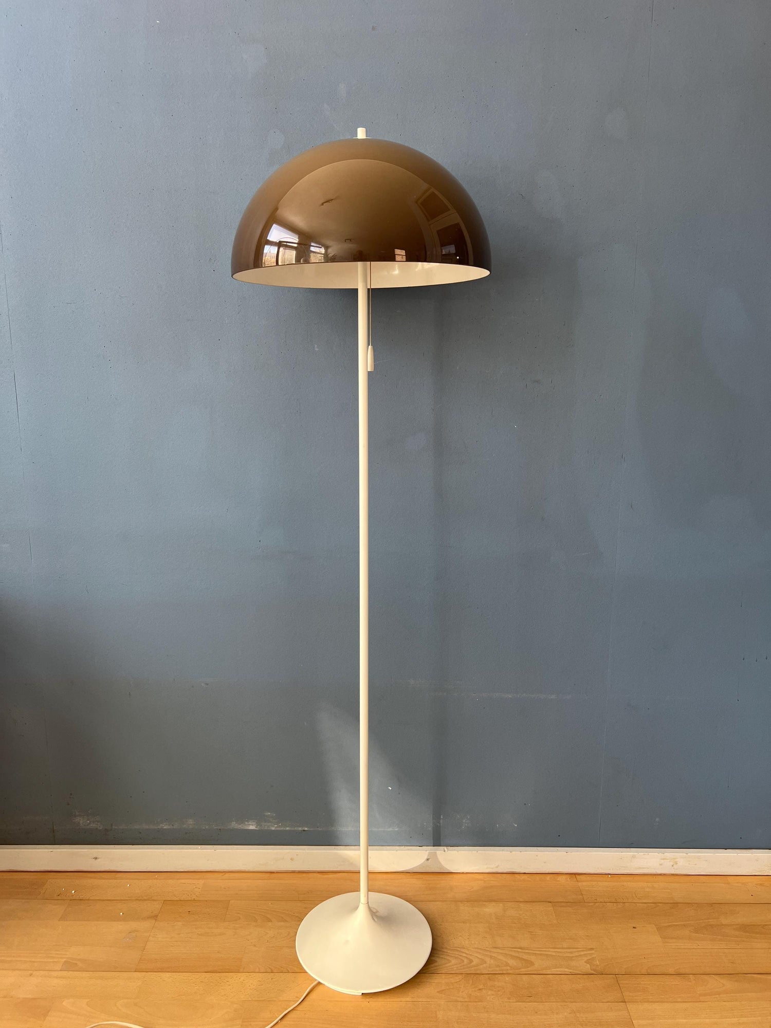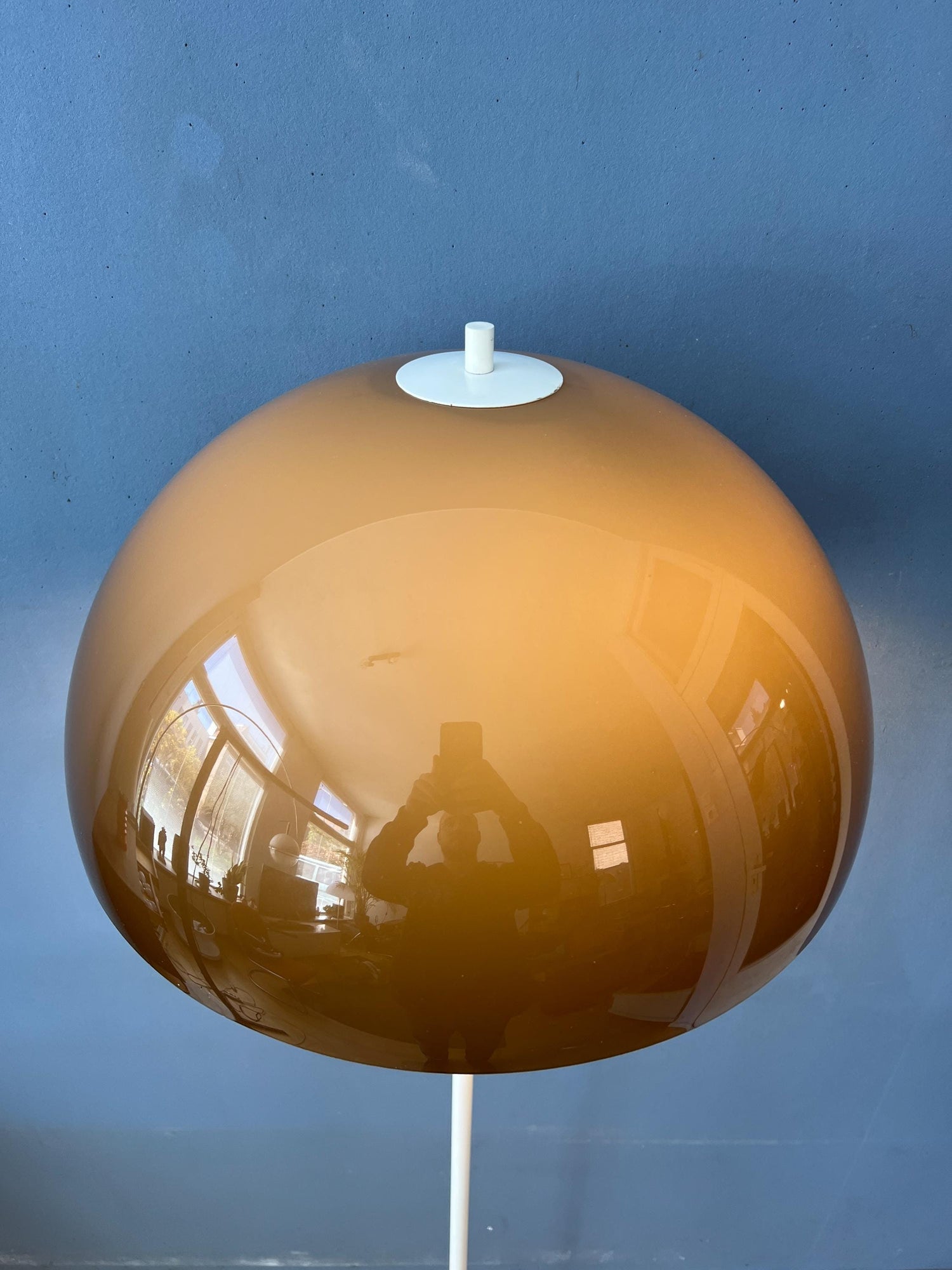 Astonishing space age floor lamp by GEPO with brown plexiglass mushroom shade. The acrylic shade has a fading effect, it gets darker towards the edge, creating a beautiful light effect. The piece has a white metal base. The lamp requires two E27/26 lightbulbs and currently has an EU-plug.