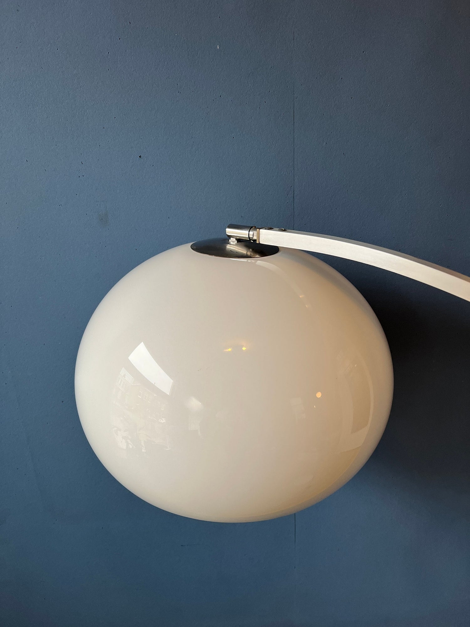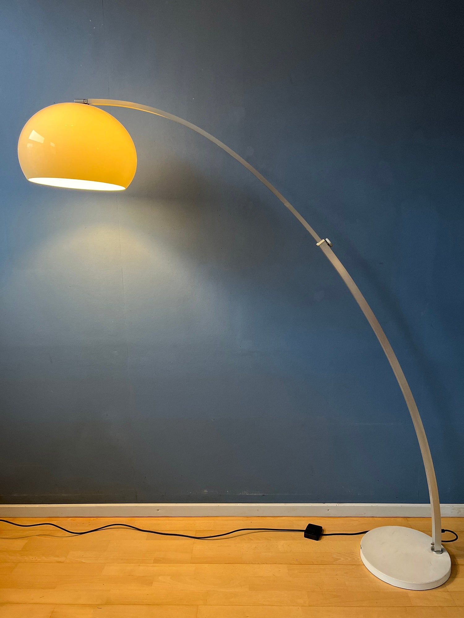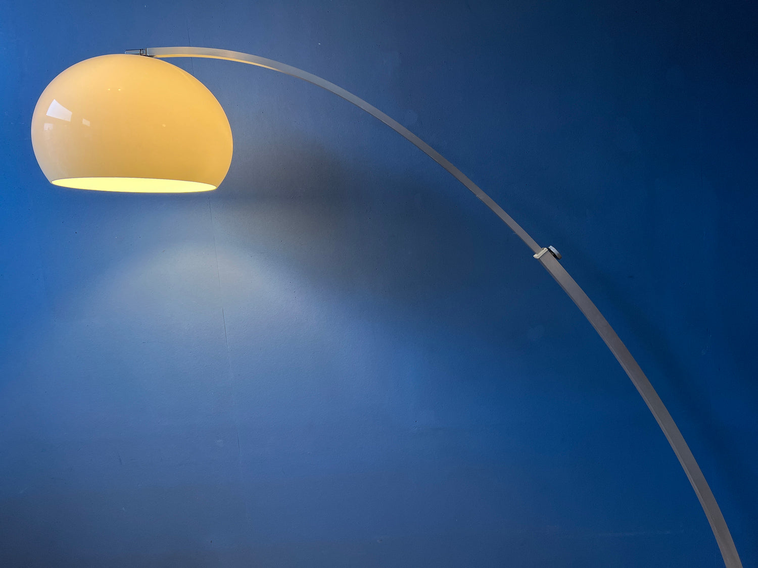 Rare space age arc floor lamp by GEPO with white mushroom shade. The acrylic glass mushroom shade produces a warm glow. The height/length of the lamp can be adjusted with its extendable arm. The lamp requires one E27 (standard) lightbulb and currently has an EU-plug.