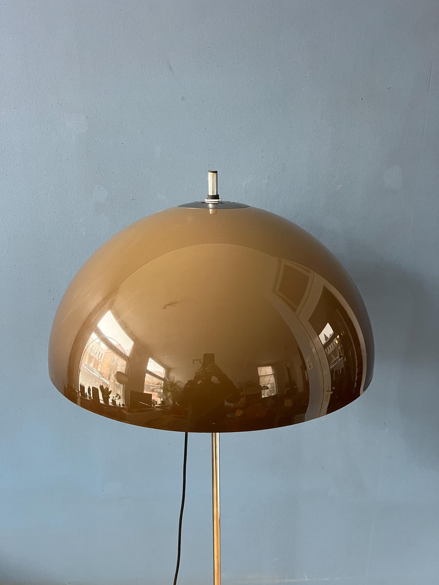 Very rare GEPO floor lamp by Gino Sarfatti with beautiful acrylic glass mocca-coloured shade. The plexiglass dome shade is thick and produces a warm light. The lamp requires two E27/26 lightbulbs and currently has an EU-plug.