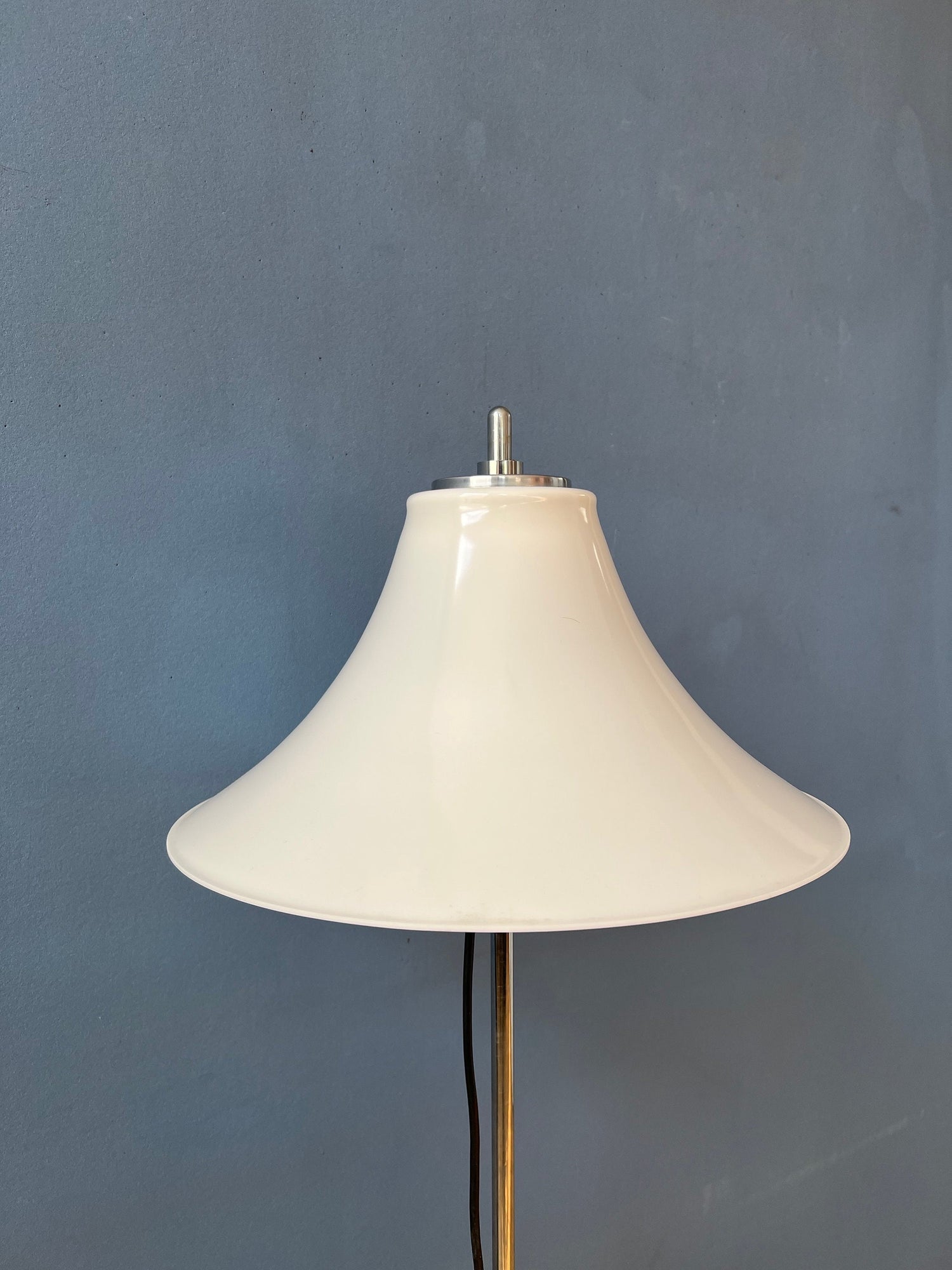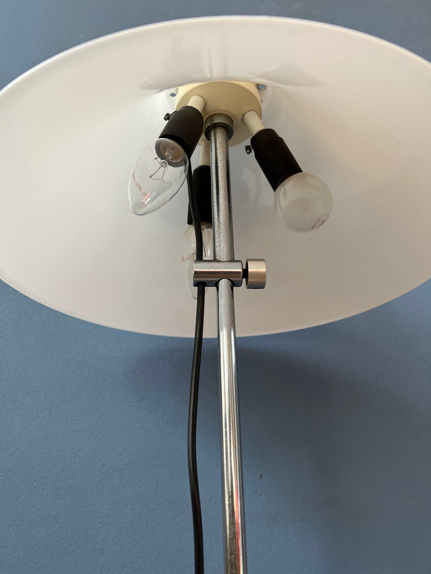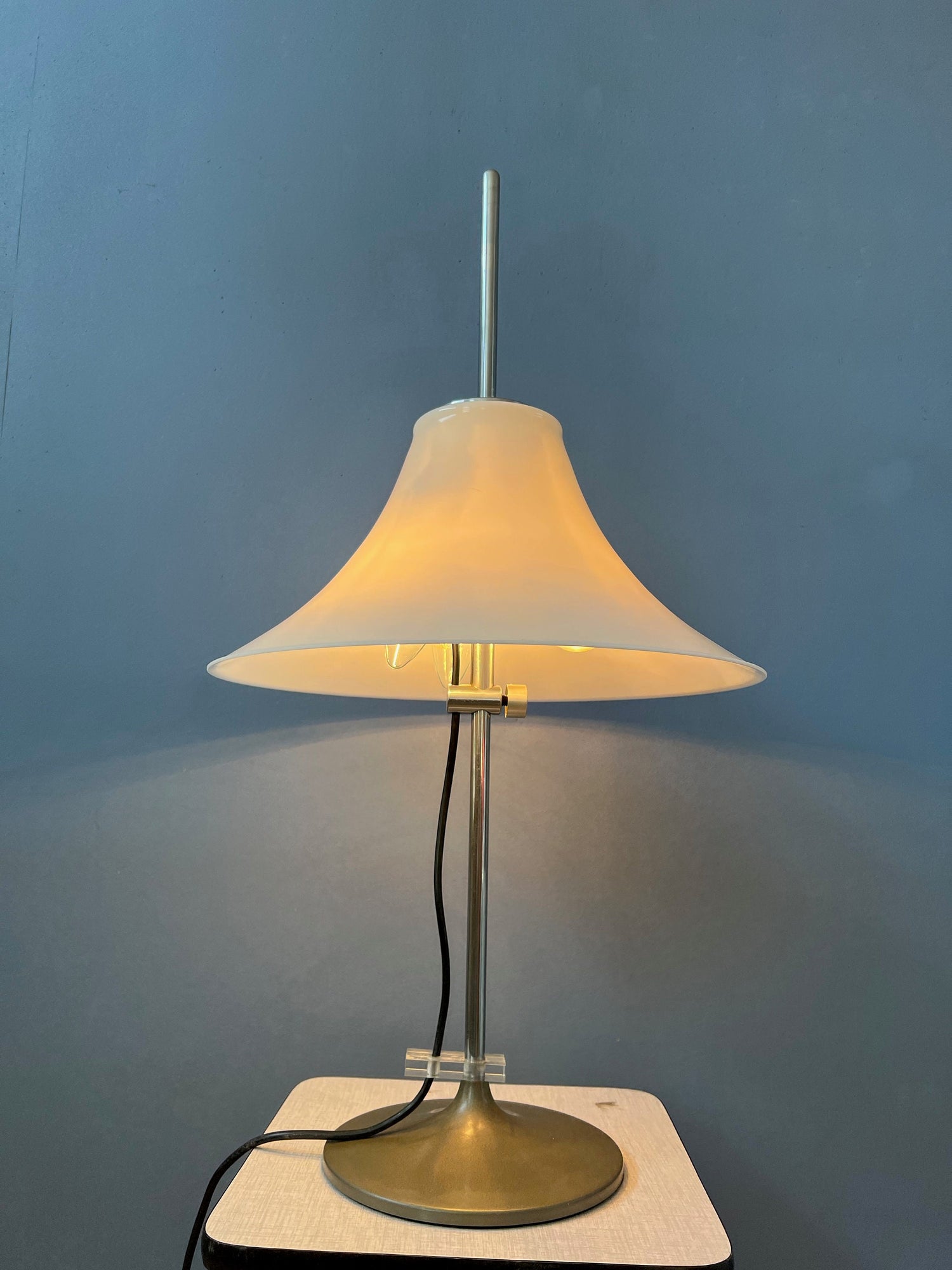 Very rare space age GEPO table lamp with white acryllic shade. The shade can be easily moved up and down the base. The lamp requires two E27 lightbulbs and currently has a EU-plug.