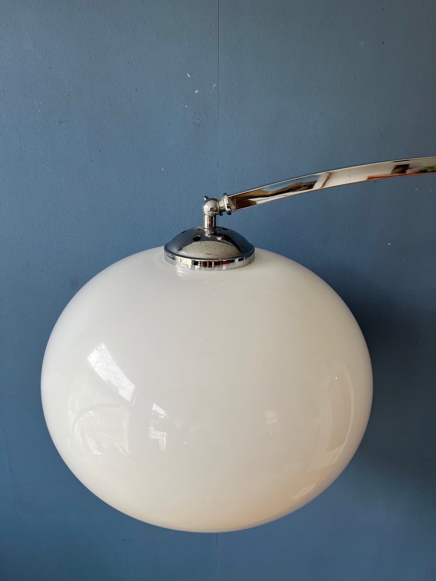Very rare Italian arc floor lamp with mushroom shade attributed to Goffredo Reggiani The white shade produces a delicate, warm glow. The height/length of the lamp can be adjusted with its extendable arm. The lamp requires one E26/27 (standard) lightbulb and currently has an EU-plug.
