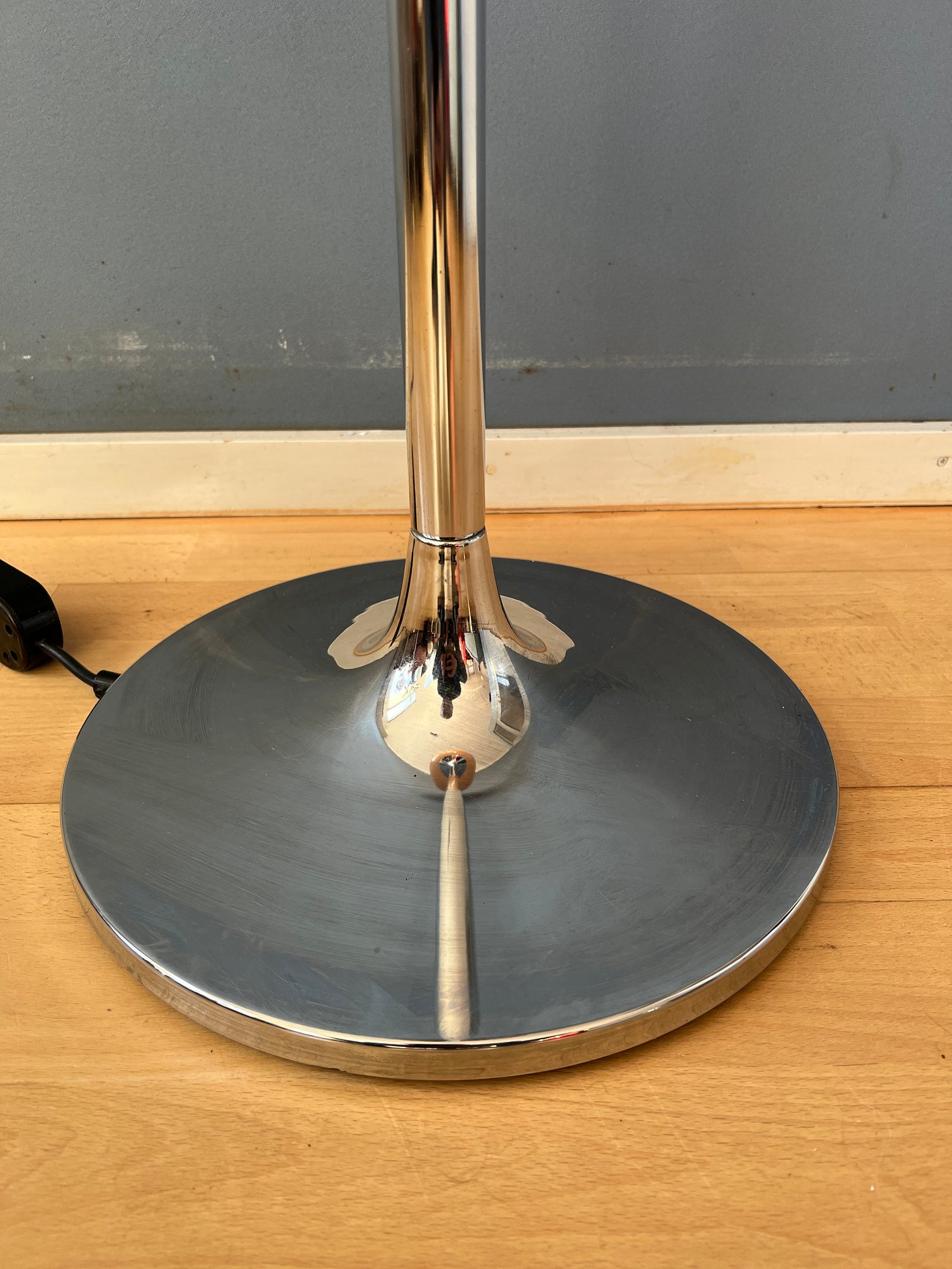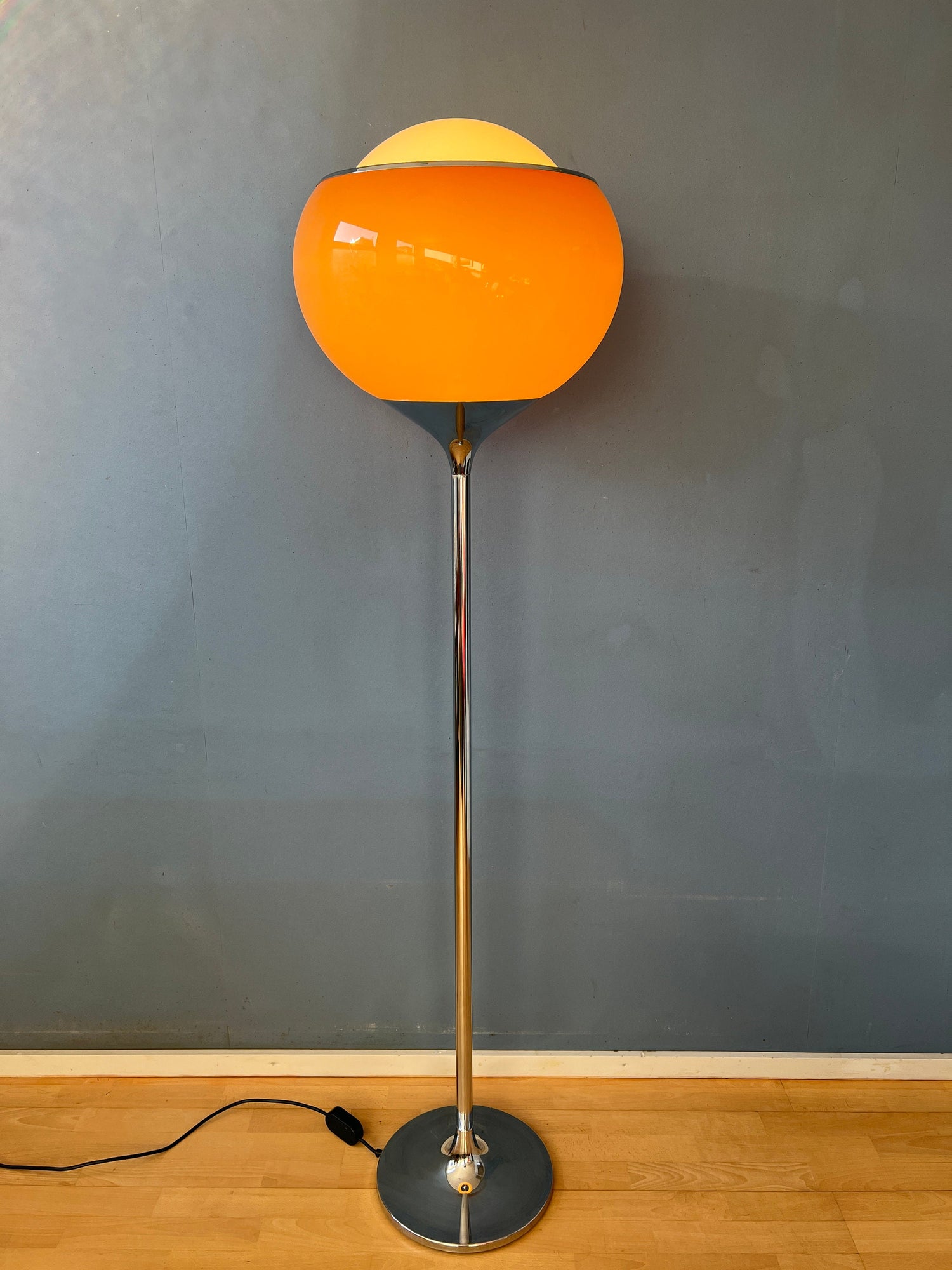 Guzzini 'Flash' or 'Bud Grande' orange/pink space age floor lamp. This iconic lamp creates a beautifully orange-like glow and has an elegant chrome base. The lamp requires one E27 lightbulb and currently has an EU-plug (can easily be used outside EU with a plug-converter).