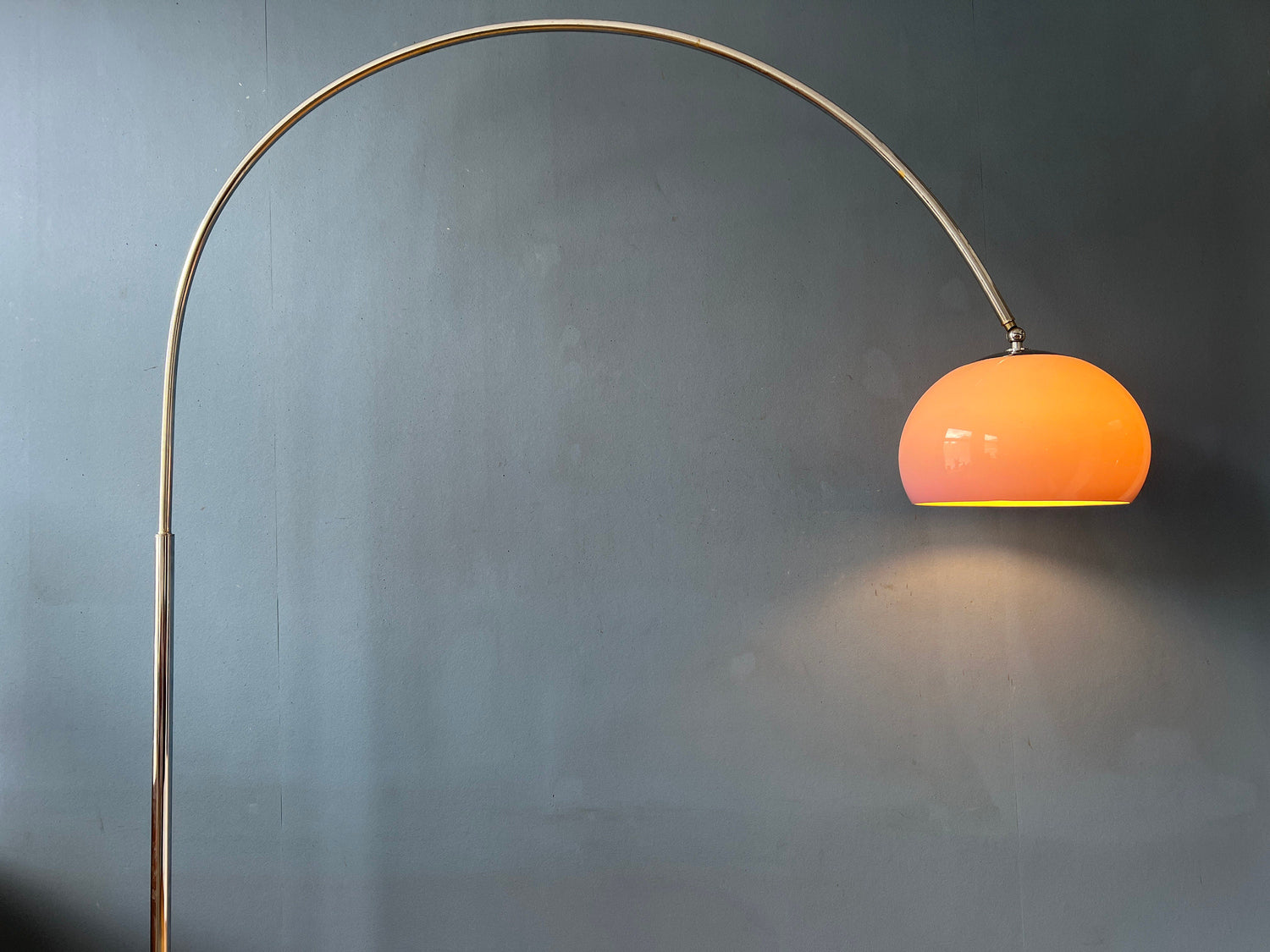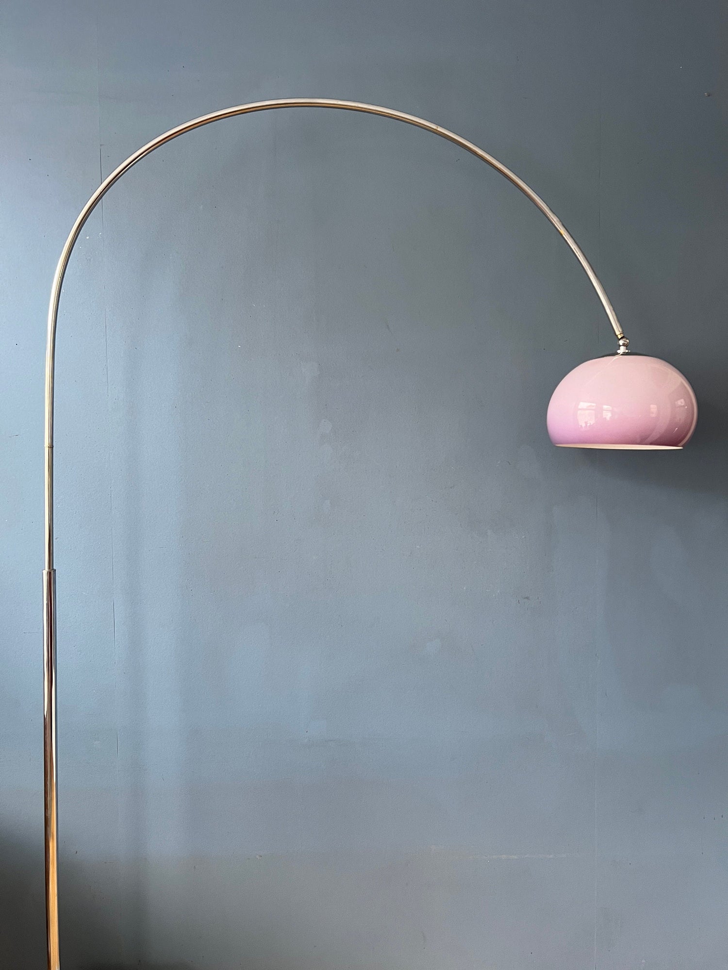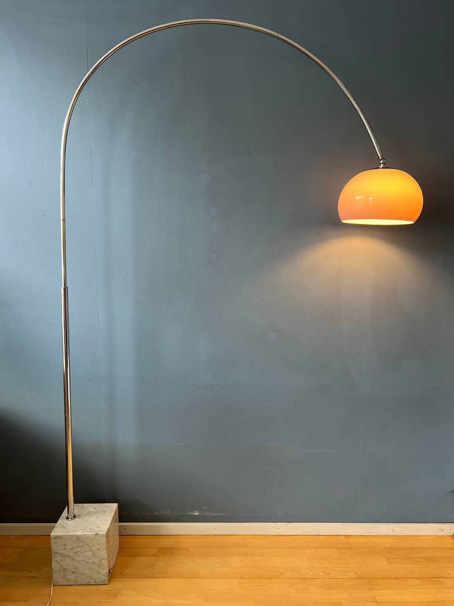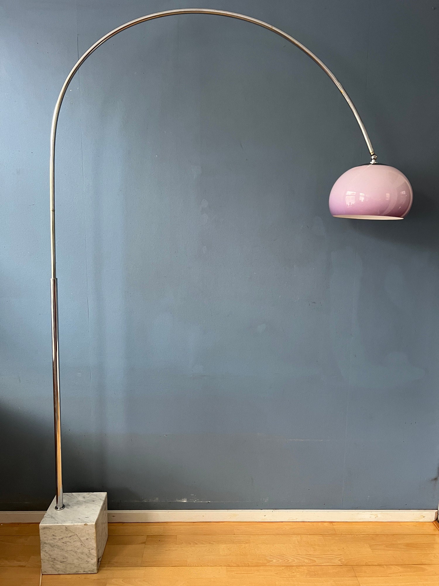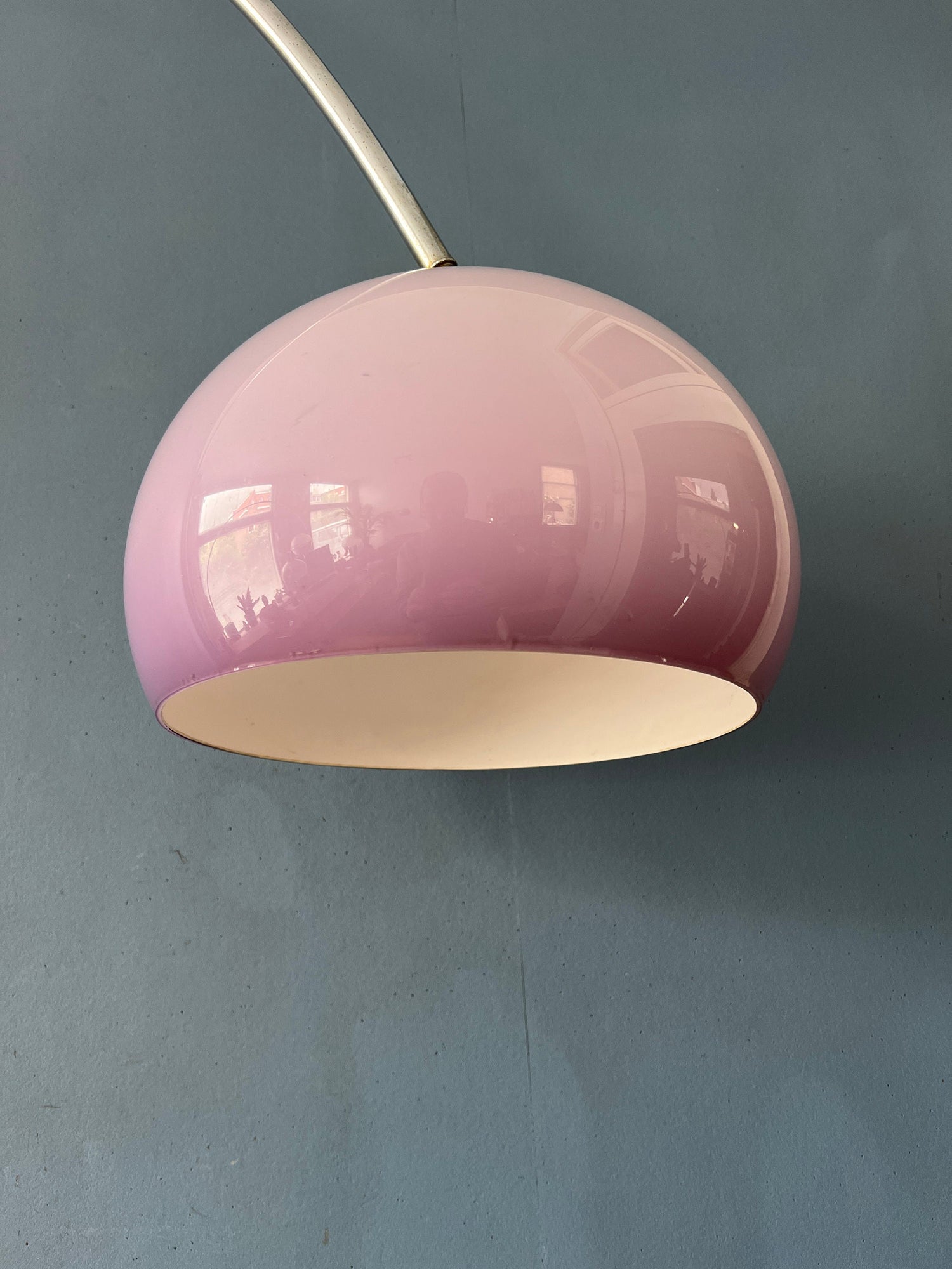 Mid century arc floor lamp by Guzzini with purple-ish mushroom shade and marble base. The purple acrylic glass shade produces a special glow. The height of the arc can easily be adjusted. The lamp requires one E26/27 (standard) lightbulb and currently has an EU-plug (we include plug-converters in our packages).
