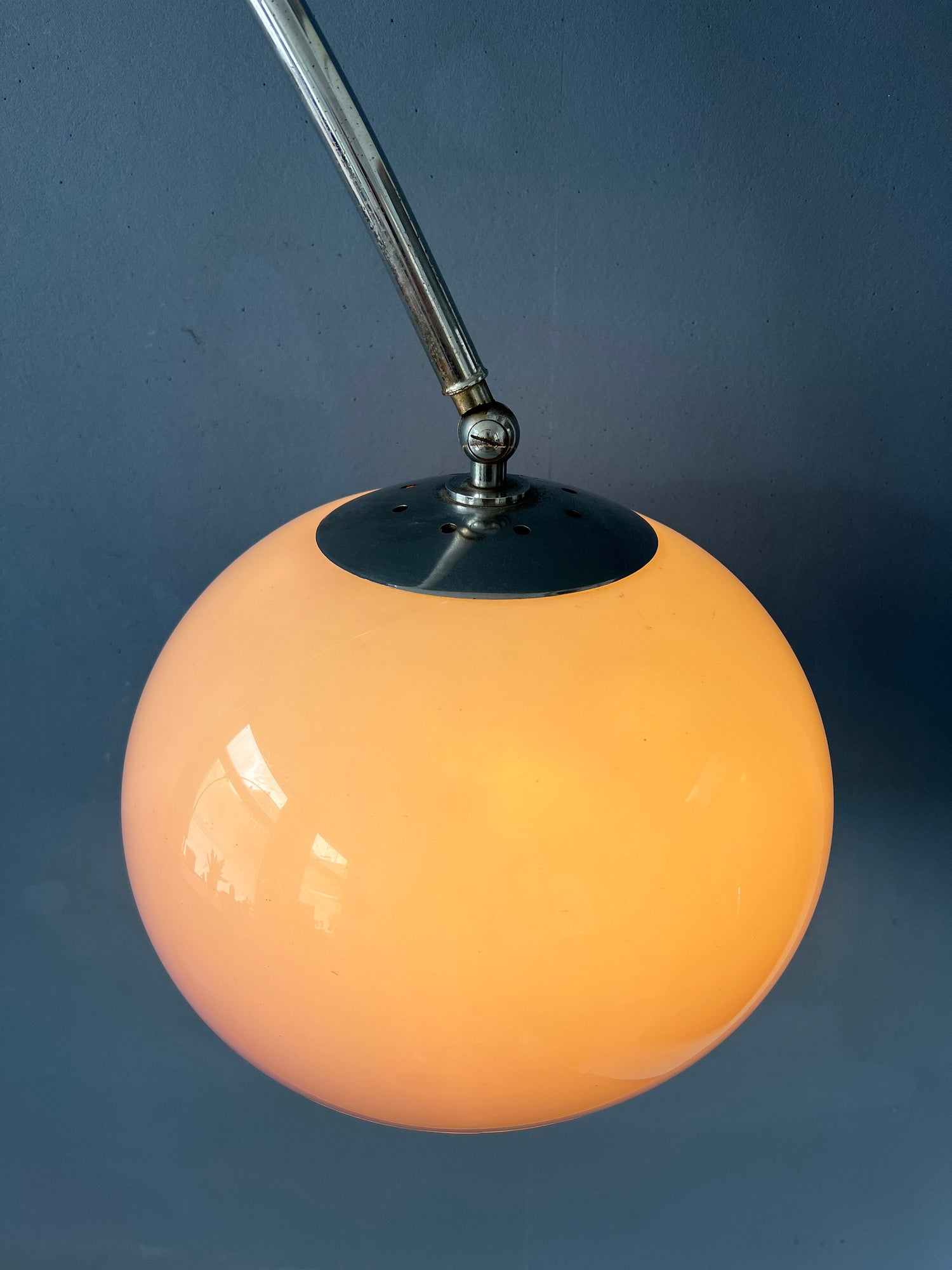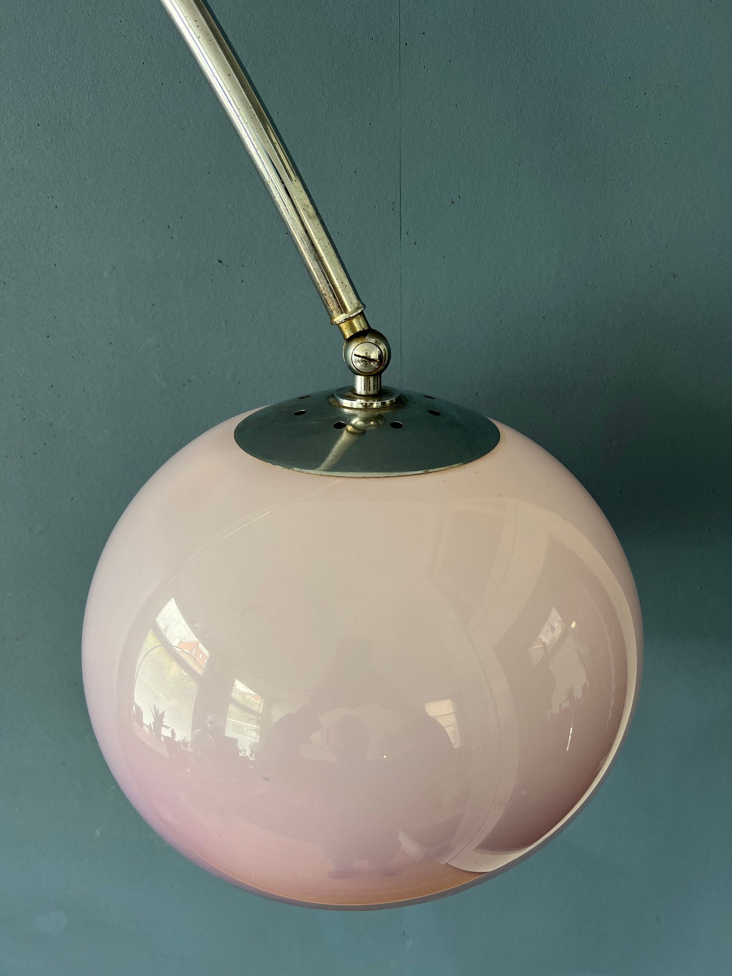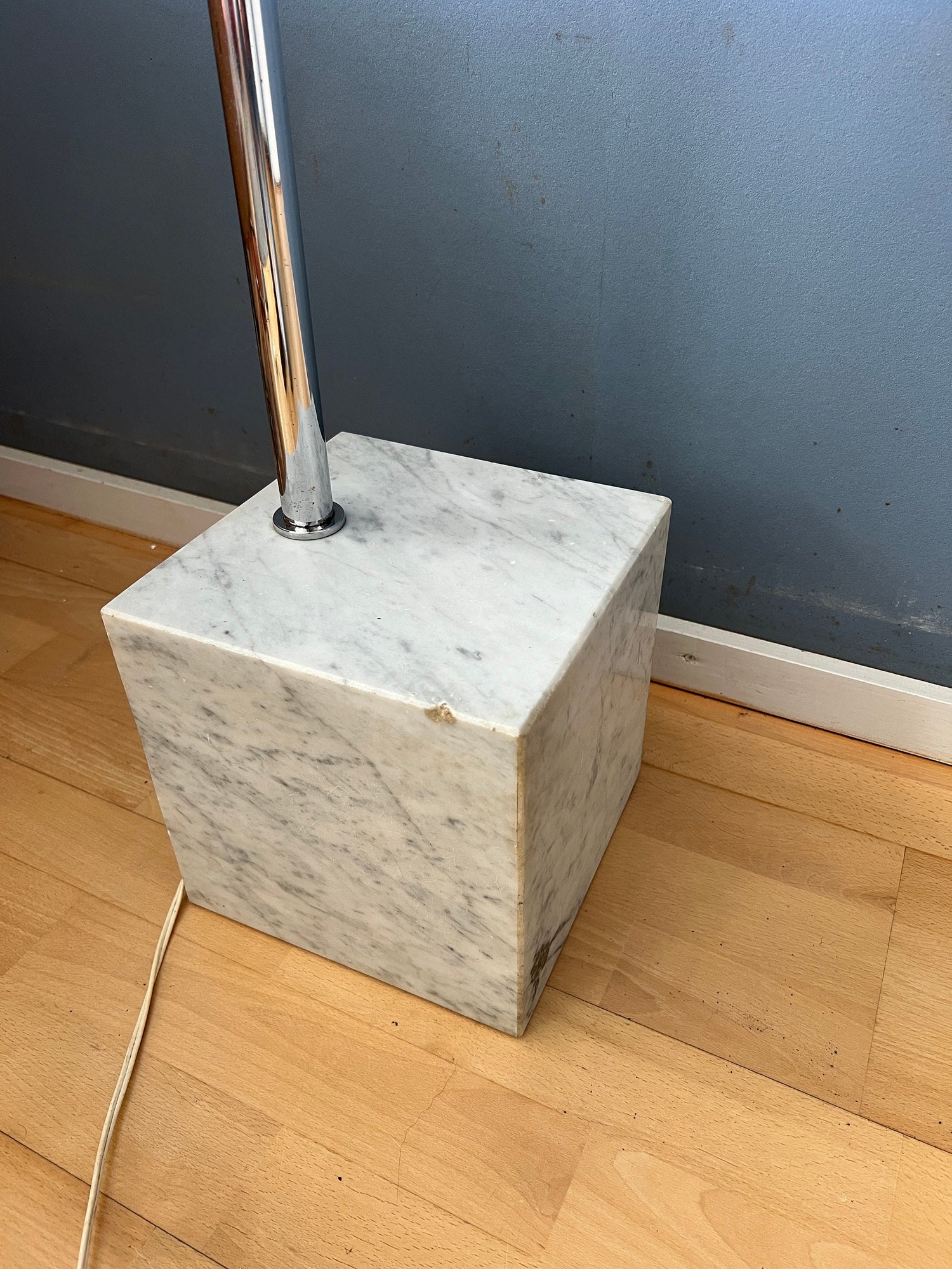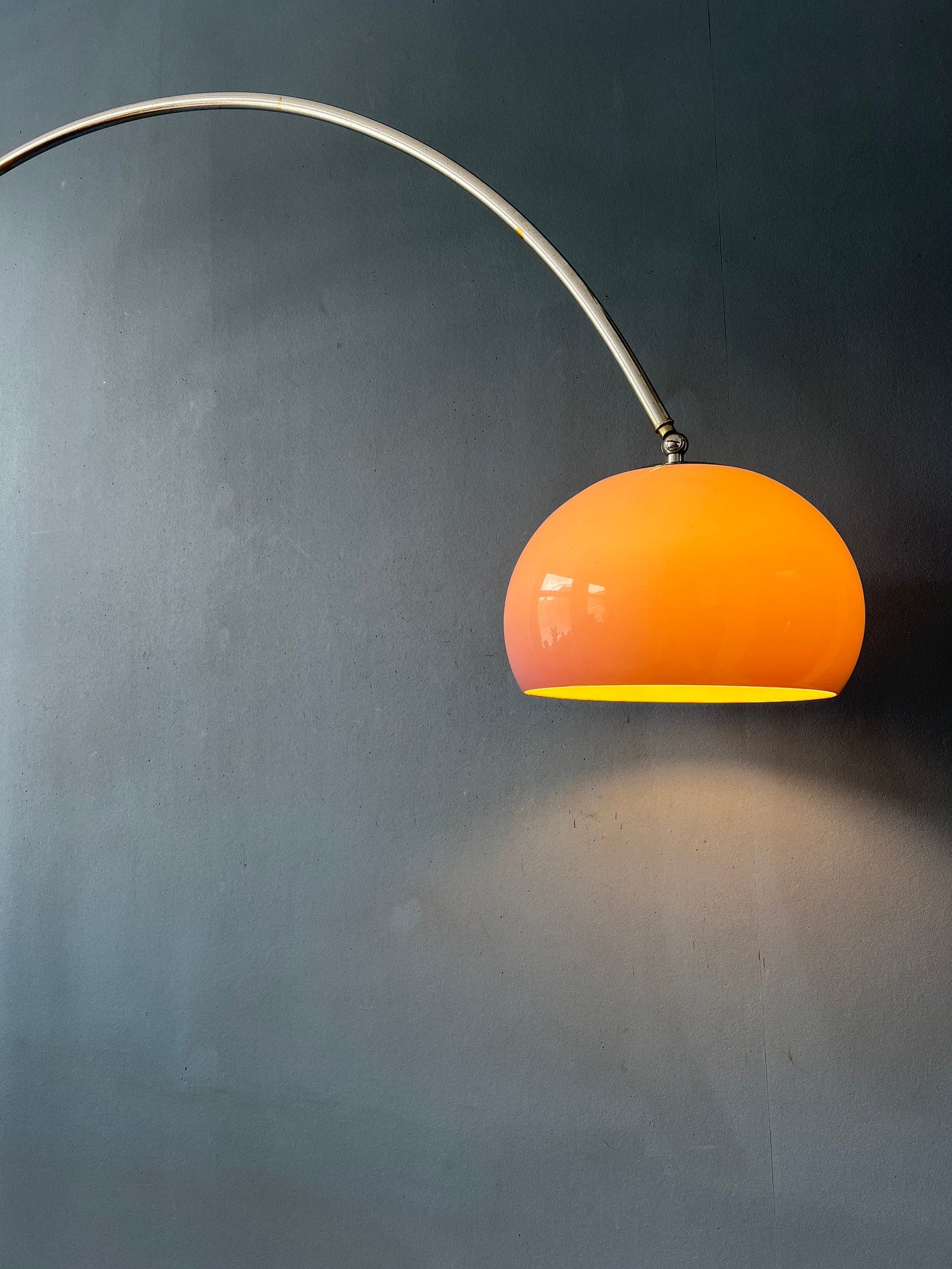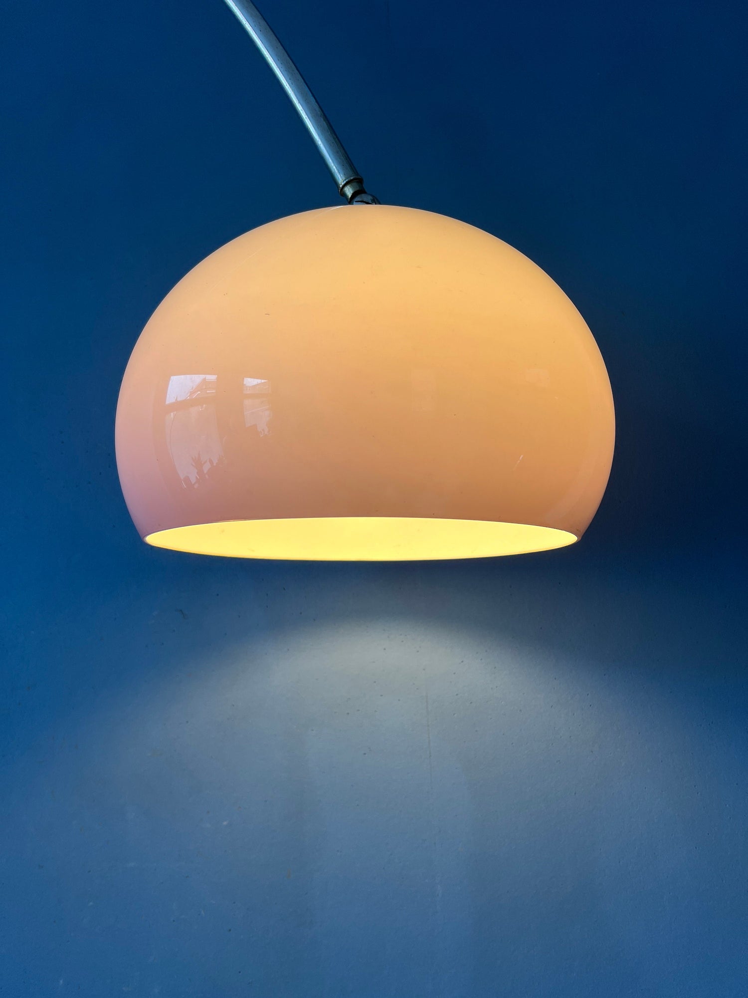 Mid century arc floor lamp by Guzzini with purple-ish mushroom shade and marble base. The purple acrylic glass shade produces a special glow. The height of the arc can easily be adjusted. The lamp requires one E26/27 (standard) lightbulb and currently has an EU-plug (we include plug-converters in our packages).