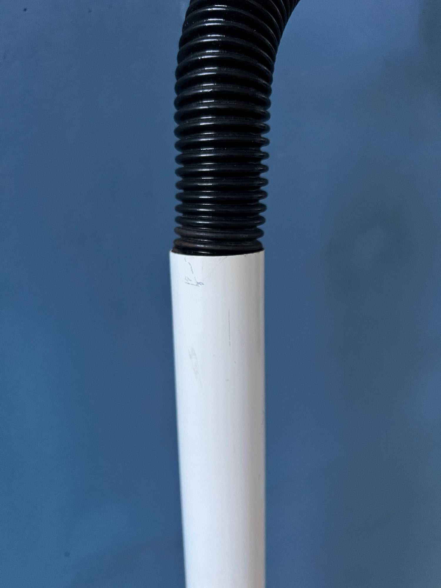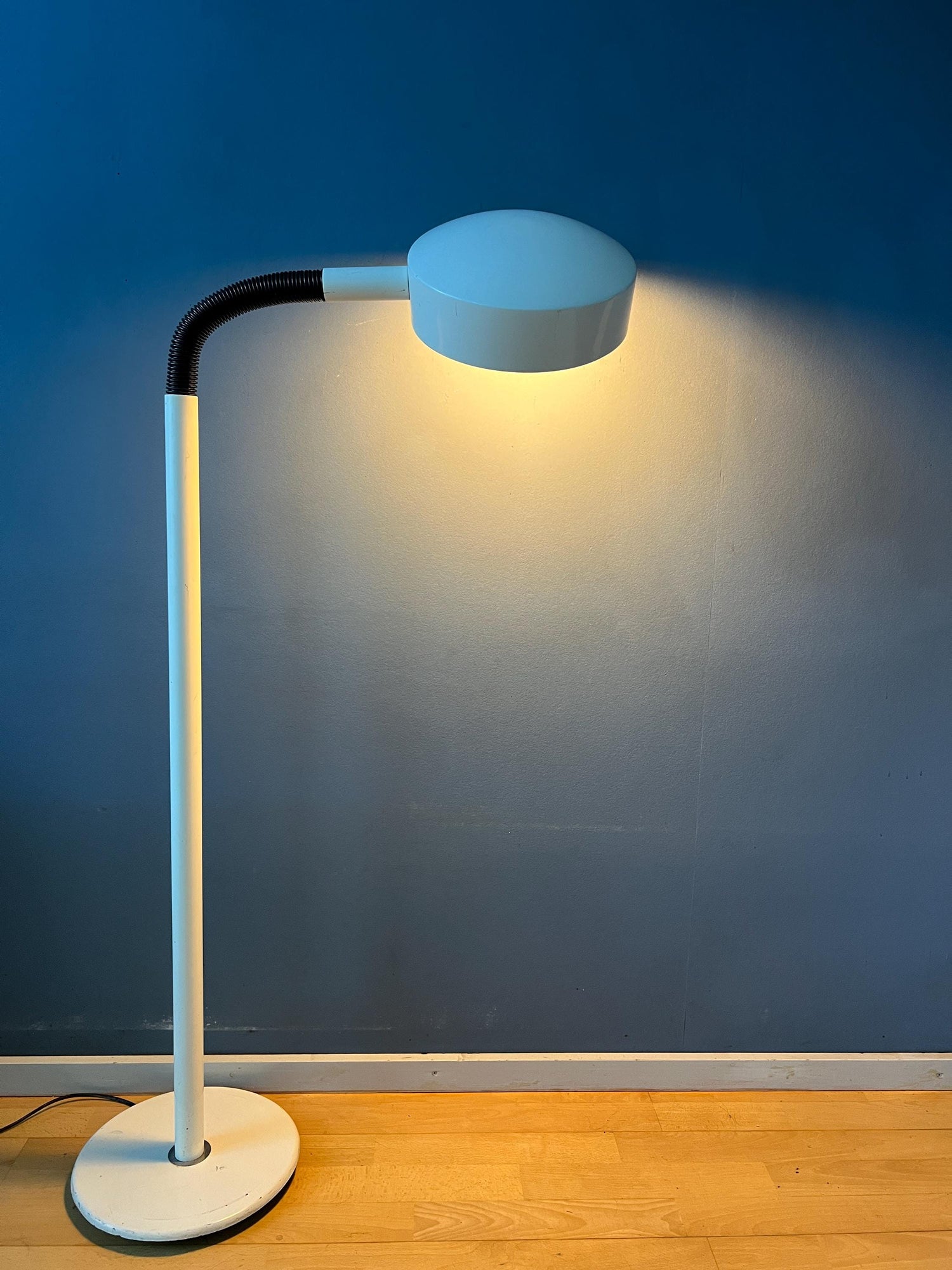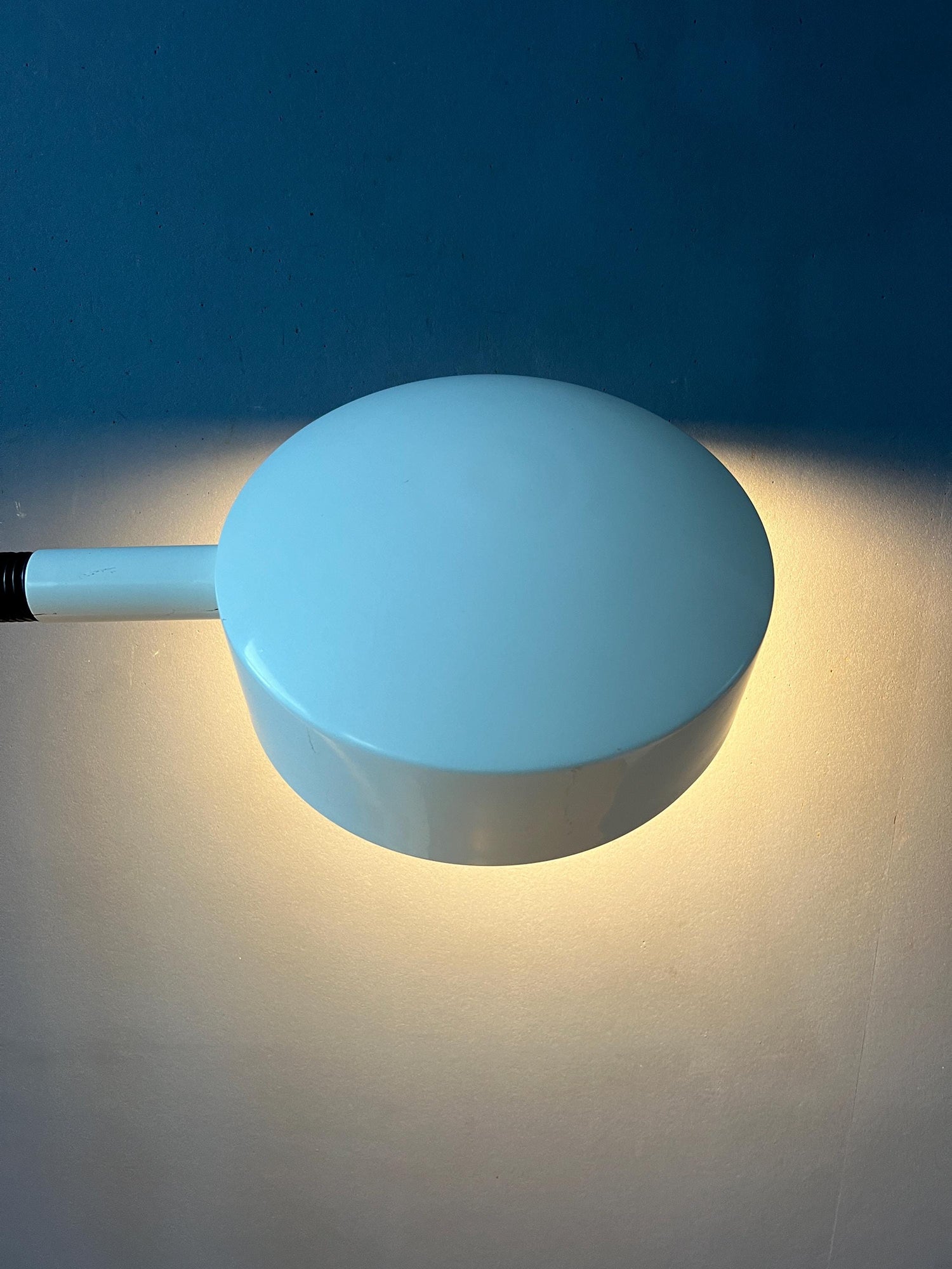 Rare white space age floor lamp by Hala. The UFO shade can easily be adjusted with its movable arm. The piece is made out of metal except for the black tube covering the adjustable arm. The lamp requires one E27 lightbulb and currently has an EU-plug.
